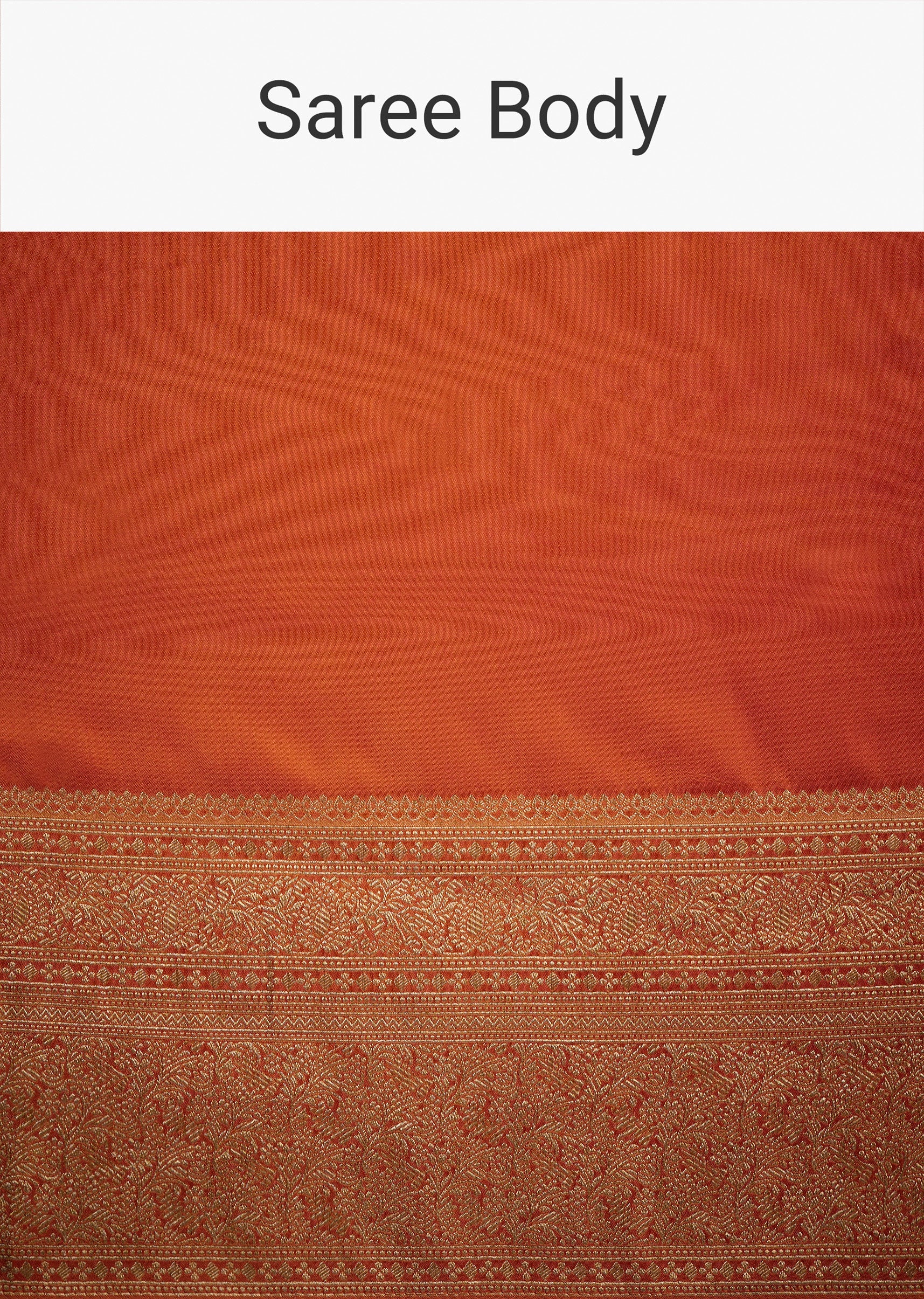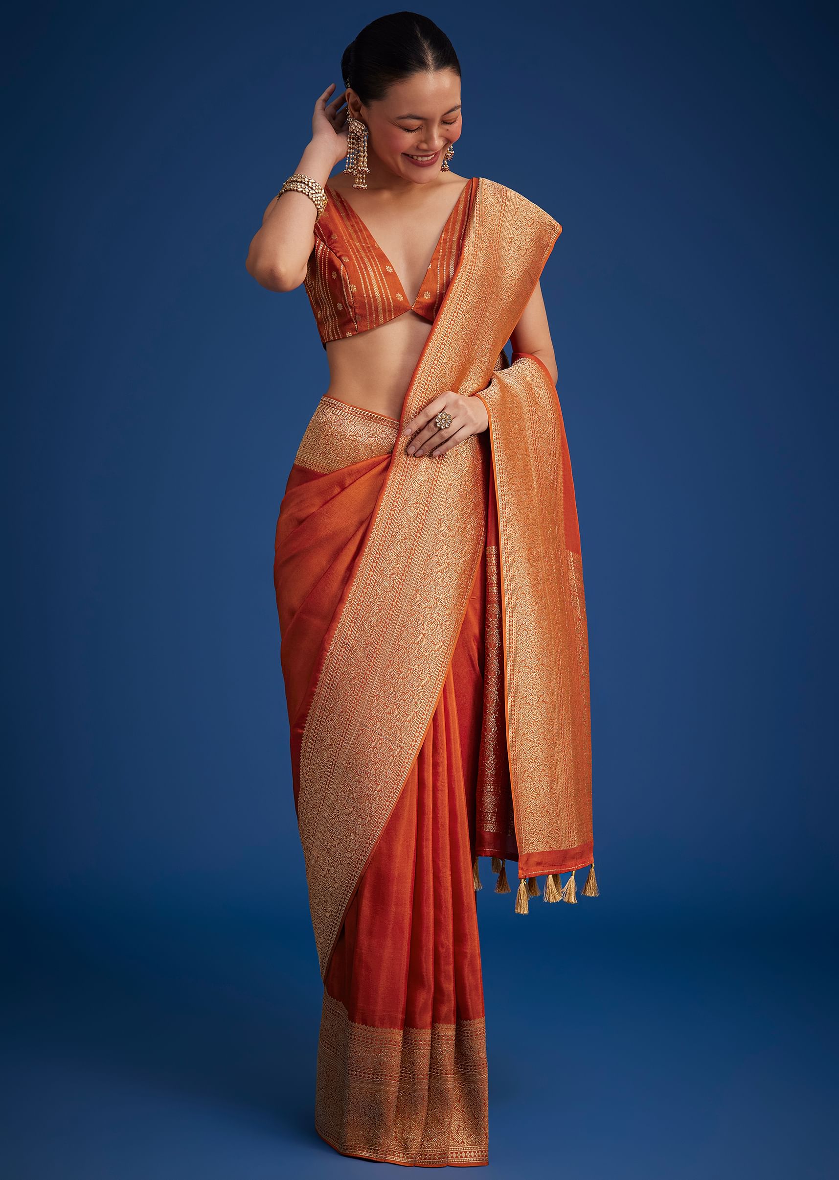 - Exude grace with this orange Dola silk saree, showcasing a rich zari woven border and intricately designed pallu.