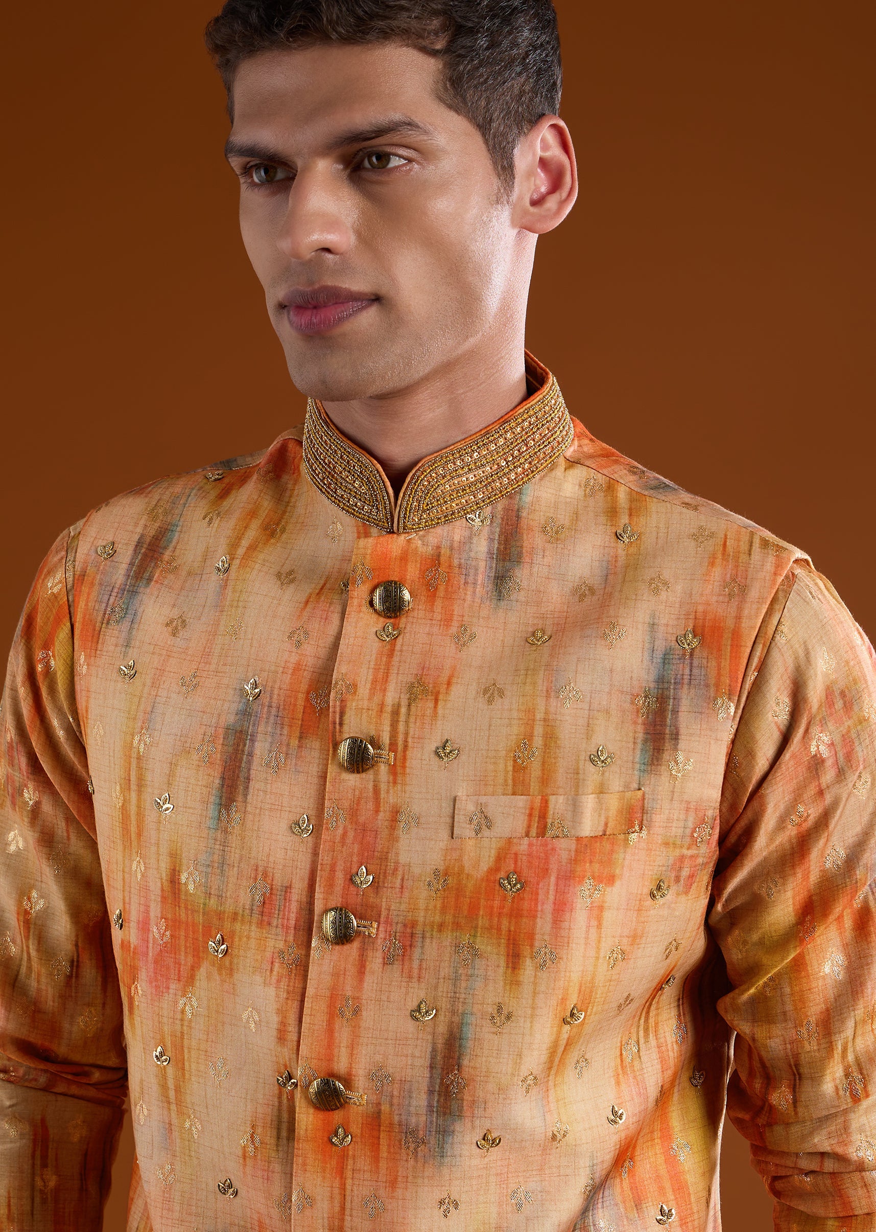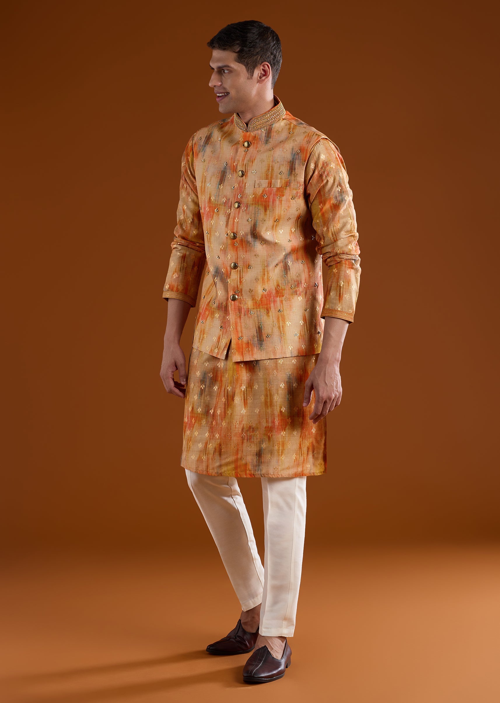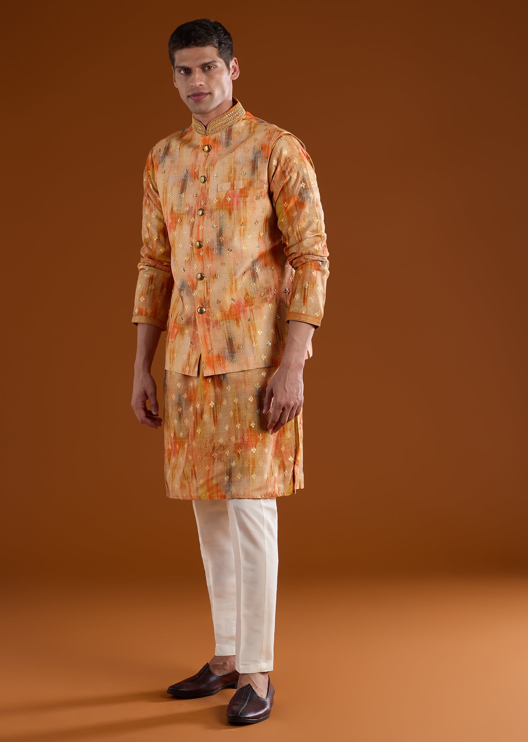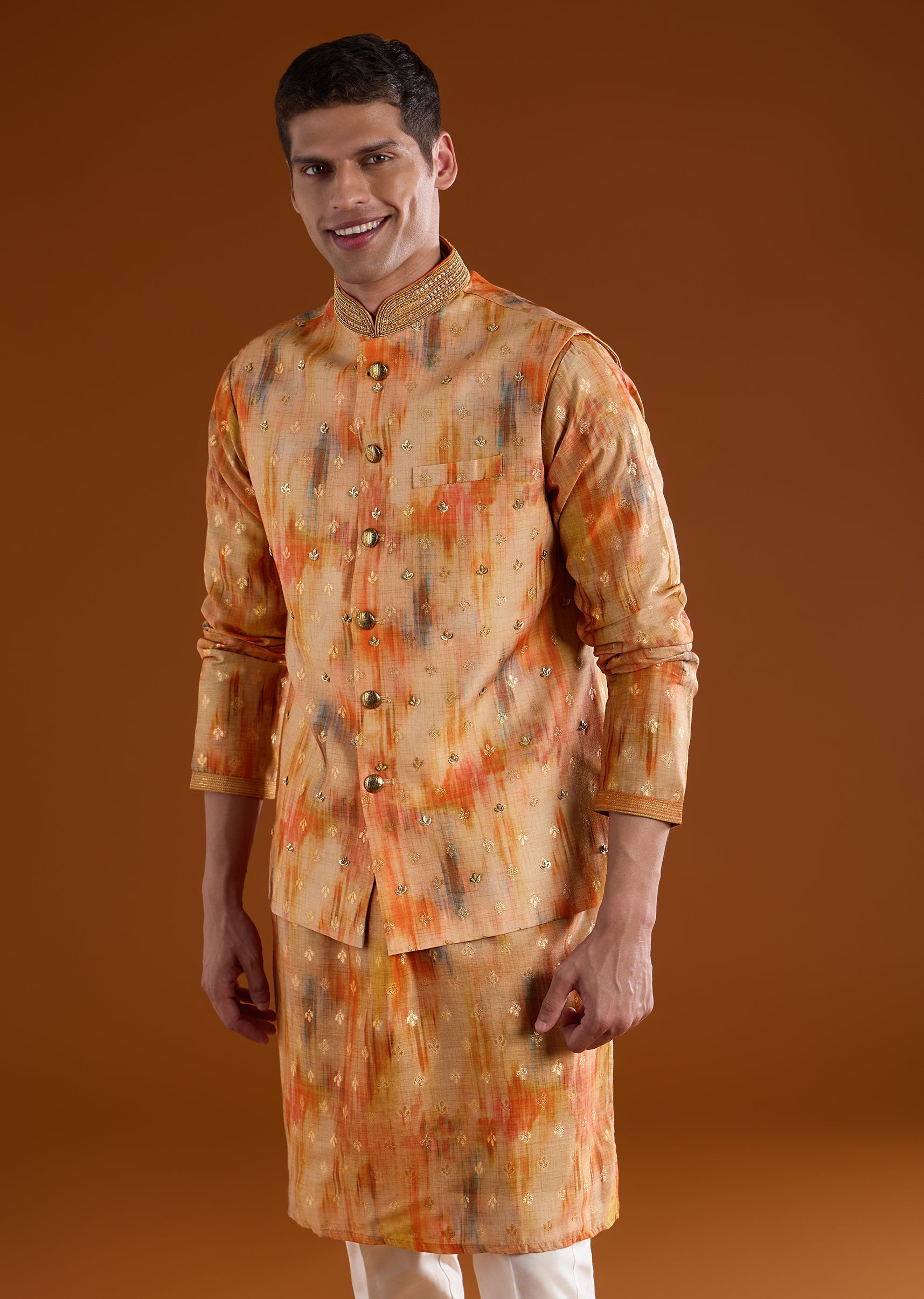 Vibrant and celebration-ready, this orange kurta jacket set is crafted in smooth art silk for a rich festive appeal. The kurta features a mandarin collar, full sleeves, and side slits, paired with an intricately embellished jacket highlighted with zari, bead, sequin, and resham motif detailing for a luminous finish. Completed with straight-fit trousers and a partially elasticated waist, this ensemble is ideal for pooja rituals, haldi, mehendi functions, and wedding celebrations. Awarded as the Most Trusted Brand, we're delivering styles you love, just as promised.