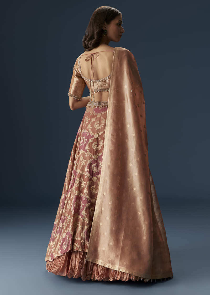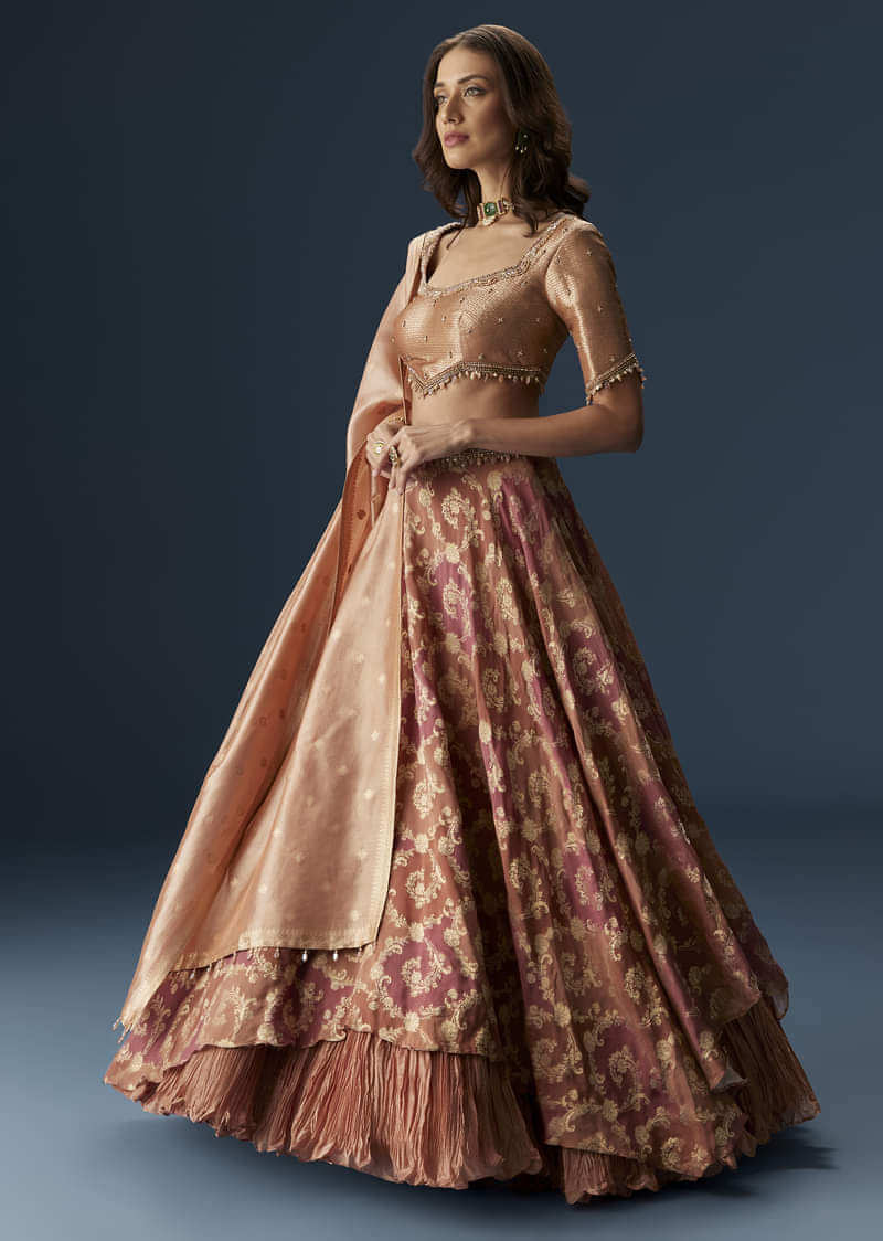 A festive lehenga set designed for vibrant celebrations, this ensemble features a half-sleeve tassel blouse, a ruched lehenga in rich brocade, and a dupatta detailed with playful tassels. A bold... More Product Details