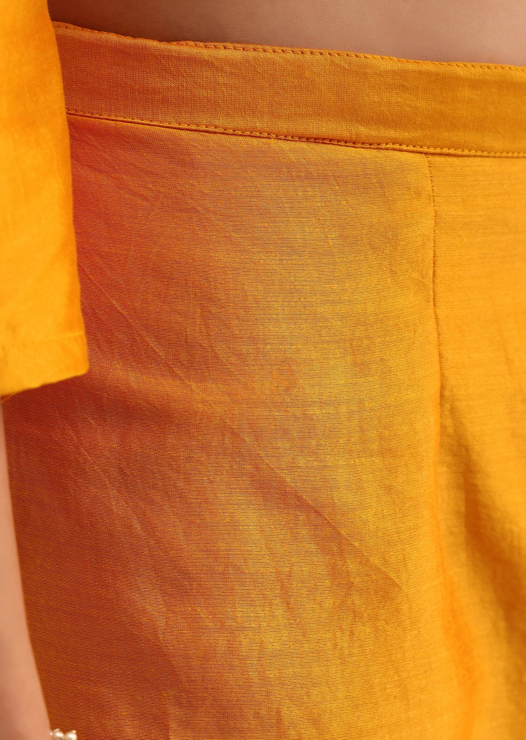 Embrace tradition with a twist in our orange anarkali set. Crafted from luxurious chanderi fabric, adorned with intricate gotta work, delicate shell tassel embroidery. The set is perfectly complemented by... More Product Details