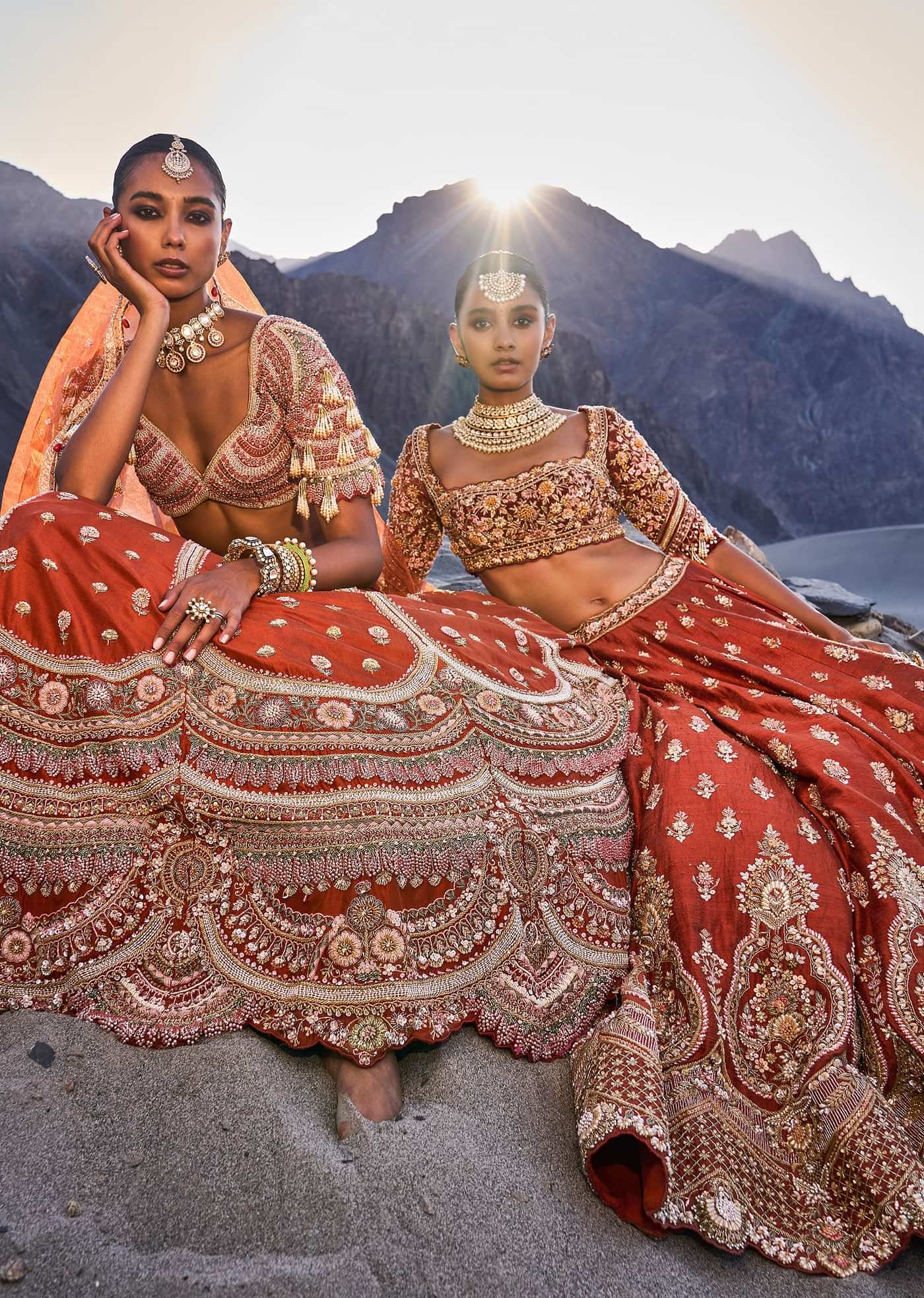 Discover the essence of royal splendor with our rust orange lehenga set, a true celebration of elegance and grandeur crafted for unforgettable occasionsThe lehenga, made from sumptuous raw silk, shines... More Product Details