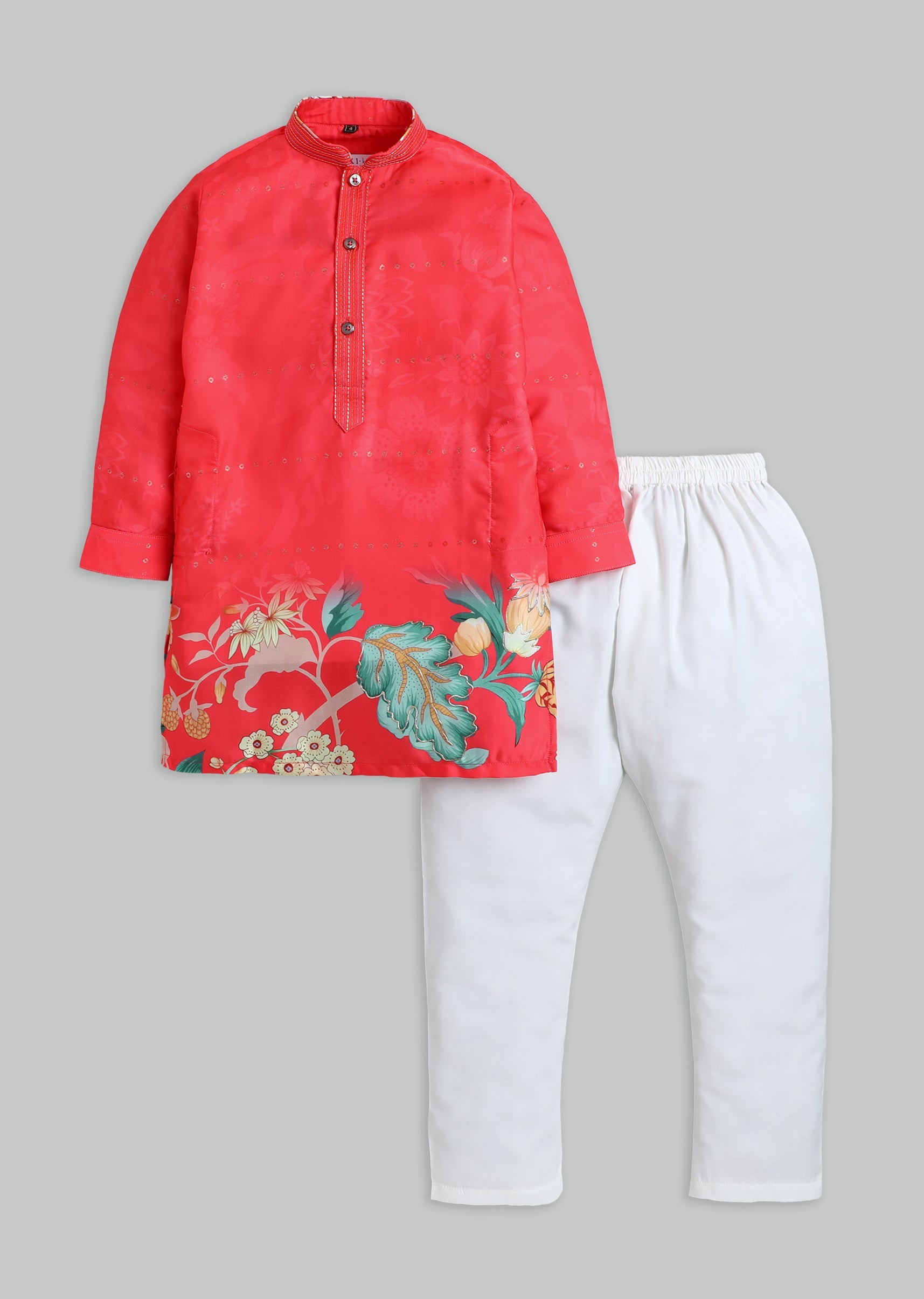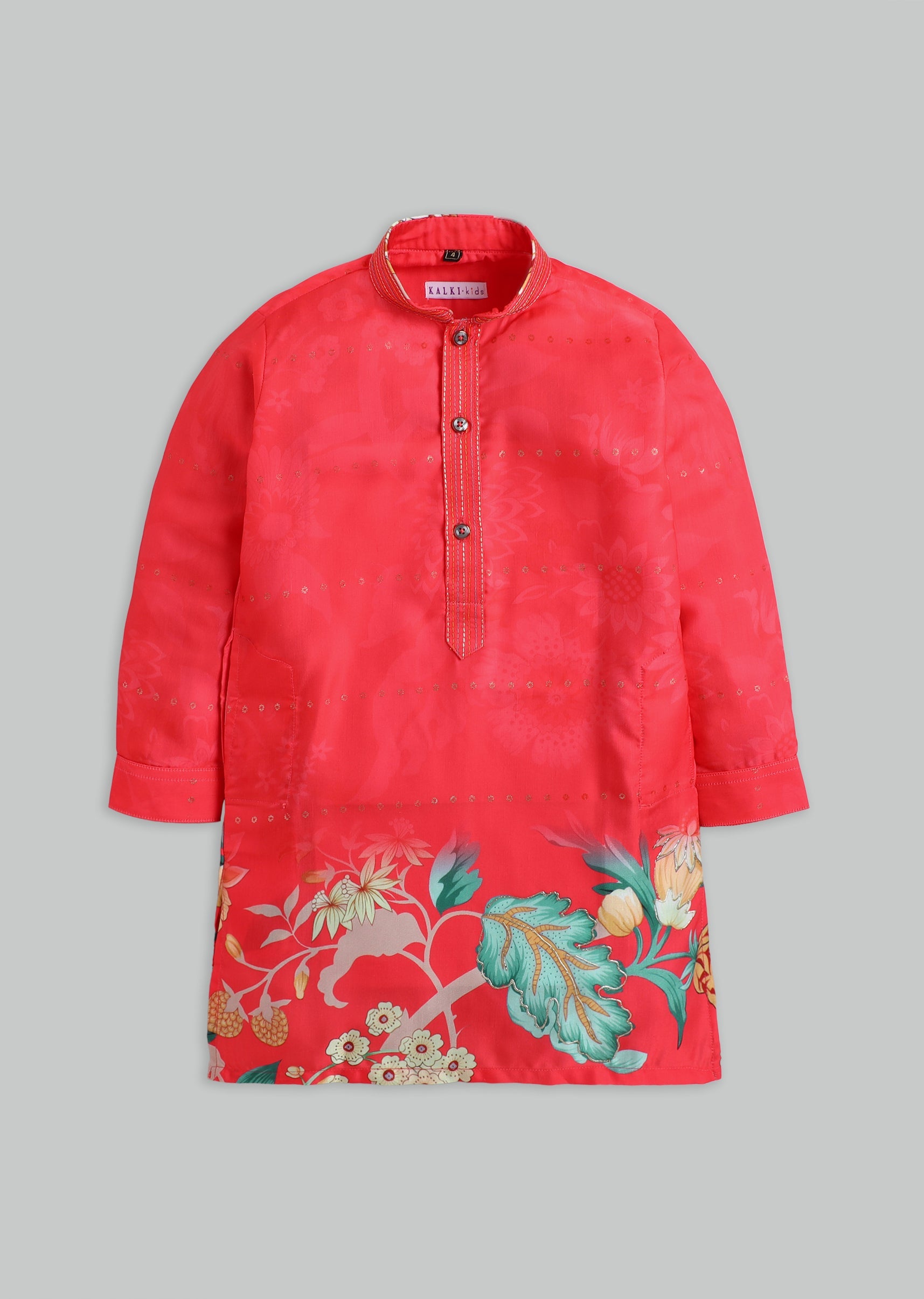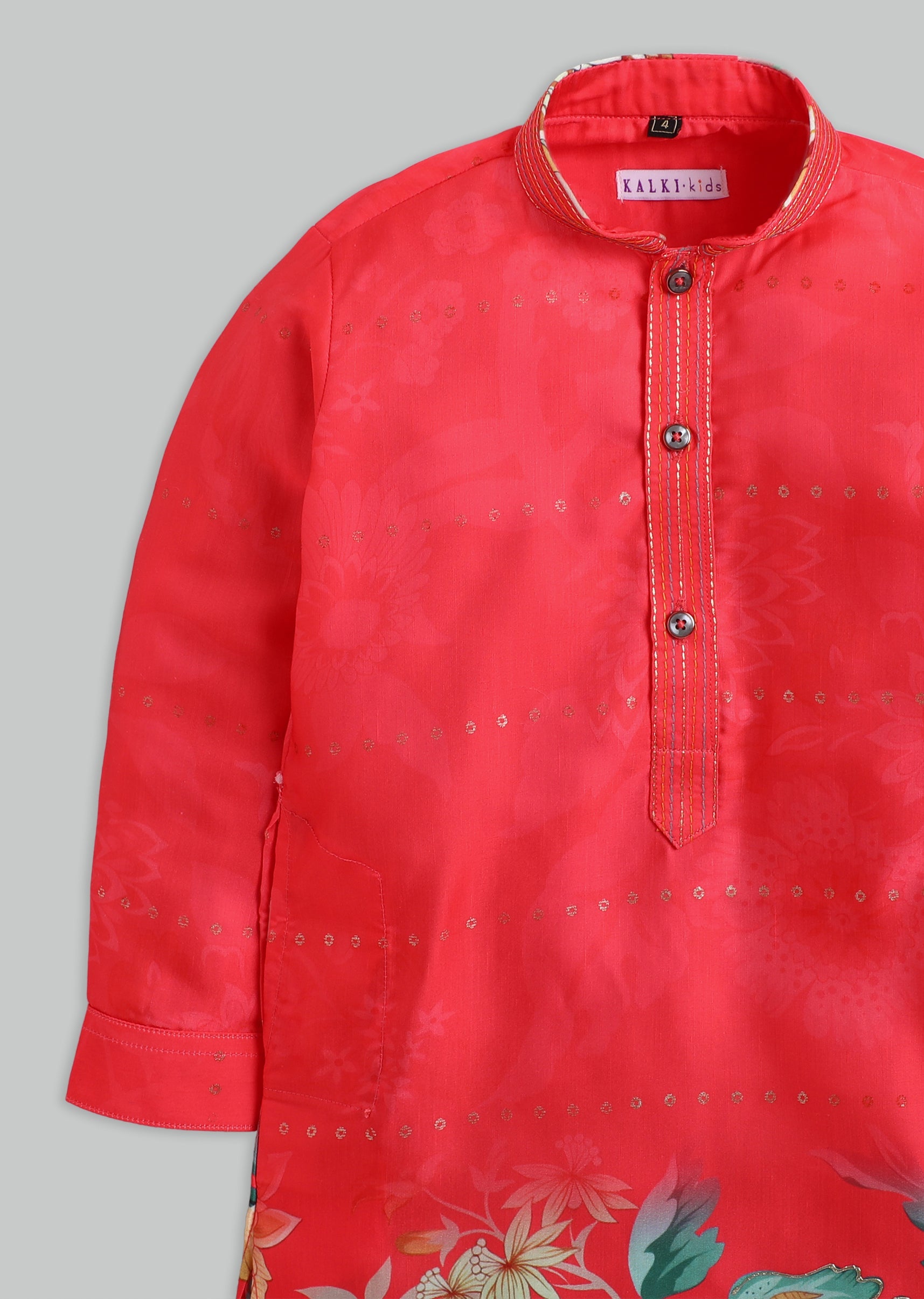 A bright orange silk kurta set featuring floral print detailing, styled with a mandarin collar, 3/4th sleeves and front buttons. Comes with matching pants—made for festive functions.