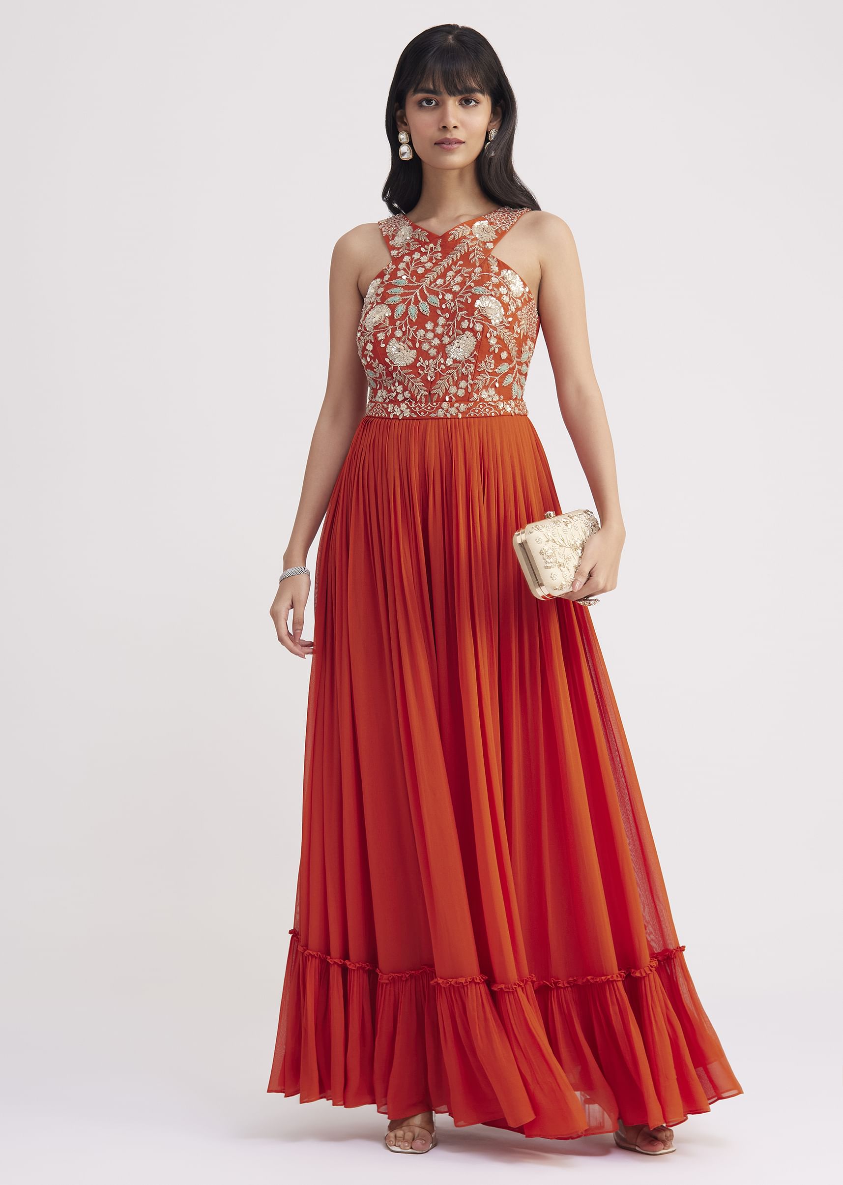 A standout party or sangeet piece this orange georgette jumpsuit is adorned with sequins cut dana and beads work. The embroidered belt adds a touch of flair to this chic... More Product Details