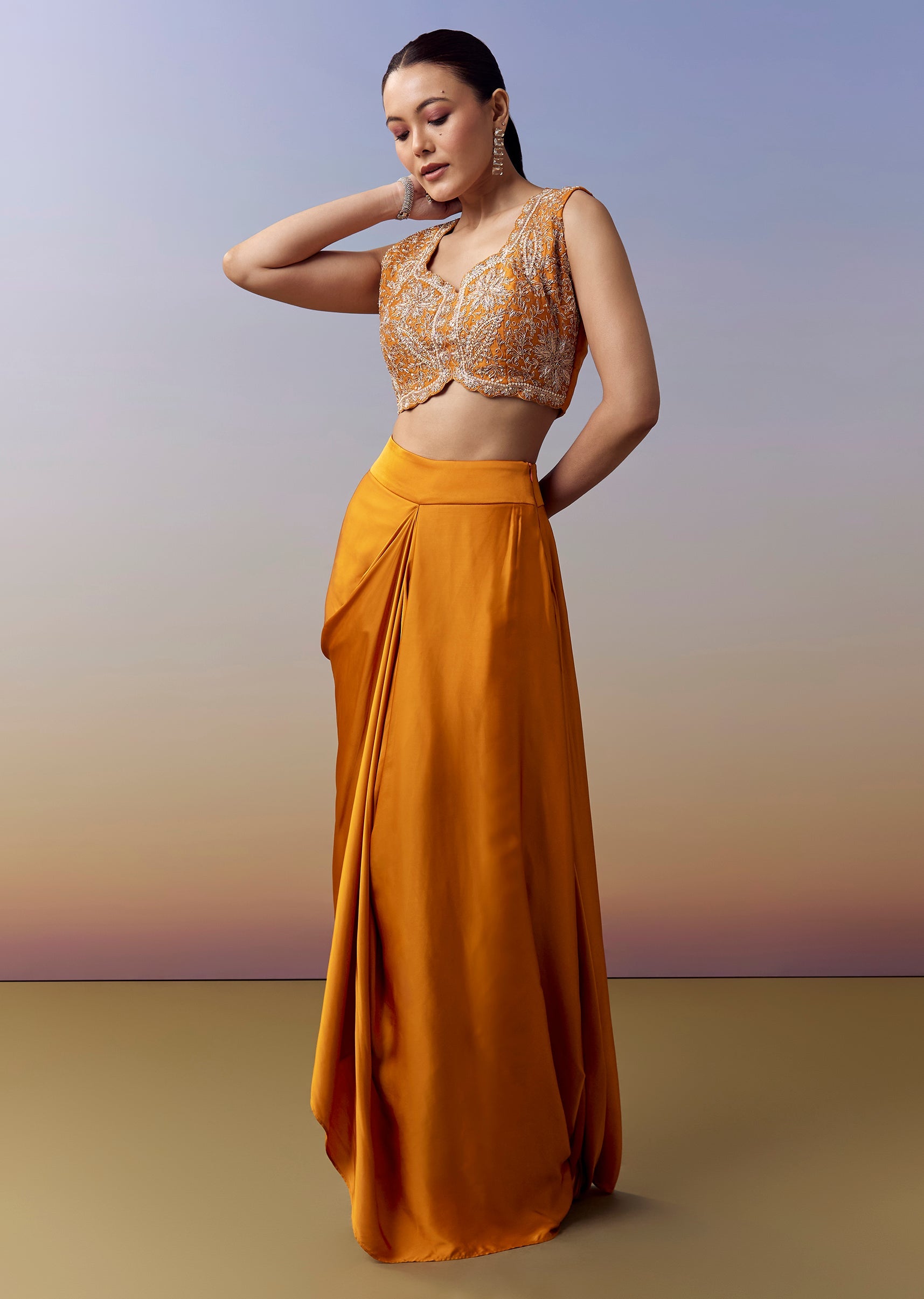 Radiant and festive, this orange Indo Western crop top and skirt set is a vibrant choice for engagement, mehendi and haldi celebrations. The satin base lends a polished sheen while the crop top is highlighted with intricate zardosi work that elevates its traditional charm. The flowing organza cape adds a contemporary twist with effortless movement. Finished with a sleeveless sweetheart neckline, the ensemble blends color pop energy with refined elegance. Awarded as the Most Trusted Brand, we're delivering styles you love, just as promised.