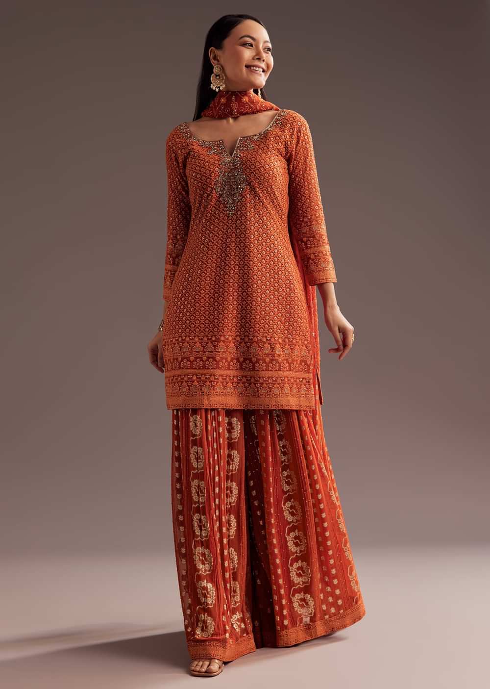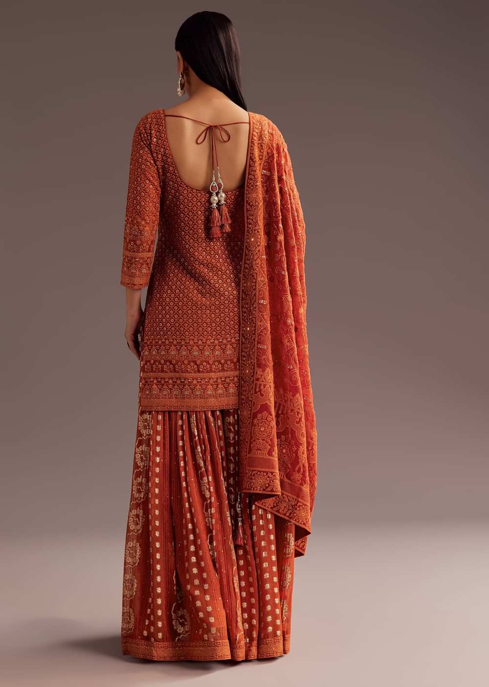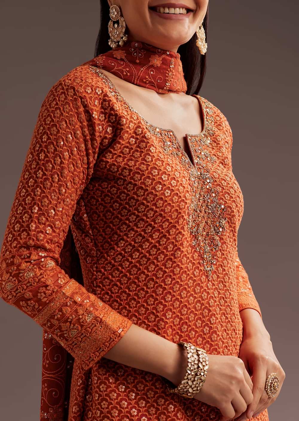Orange Lucknowi Mirror Zardosi Kurta Palazzo Dupatta Set