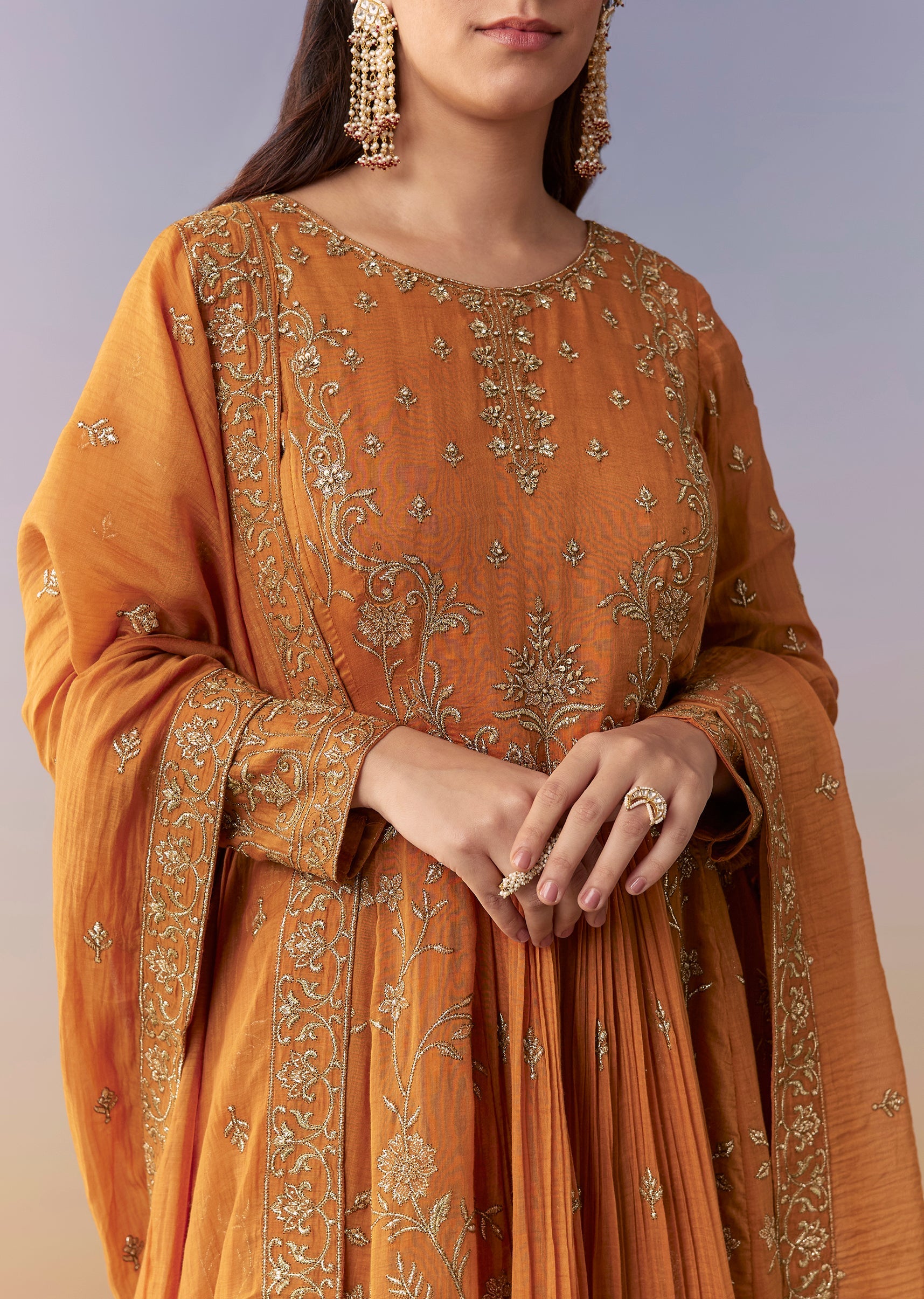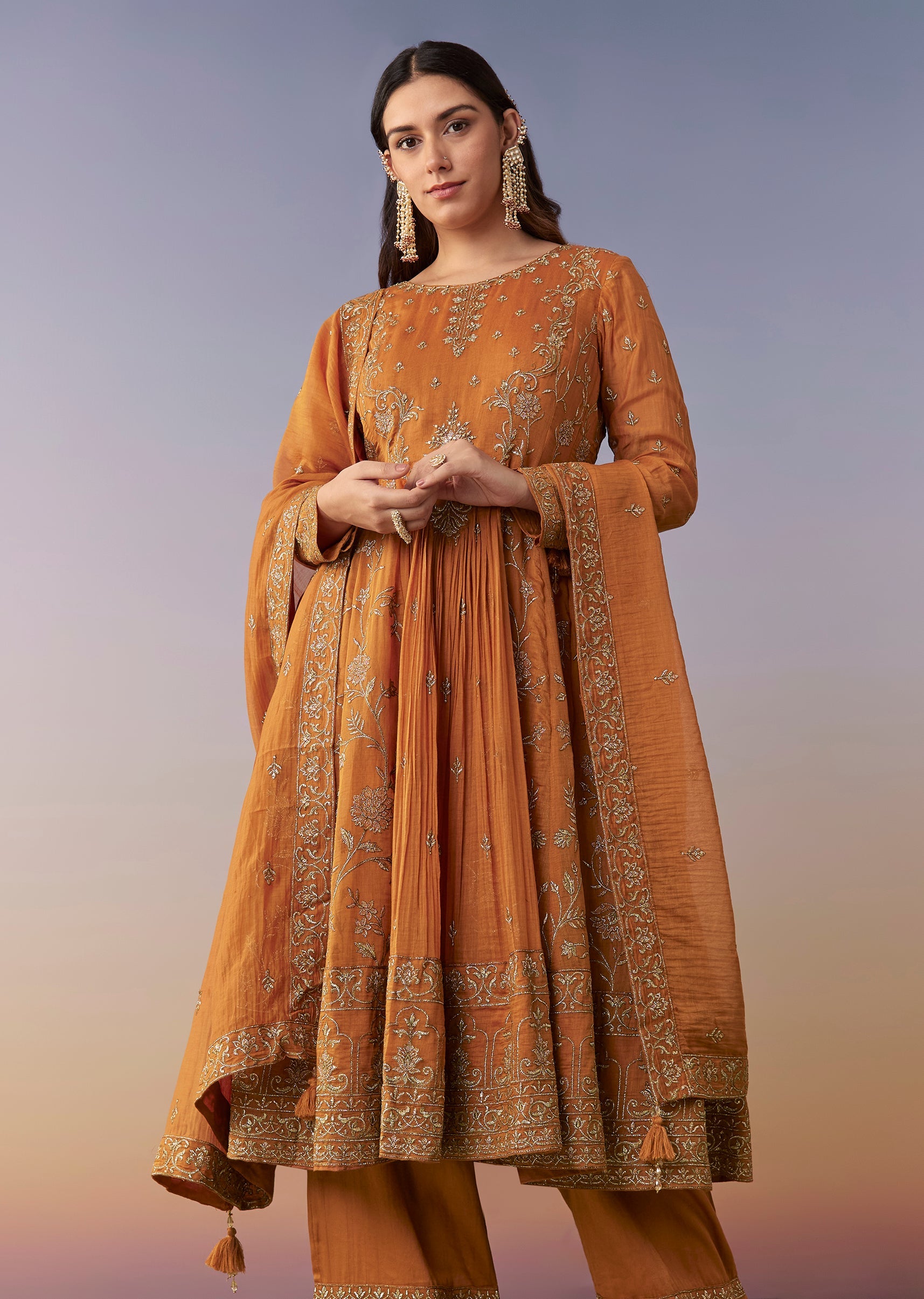 Orange Metallic Embroidered Anarkali Suit Set With Pant And Dupatta