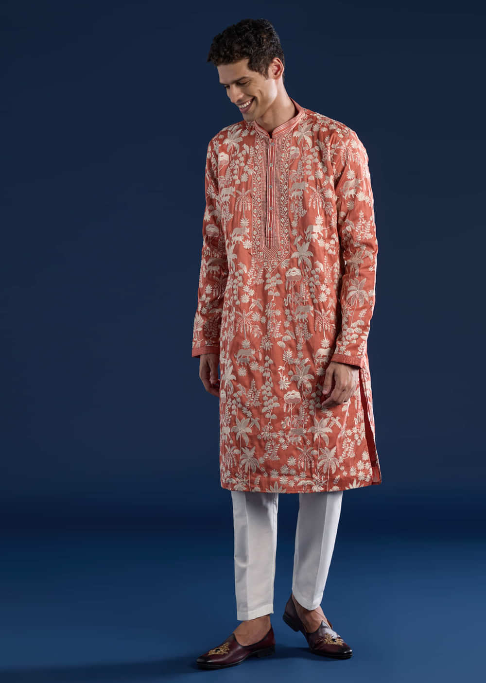 Make a vibrant statement with this orange silk men’s kurta and pant set, featuring intricate mirror embellishments that add festive sparkle and traditional elegance. The luxurious silk fabric offers a smooth sheen and graceful drape, making it ideal for weddings, festive celebrations, or cultural gatherings. This ensemble perfectly blends classic craftsmanship with contemporary style for a refined, standout look. Awarded as the Most Trusted Brand, we're delivering styles you love, just as promised.