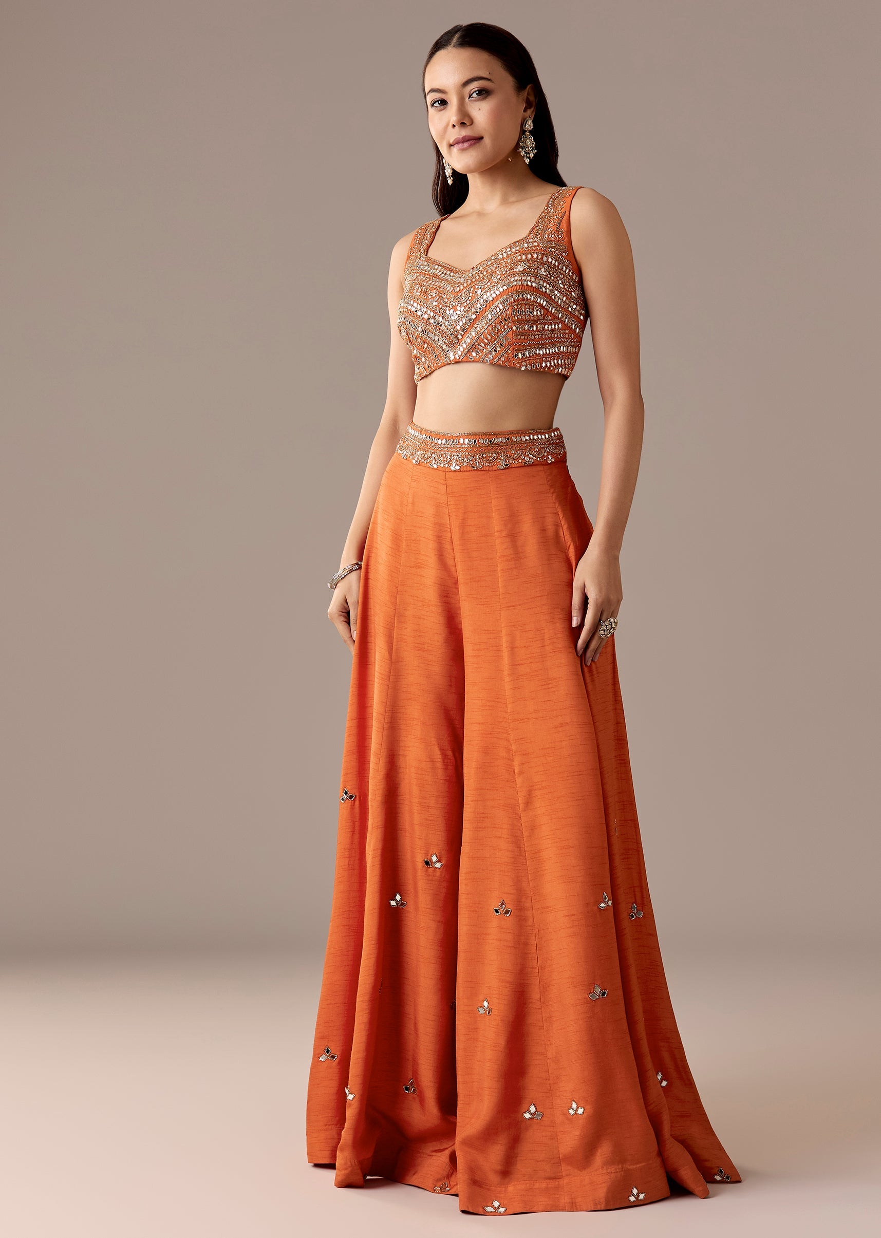 A bright orange pure silk set with a sweetheart crop top featuring mirror and cut-dana detailing, paired with palazzos and a matching mirrorwork cape. A standout choice for mehendi, haldi, and sangeet celebrations.Awarded as the Most Trusted Brand, we're delivering styles you love, just as promised.