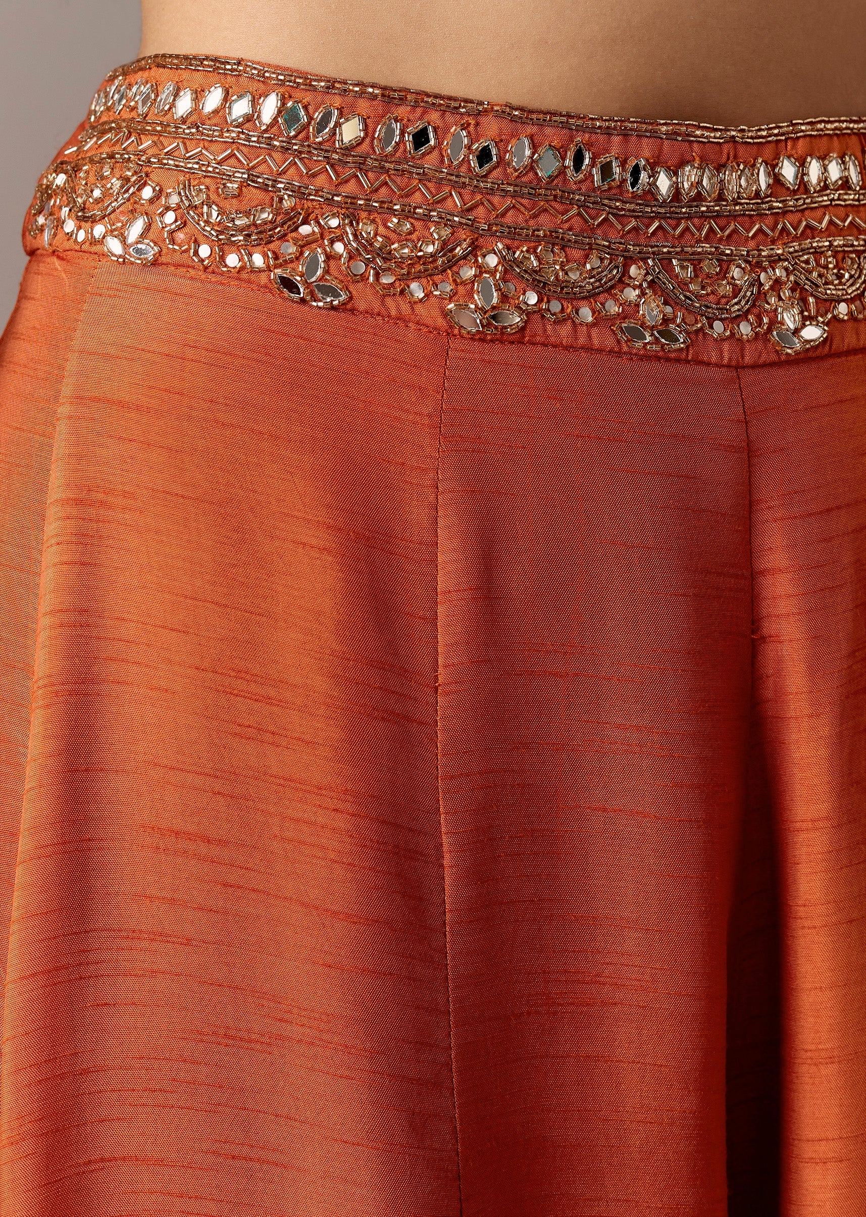 A bright orange pure silk set with a sweetheart crop top featuring mirror and cut-dana detailing, paired with palazzos and a matching mirrorwork cape. A standout choice for mehendi, haldi,... More Product Details
