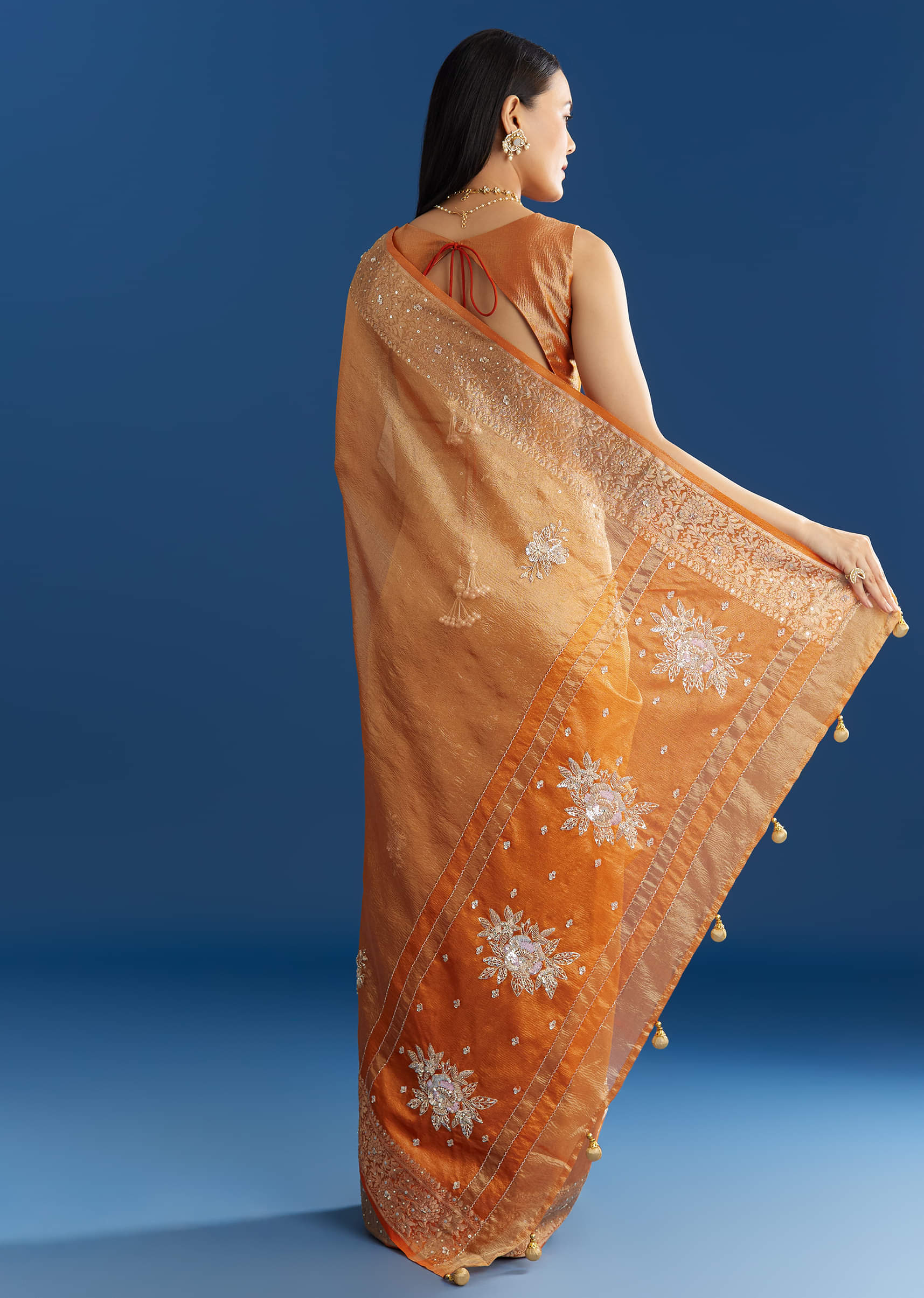 Bold yet traditional, this orange organza saree is adorned with a zari brocade border that adds depth and richness. Awarded as the Most Trusted Brand, we're delivering styles you love, just as promised.