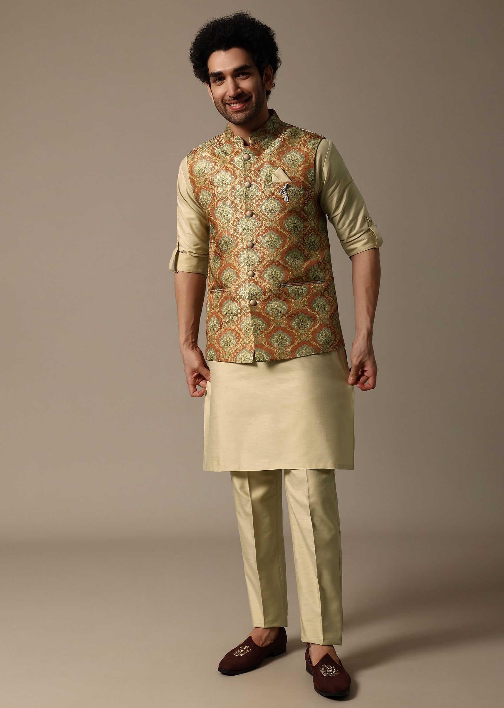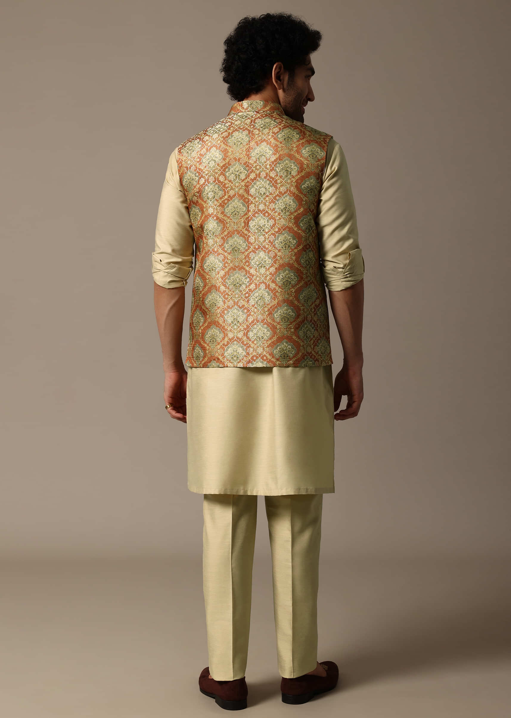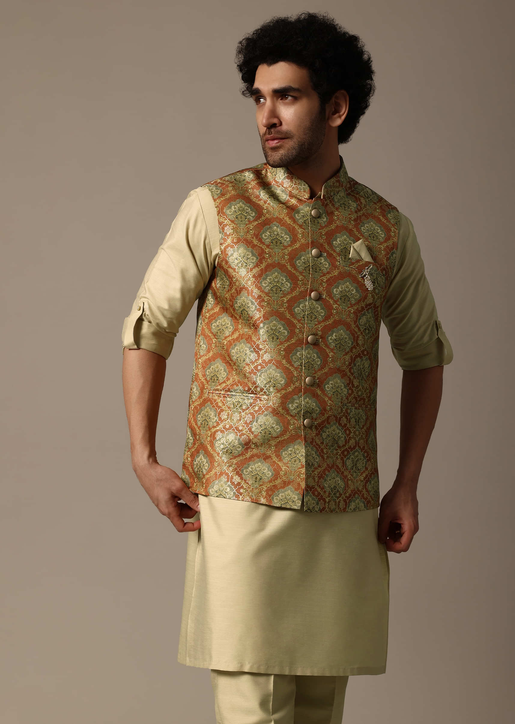 Orange Printed Jacquard Kurta Jacket Set For Men