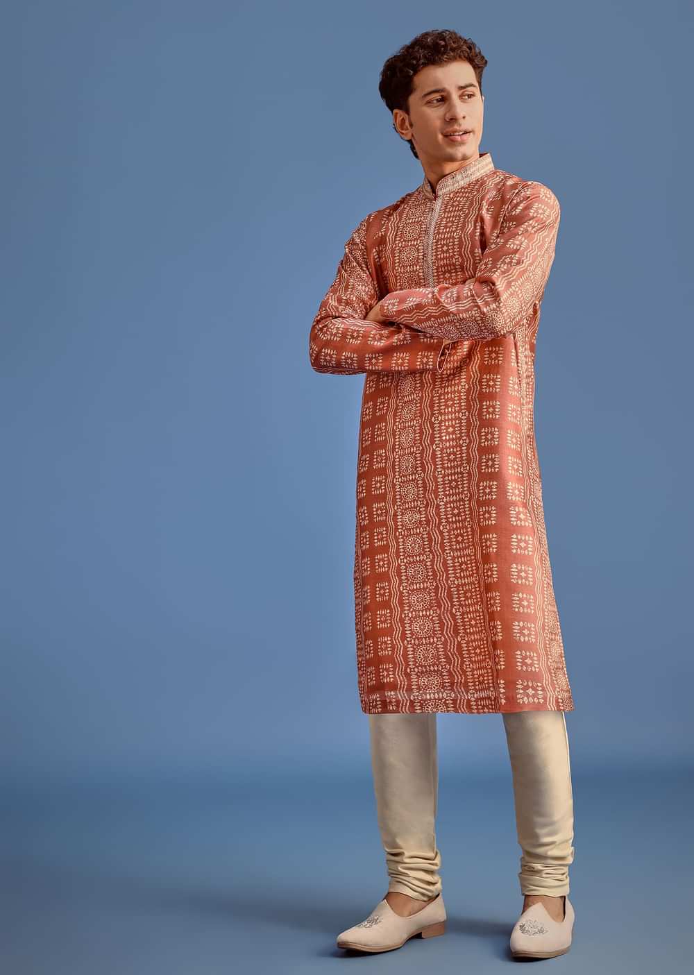 Orange Printed Silk Kurta Set For Men