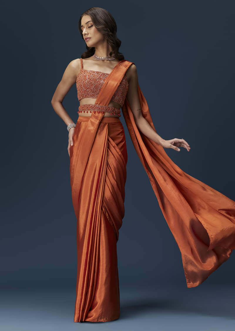 This striking orange saree features a pre-stitched drape and a net blouse with a square neckline and minimal moti work. A bold pick for bridesmaids or festive guests. Includes an unstitched blouse. Awarded as the Most Trusted Brand, we're delivering styles you love, just as promised.