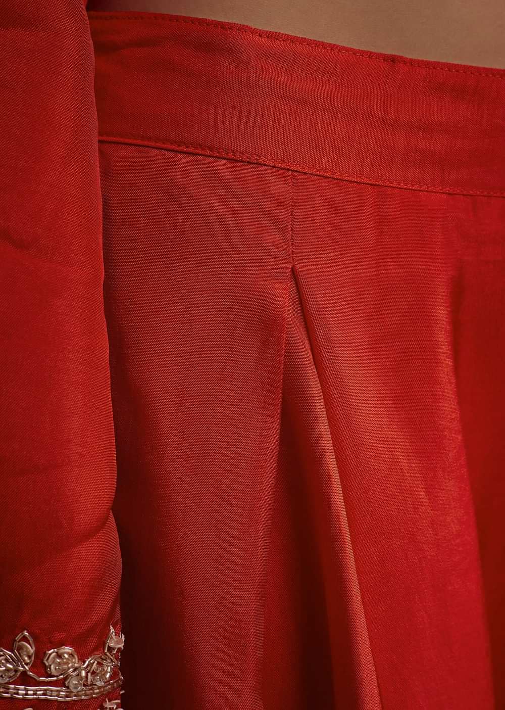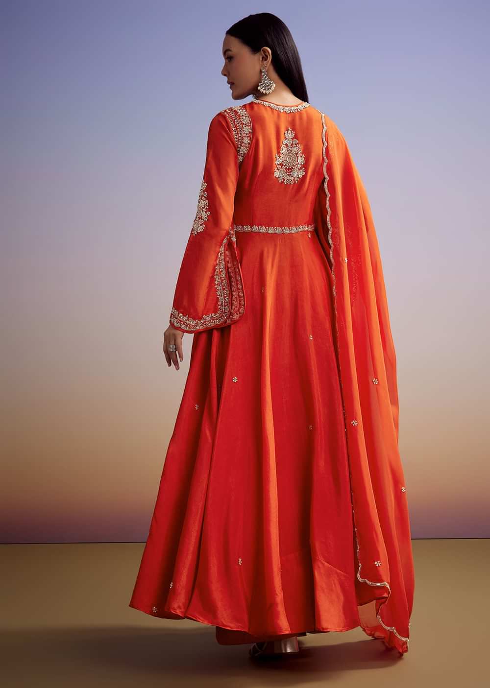 Crafted in lustrous Russian silk, this orange palazzo suit features a front-slit kurta adorned with intricate cut dana and sequin embroidery. The flared sleeves add a touch of drama, while... More Product Details
