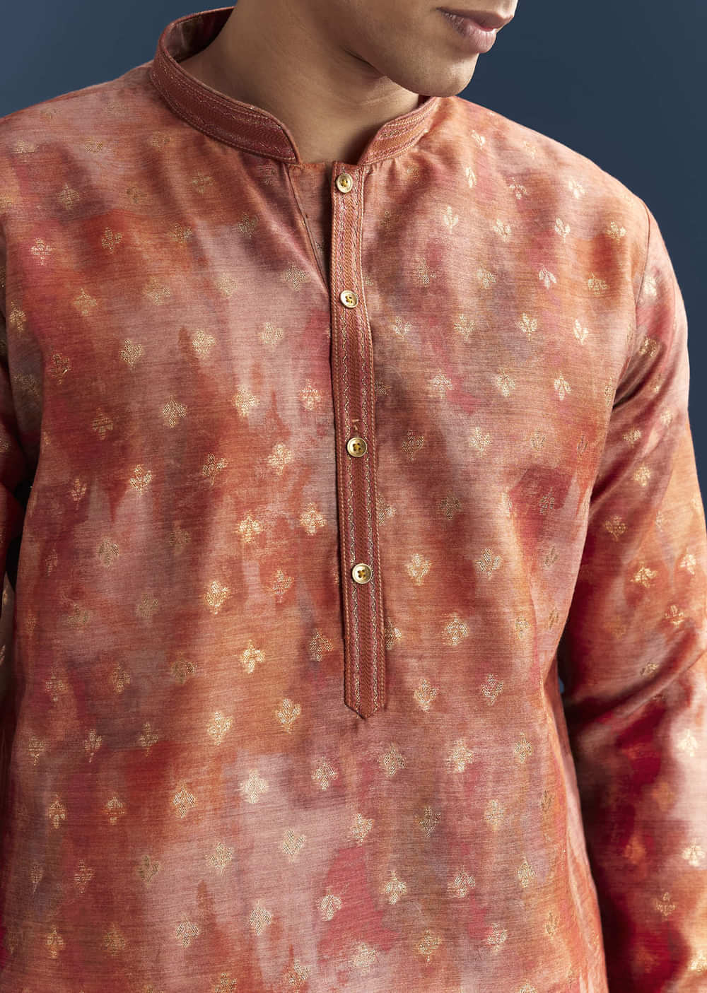 The orange silk men's kurta set pairs a spirited abstract print with foil-printed buttis for a festive vibe that’s bold yet celebratory. It’s the kind of look that brings energy... More Product Details