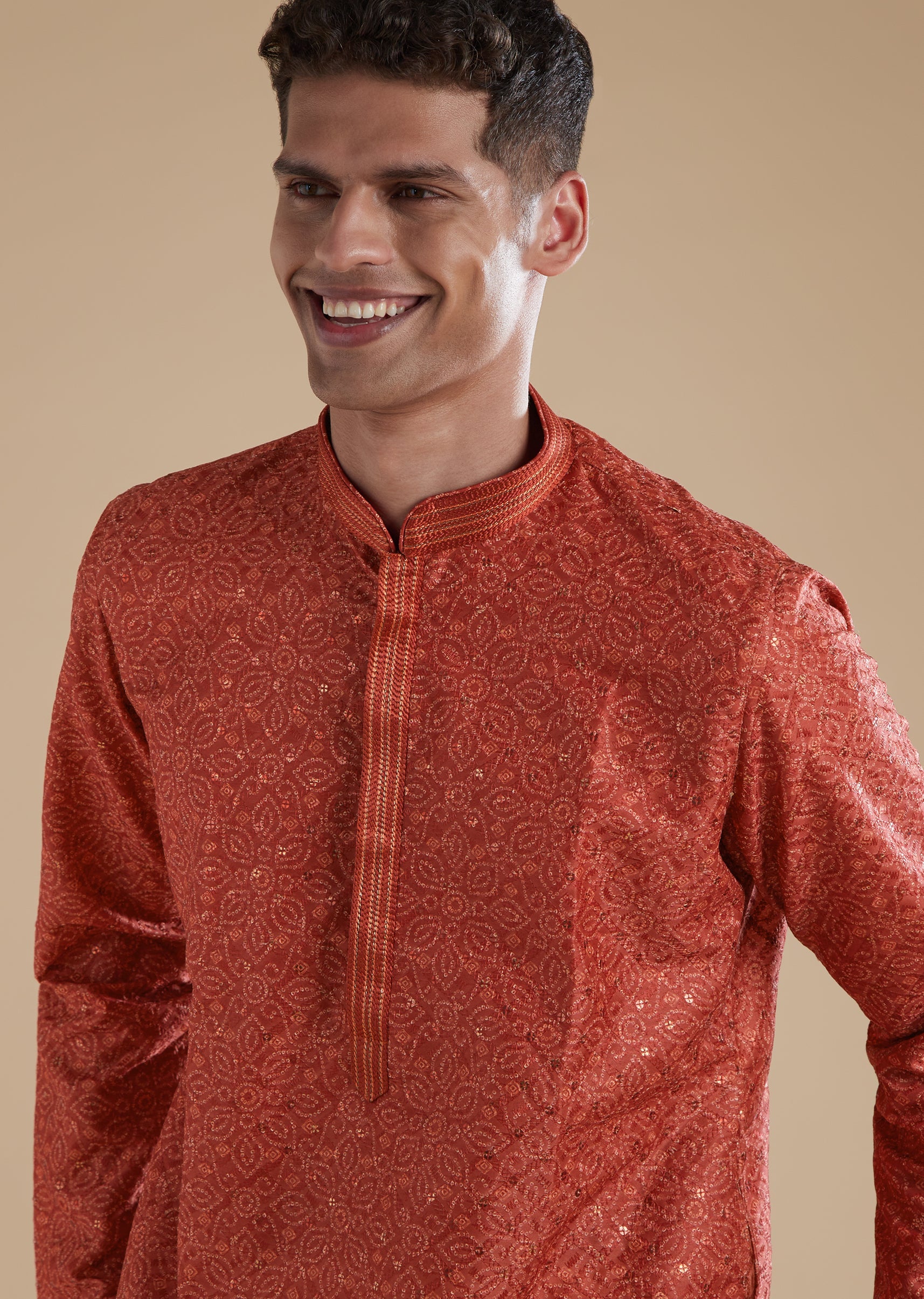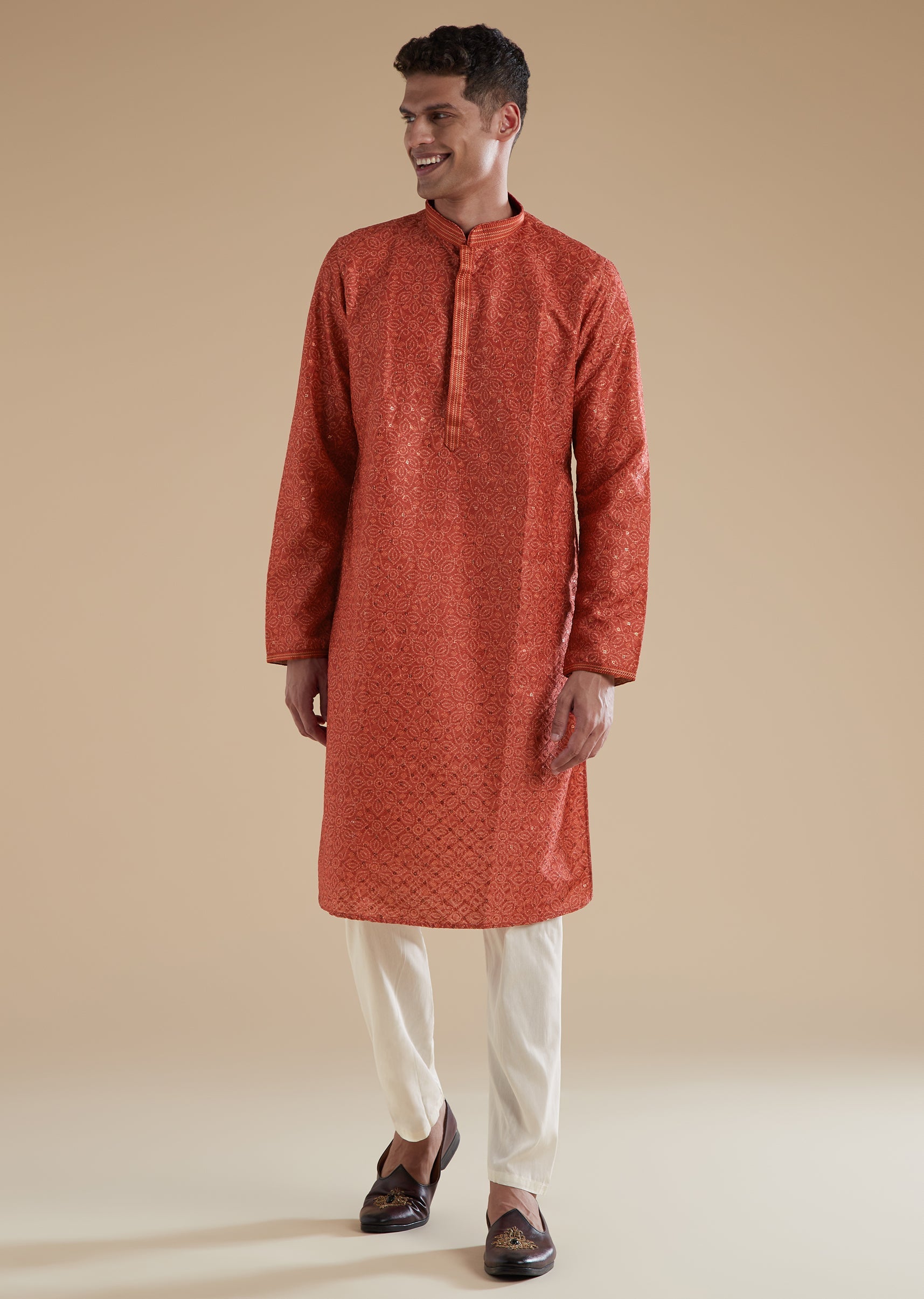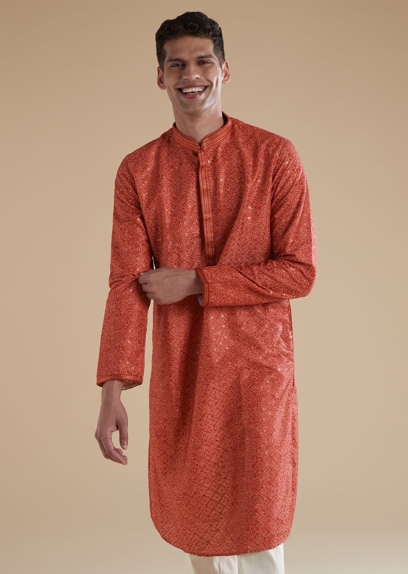 Vibrant and festive, this orange kurta set is crafted in premium silk with art silk as the secondary fabric for a smooth and refined finish. The kurta is highlighted with delicate sequins detailing that adds a subtle sparkle, making it perfect for daytime or evening celebrations. Designed with a mandarin collar, full sleeves, and clean front button closures on both the kurta and the coordinating pants, the ensemble offers a polished and contemporary silhouette. Comfortable yet striking, it is an effortless choice for festive gatherings and wedding events.