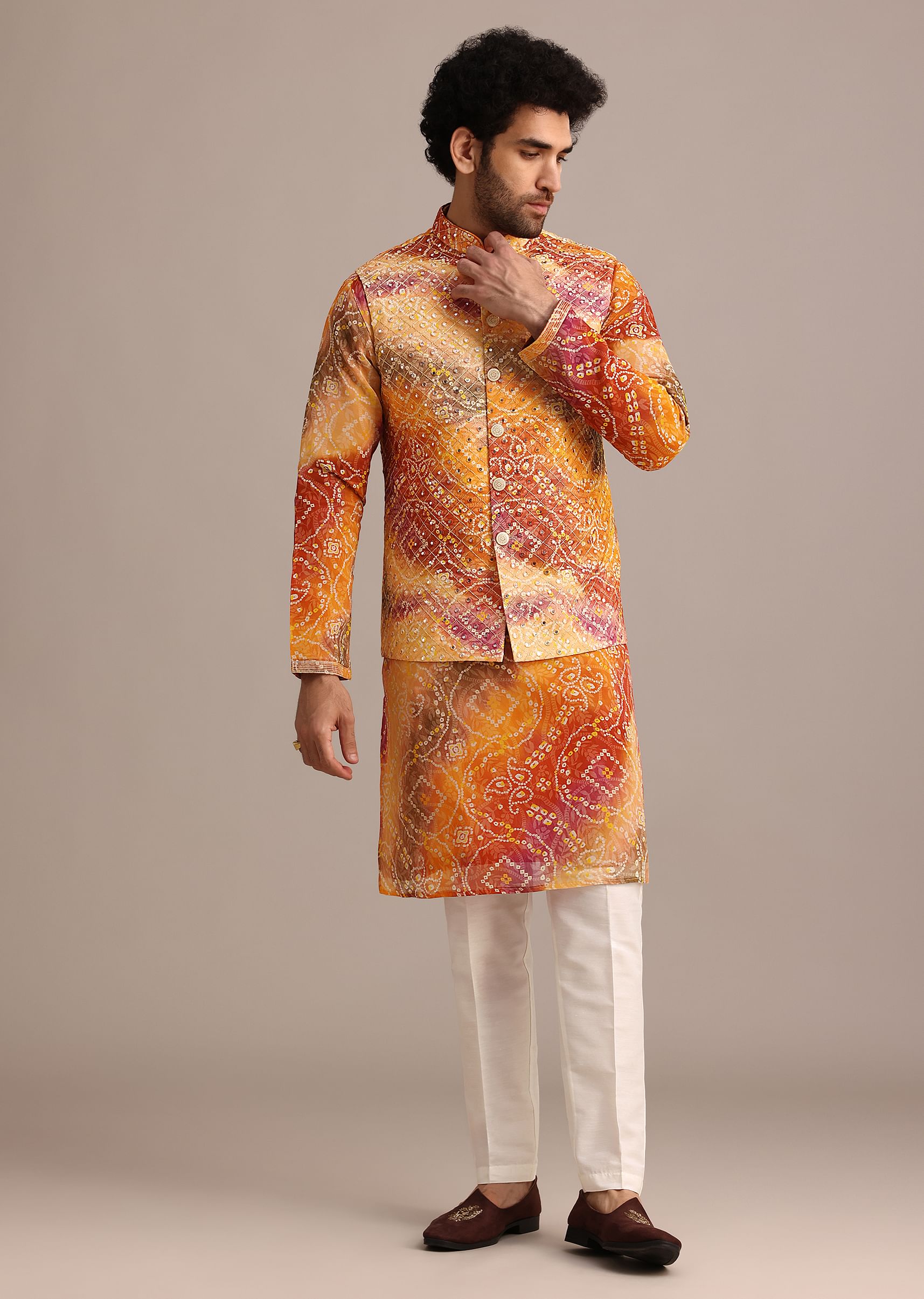 Orange Tie Dye Jacket Kurta And Jacket Set With Mirror Work