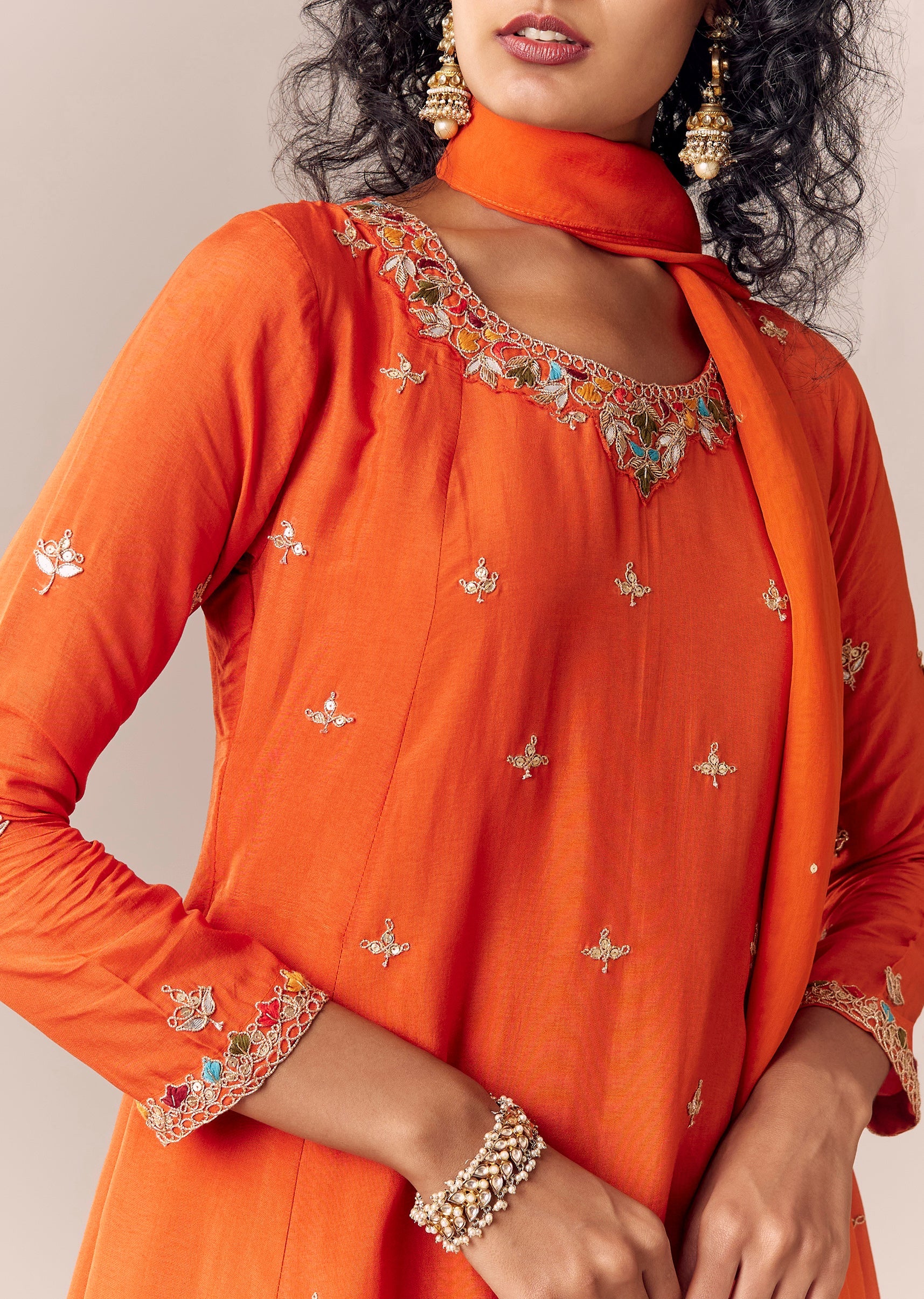 A bright festive Anarkali set with zari thread embroidery on silk-chinon. Full sleeves with a round neckline, paired with palazzos (partially elasticated waist) and dupatta—perfect for festive functions. Awarded as... More Product Details