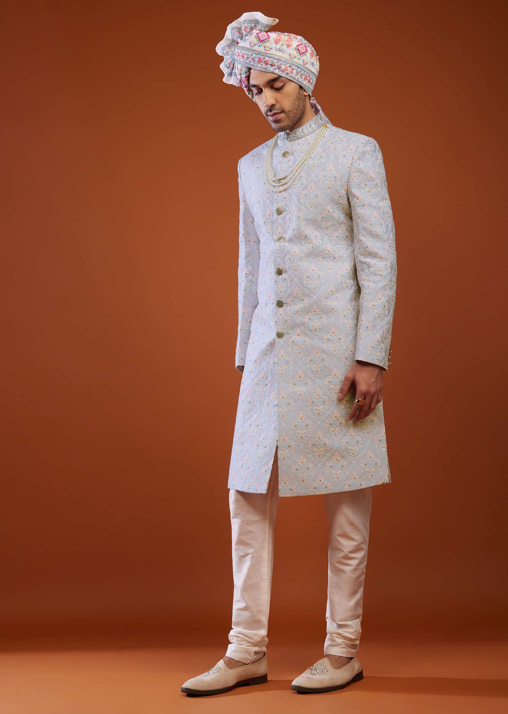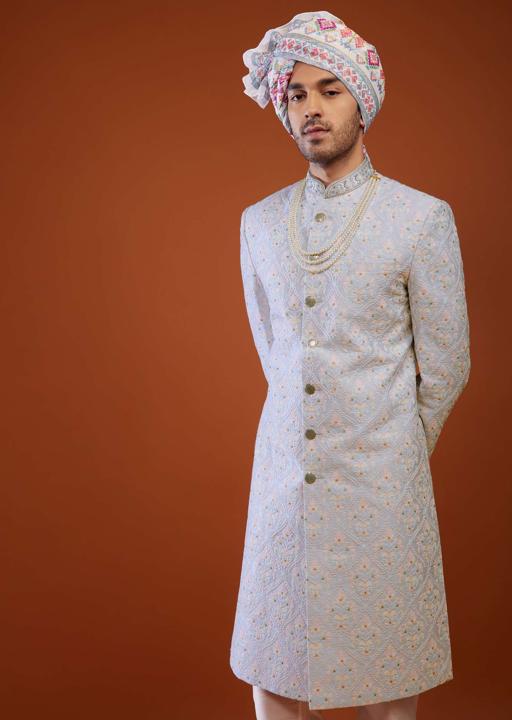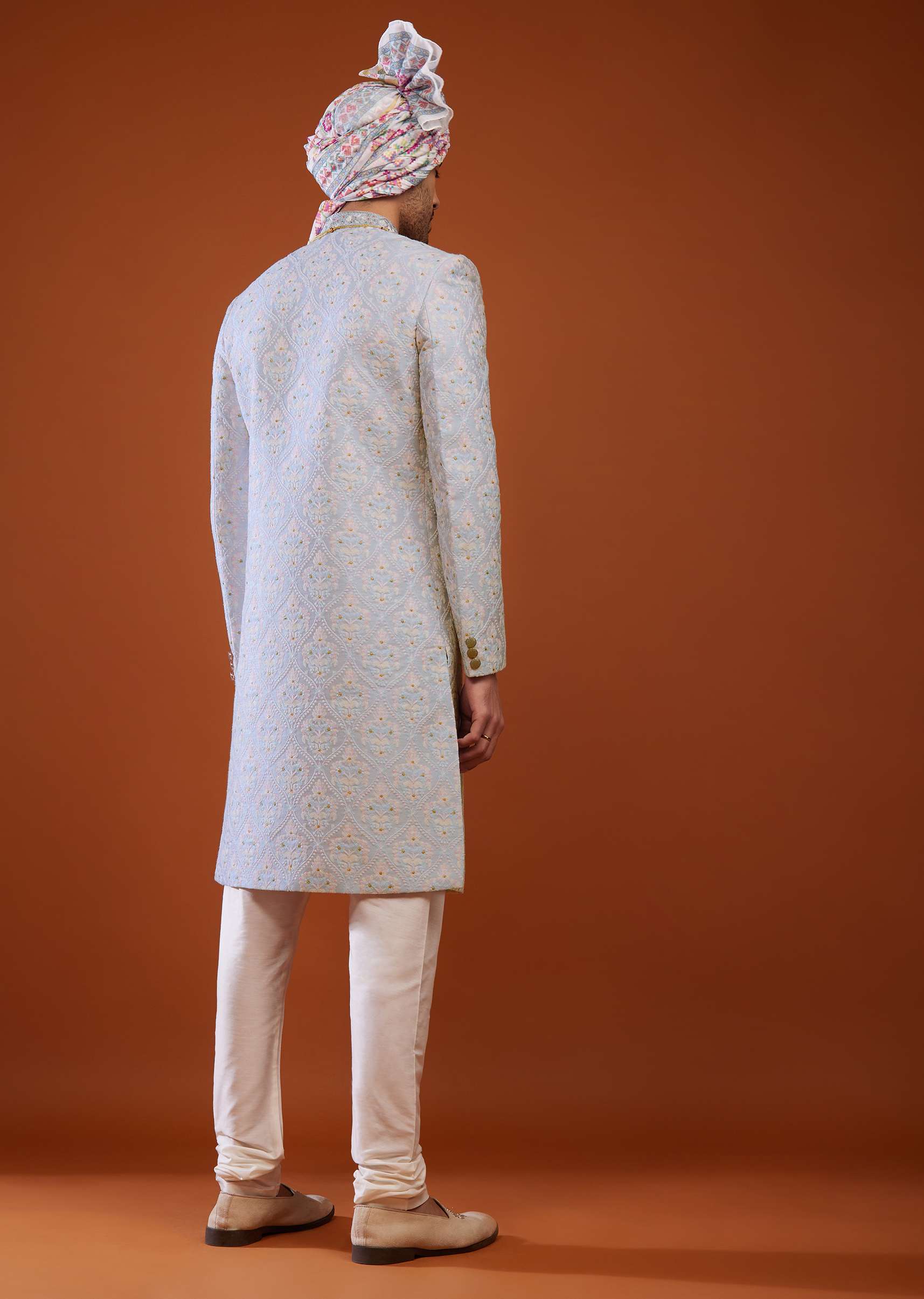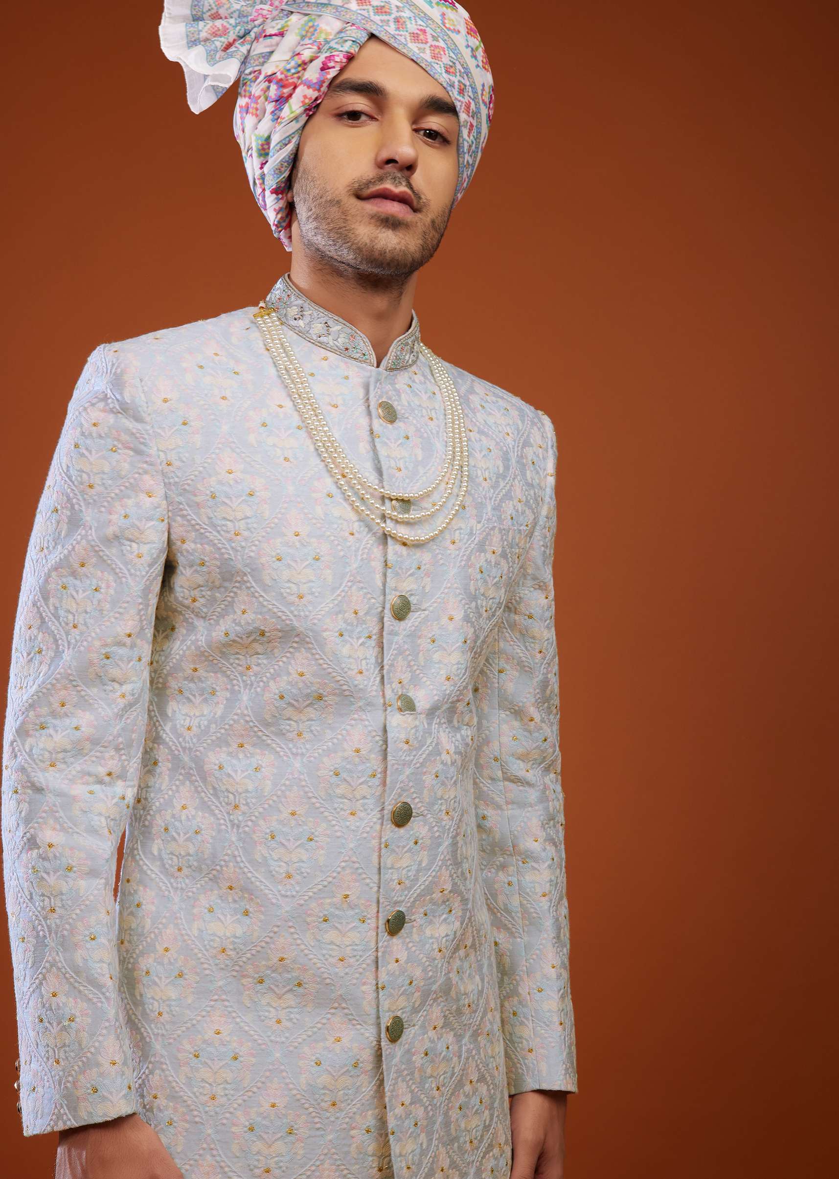 Powder Blue Floral Embroidered Sherwani Set In Silk
