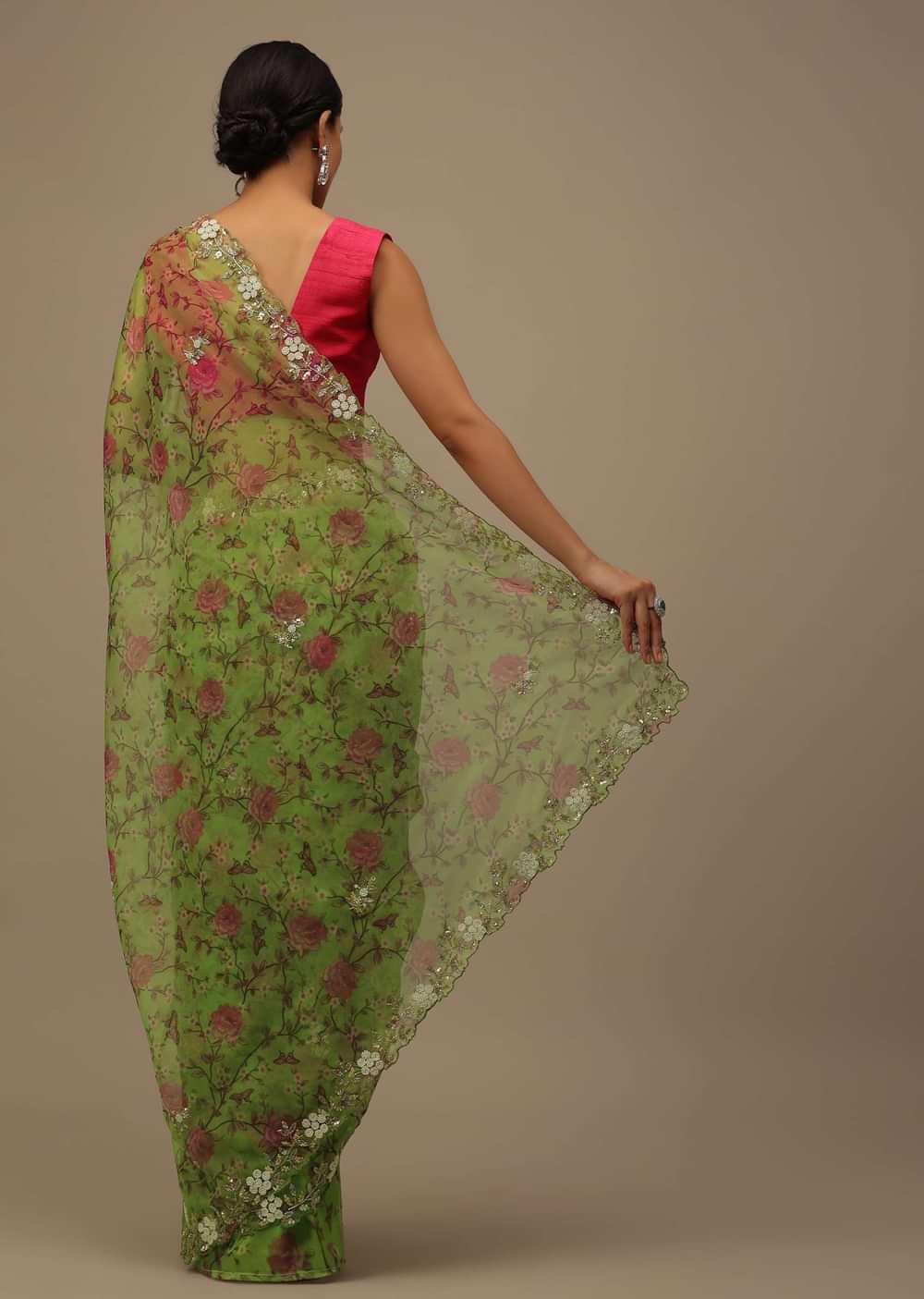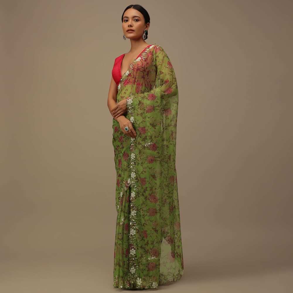 Parrot Green Cutdana Embroidered Saree In Organza With Floral Print