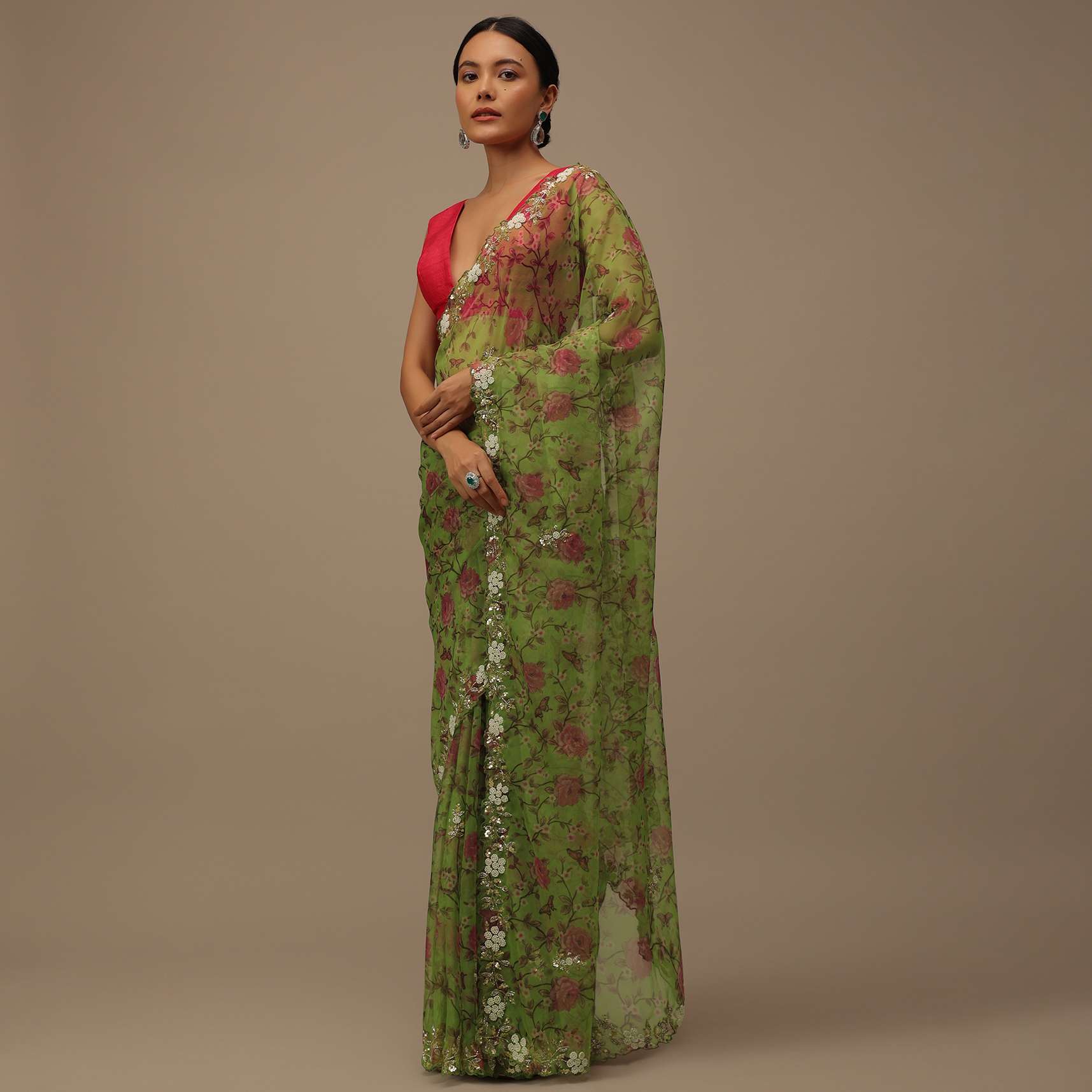 - Experience elegance and grace with our stunning saree in organza adorned with a vibrant floral print.