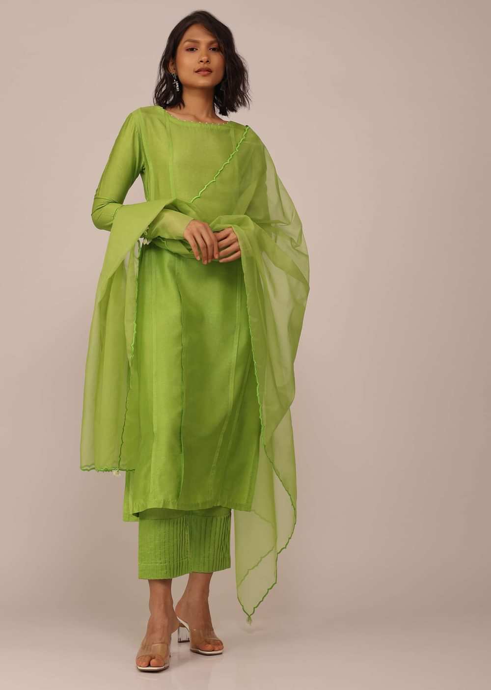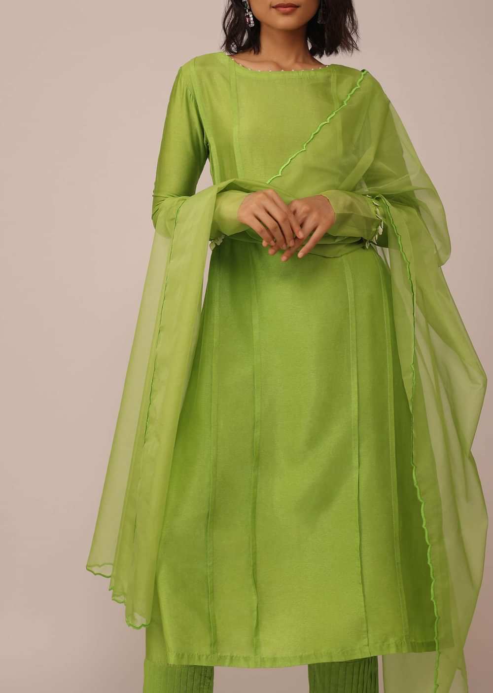 Parrot Green Suit Set In Art Silk With Tassels On The Sleeves