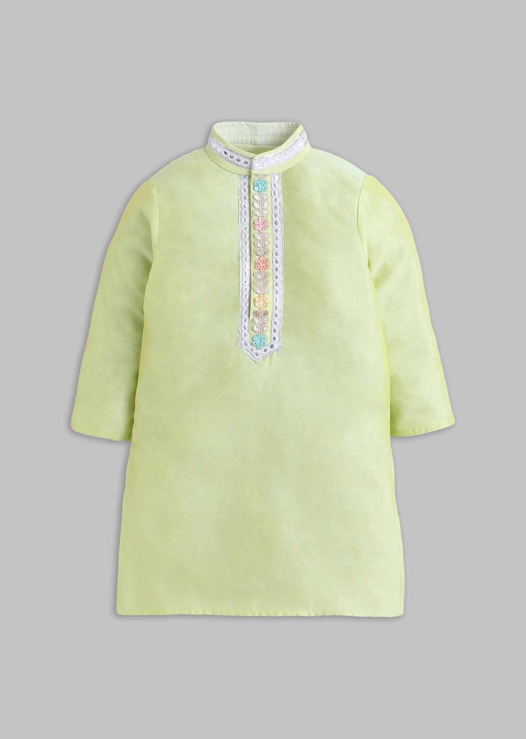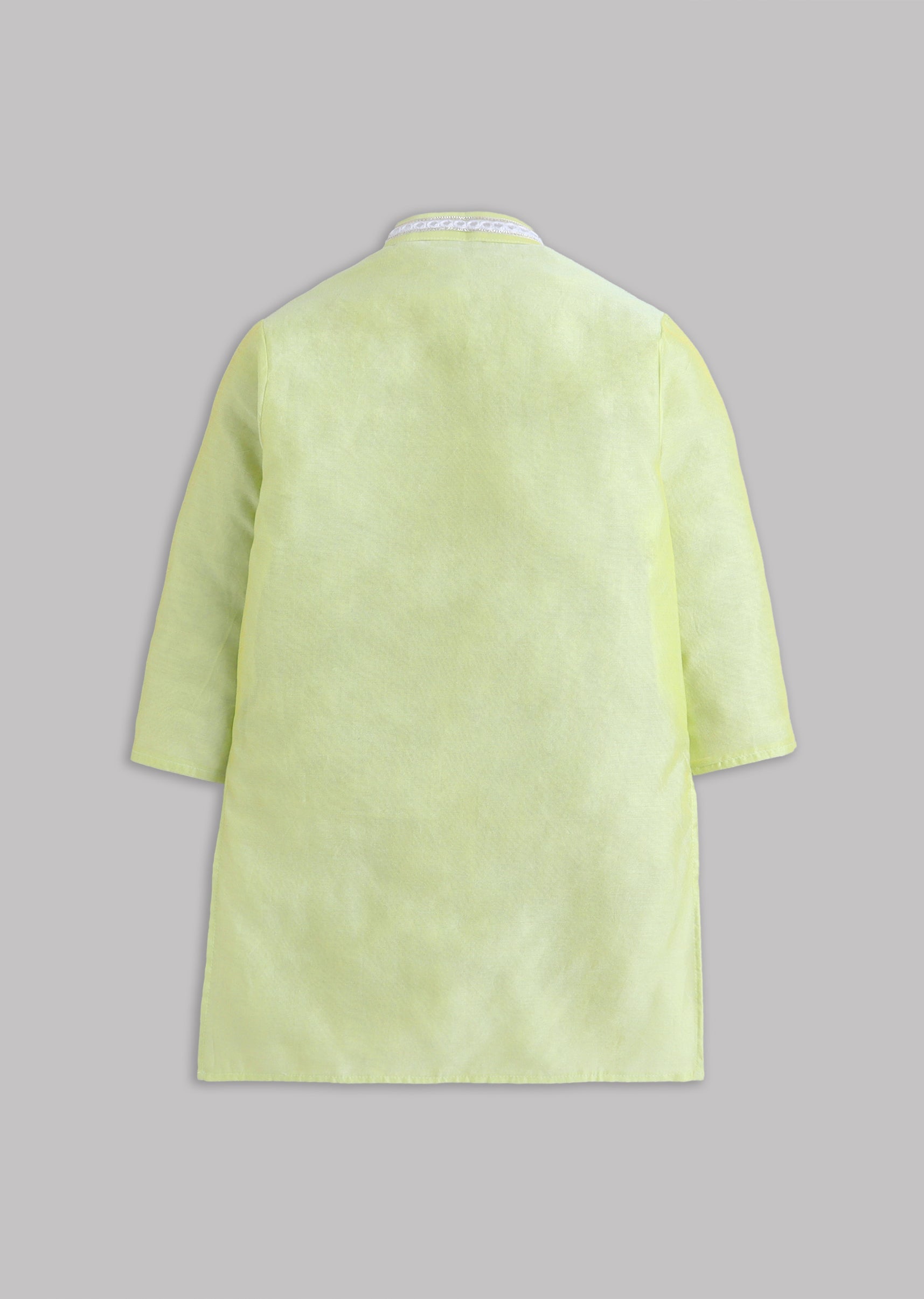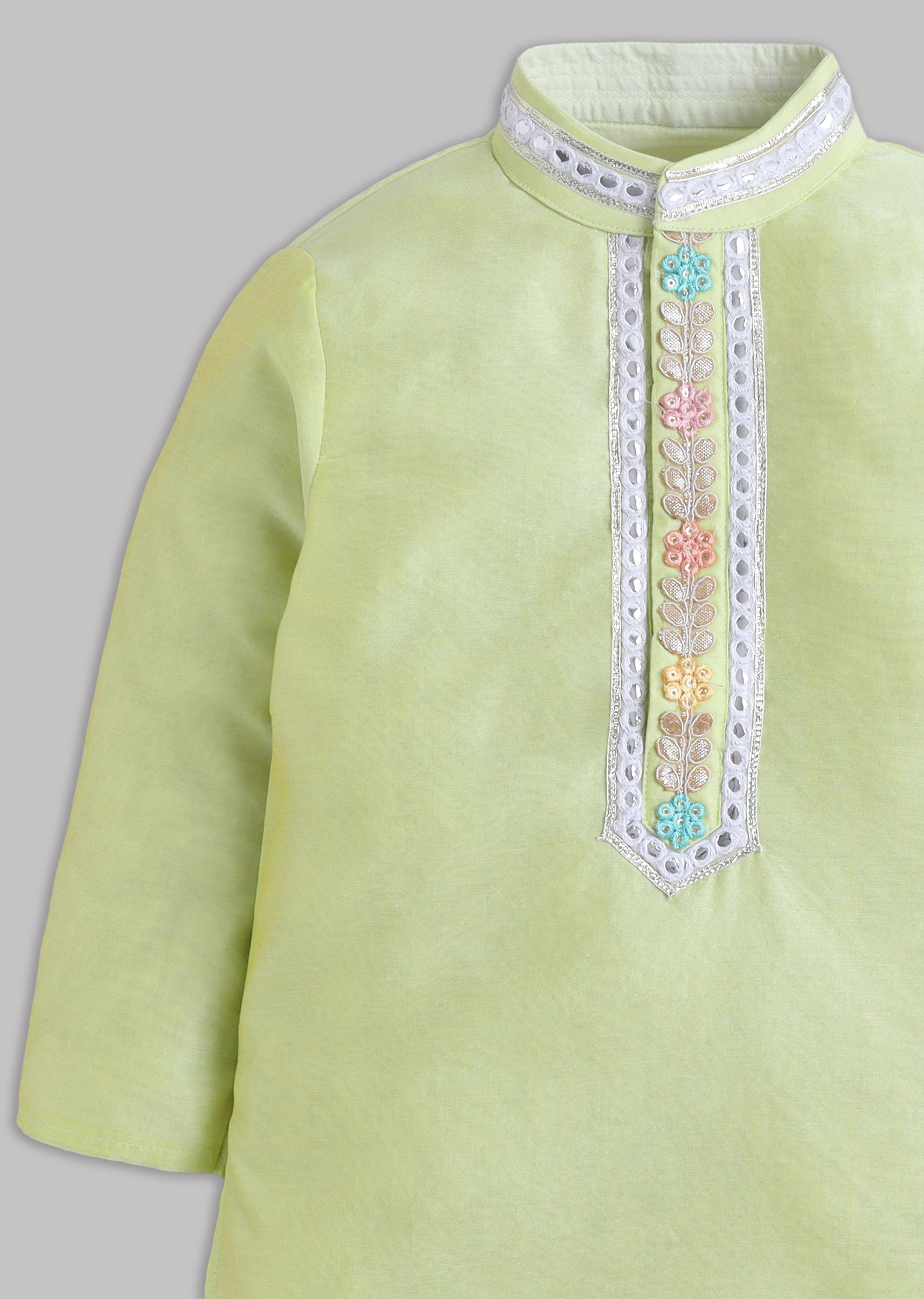A pastel green organza kurta set with gota patti detailing at the neckline for a delicate festive touch. Styled with full sleeves and a mandarin collar, paired with a coordinating... More Product Details