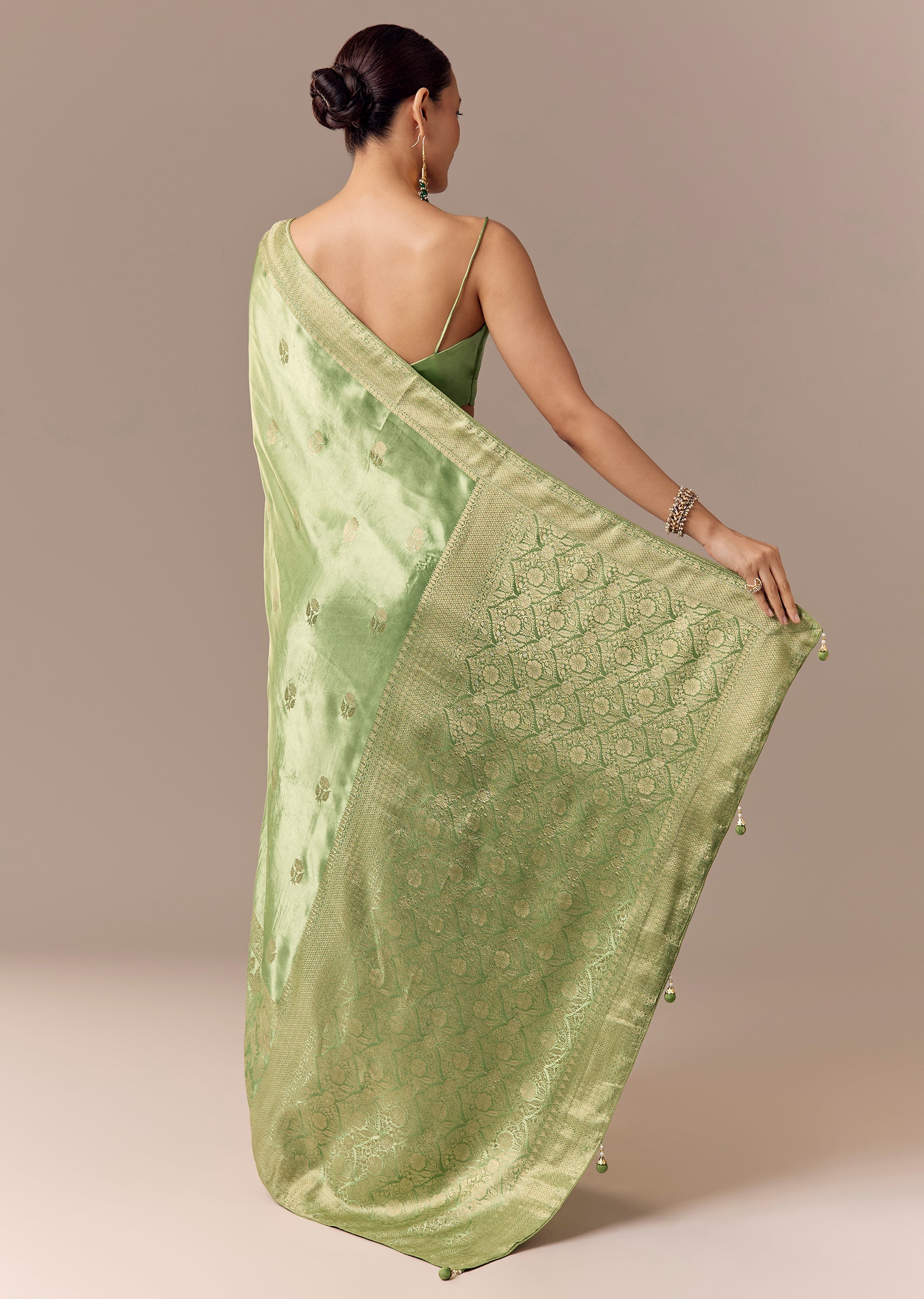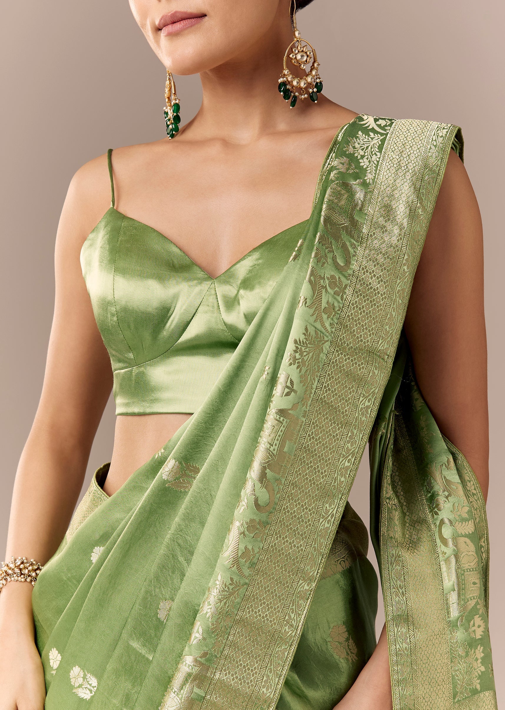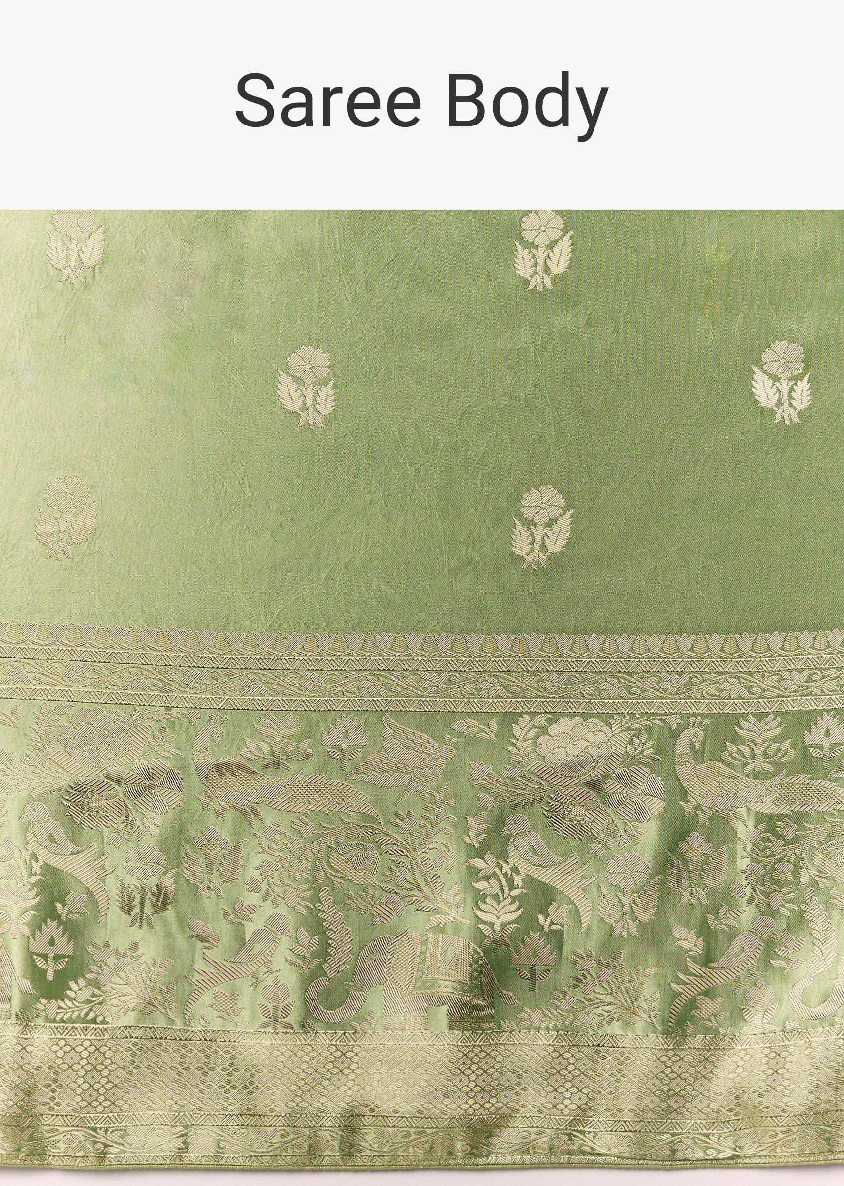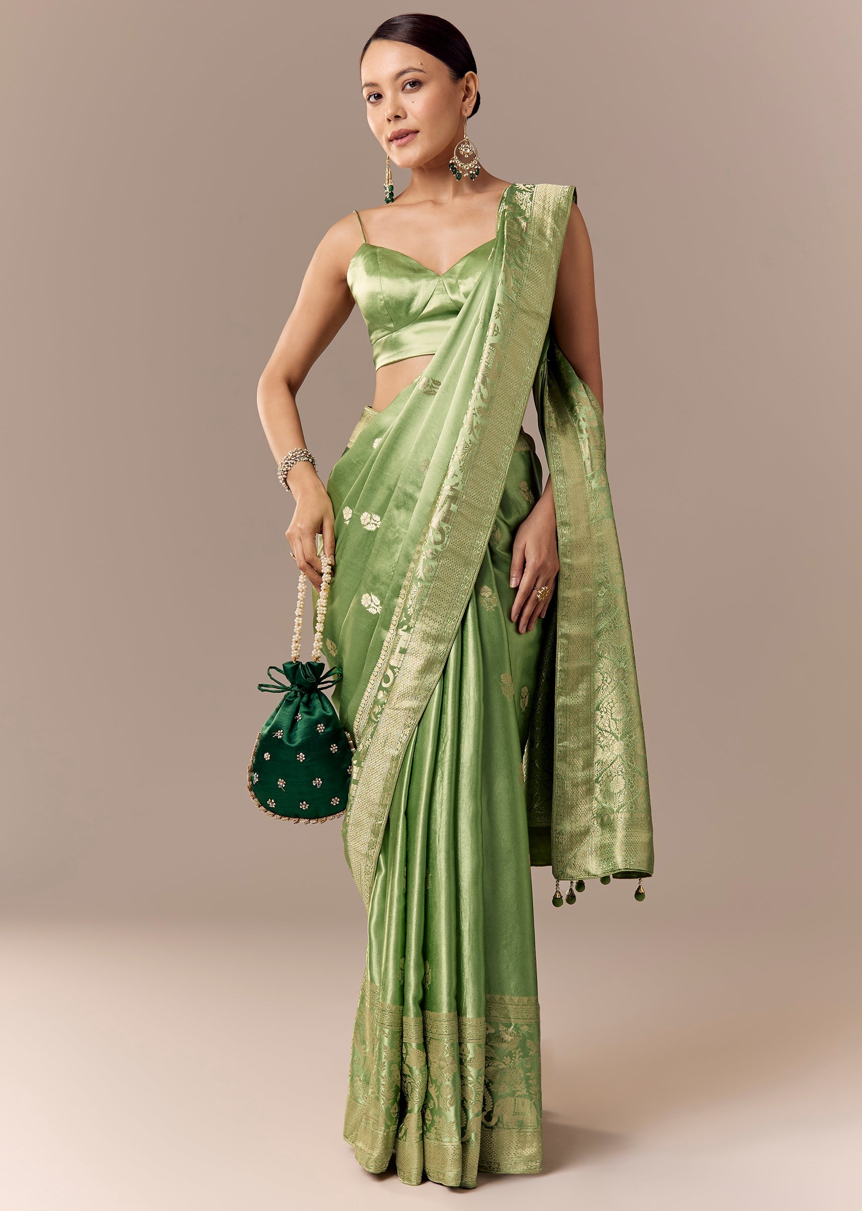 Pastel Green Satin Saree with Floral Zari Woven Border
