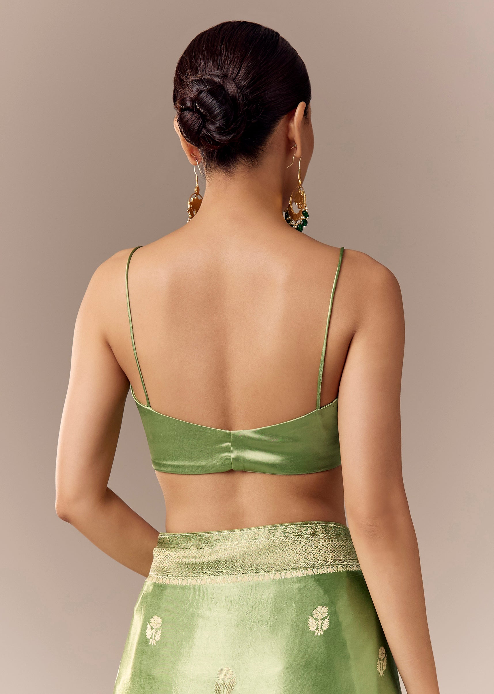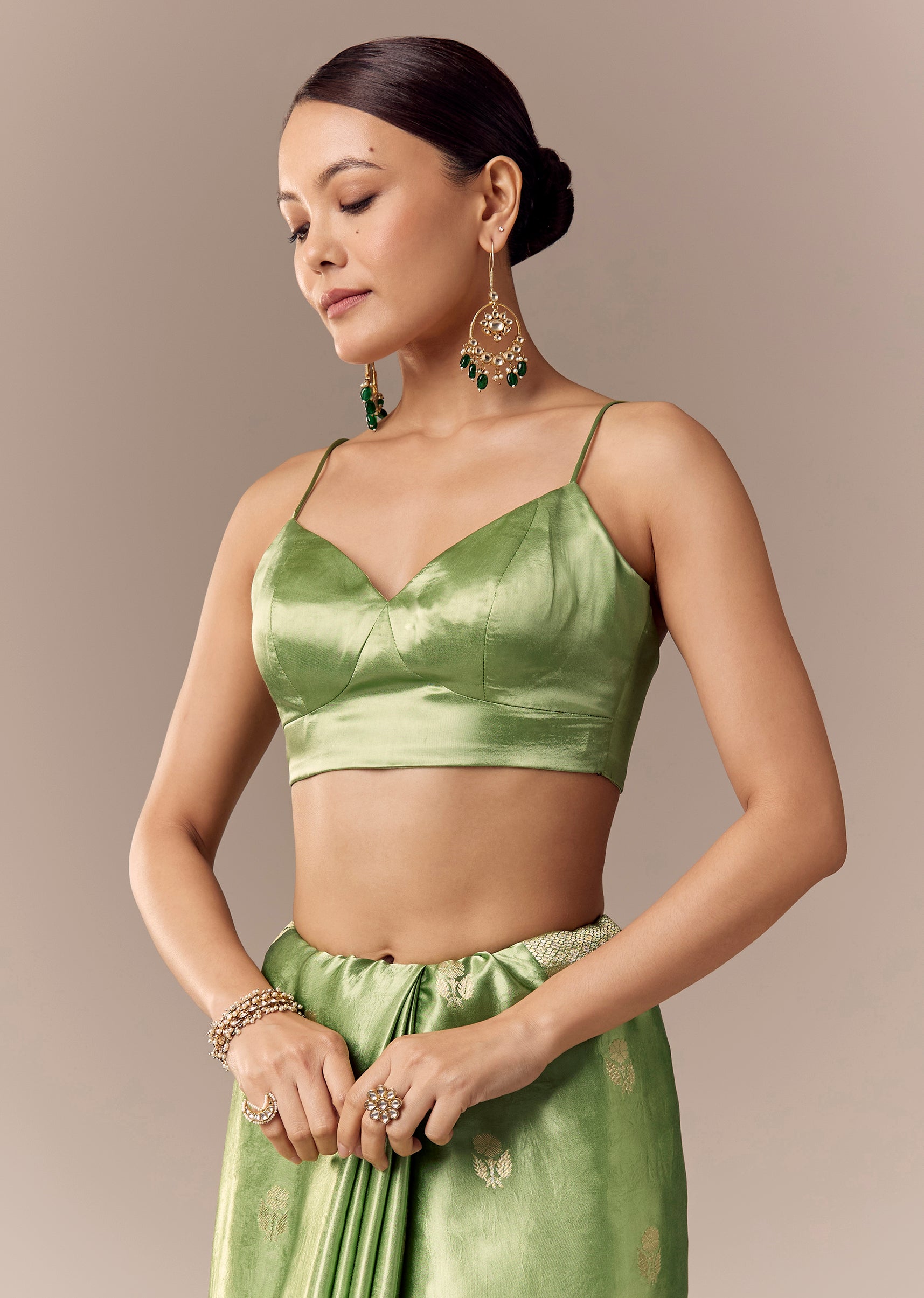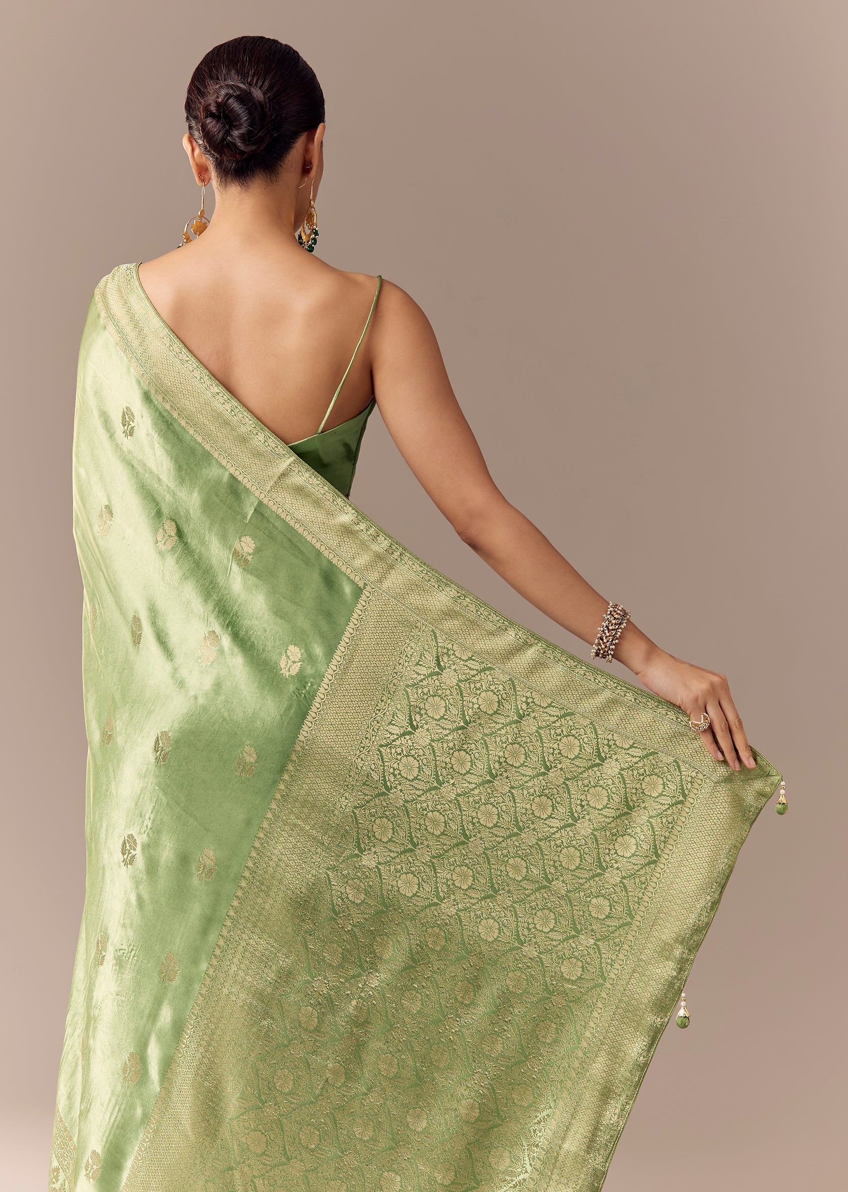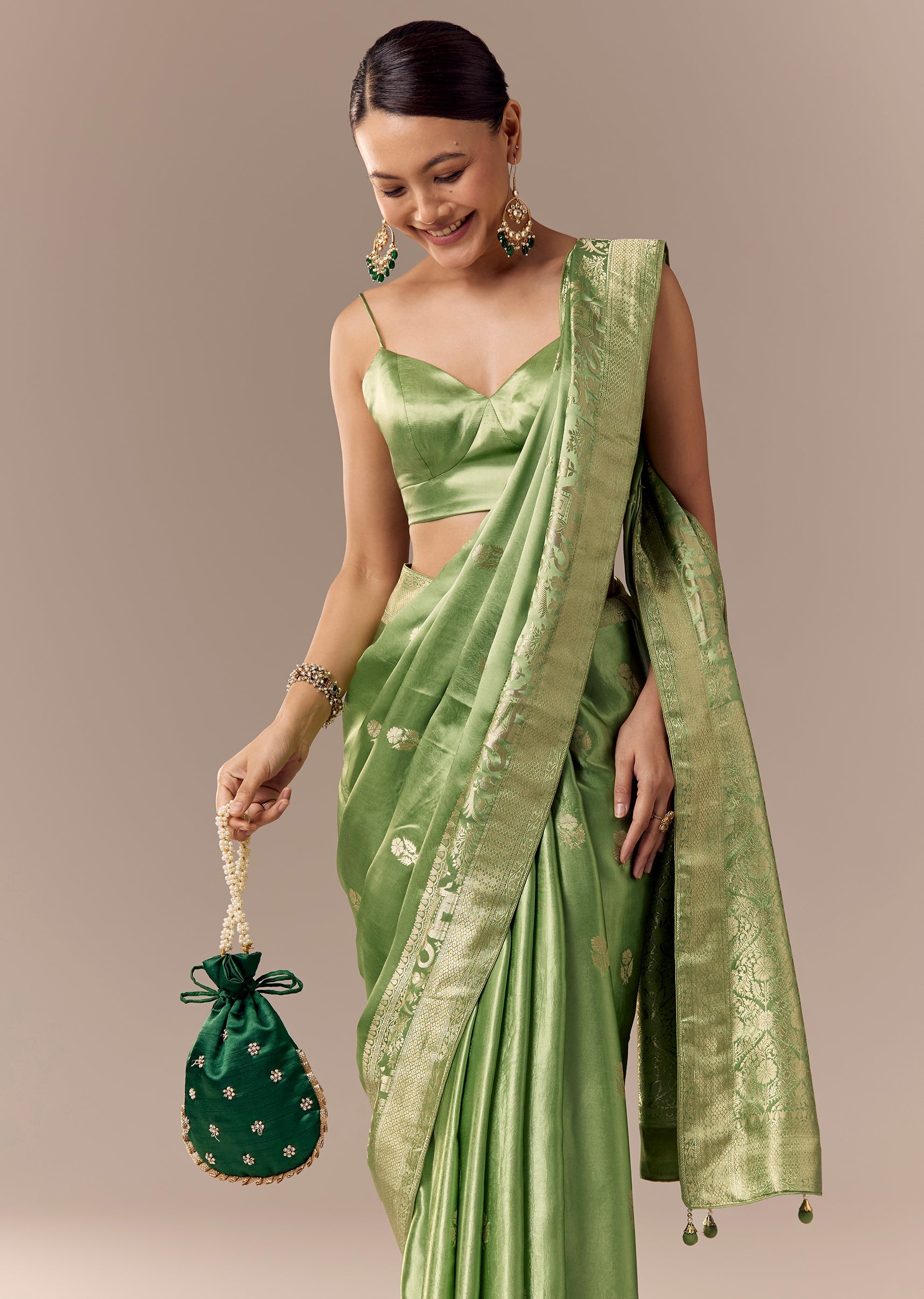 Pastel Green Satin Saree with Floral Zari Woven Border