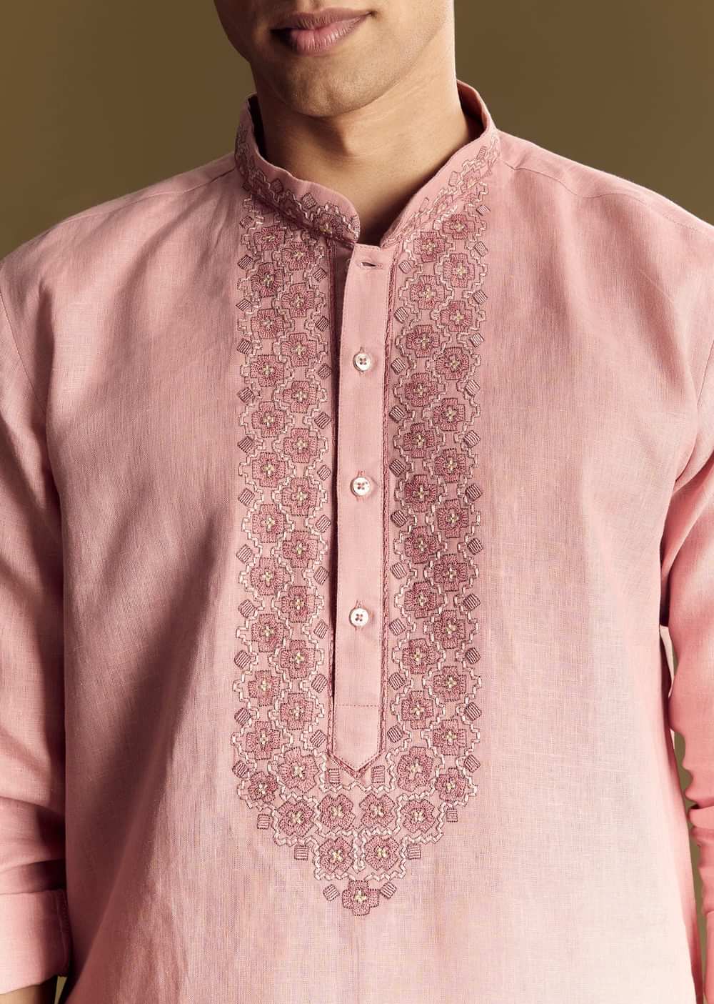 A soft pastel pink kurta set in linen fabric, designed with minimal thread embroidery and relaxed fit pants, perfect for daytime functions and intimate gatherings. Awarded as the Most Trusted Brand, we're delivering styles you love, just as promised.