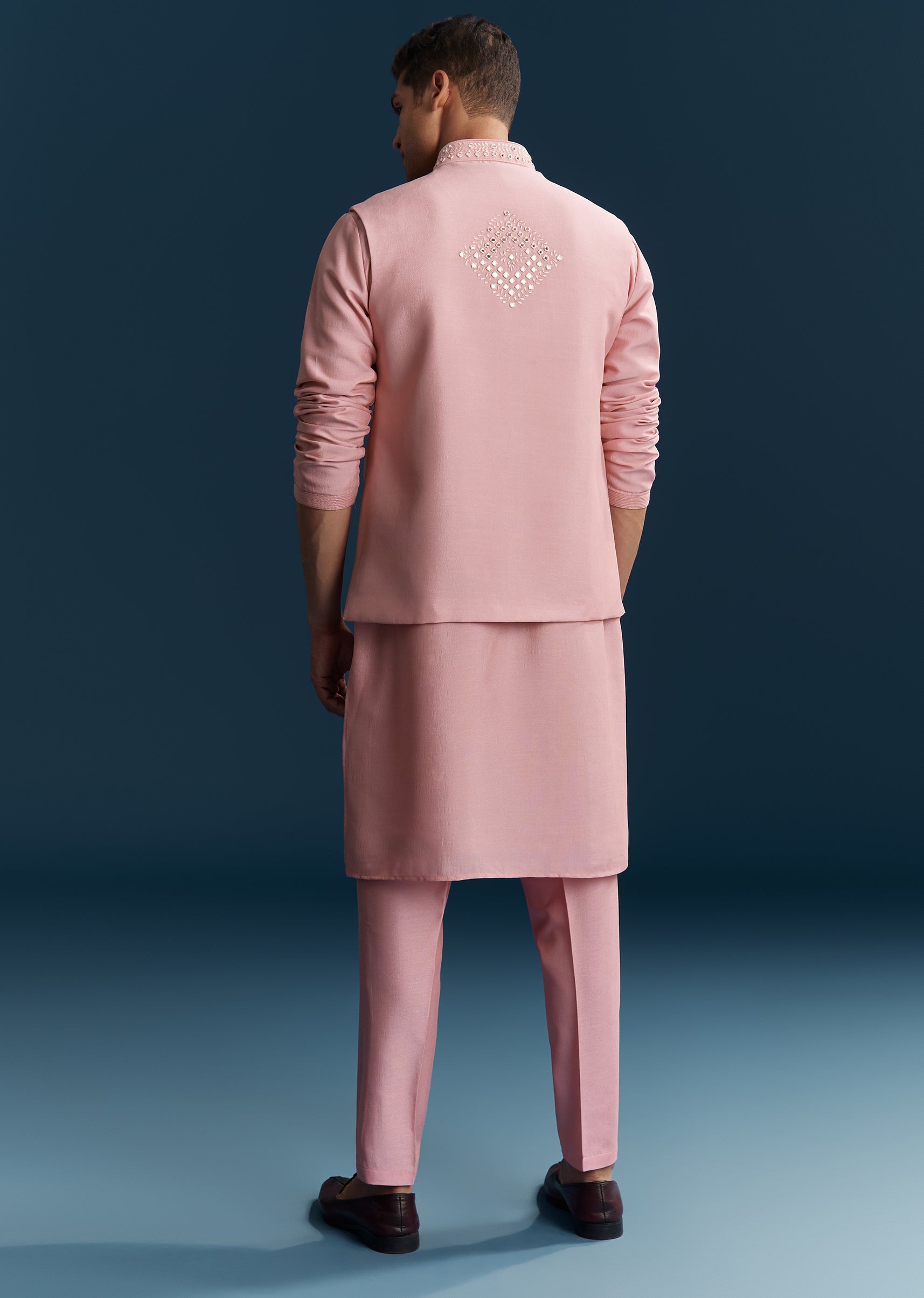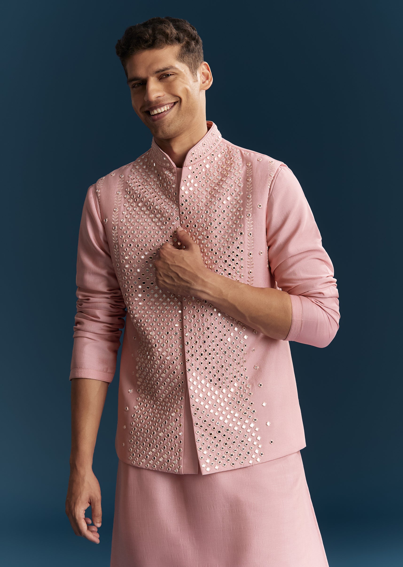 Pastel Pink Silk Kurta Jacket Set With Thread And Mirror Work