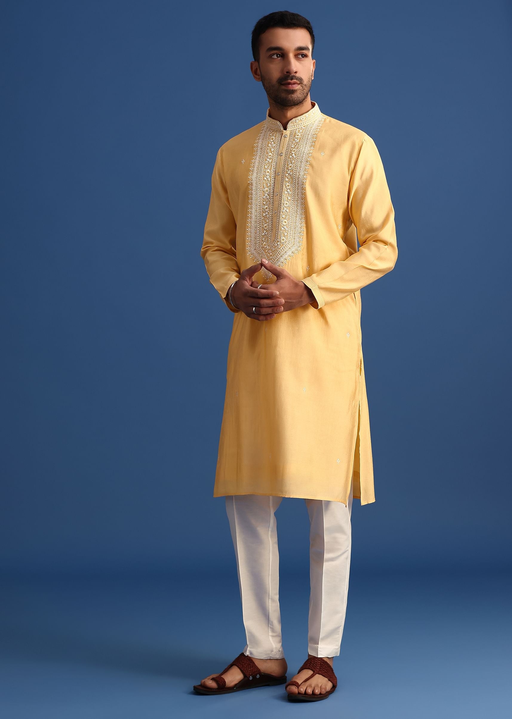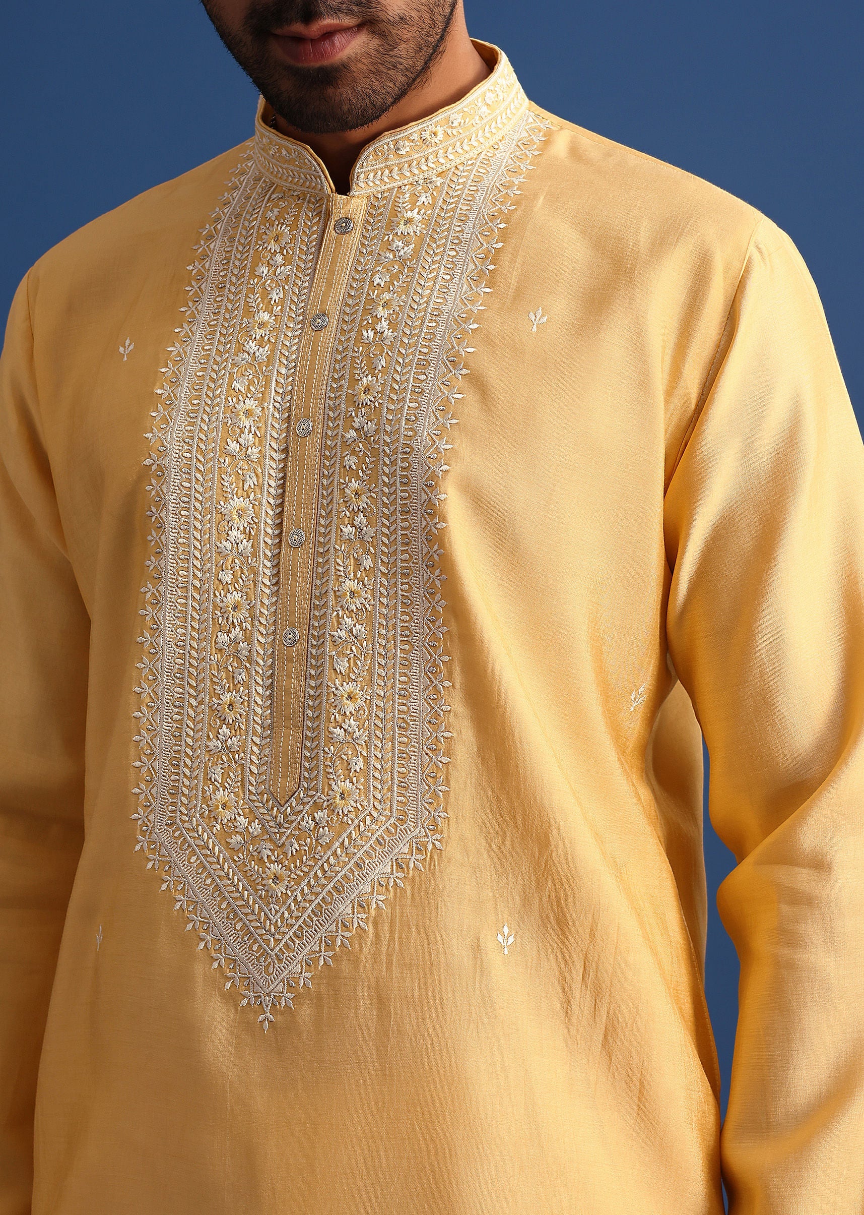 Pastel Yellow Hand Embroidered Kurta Set In Silk