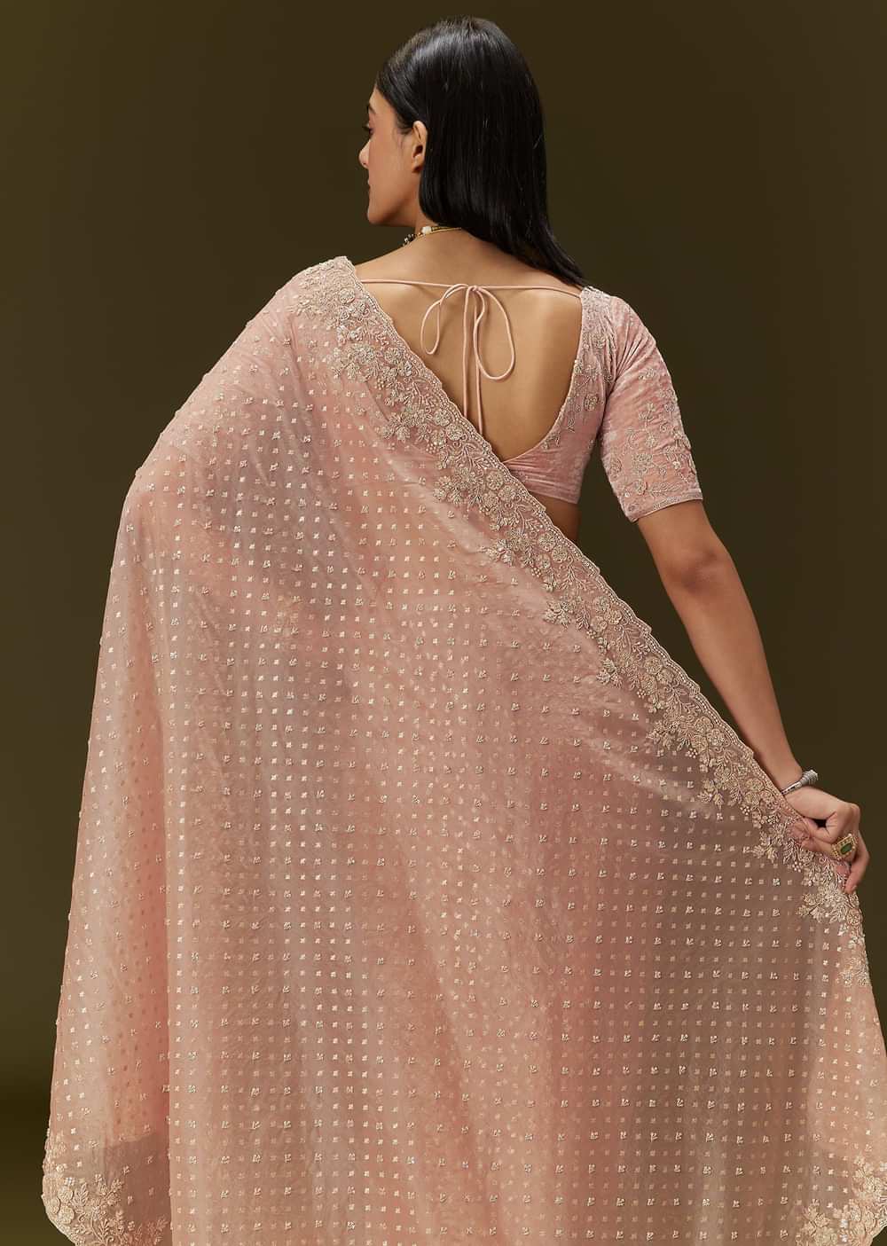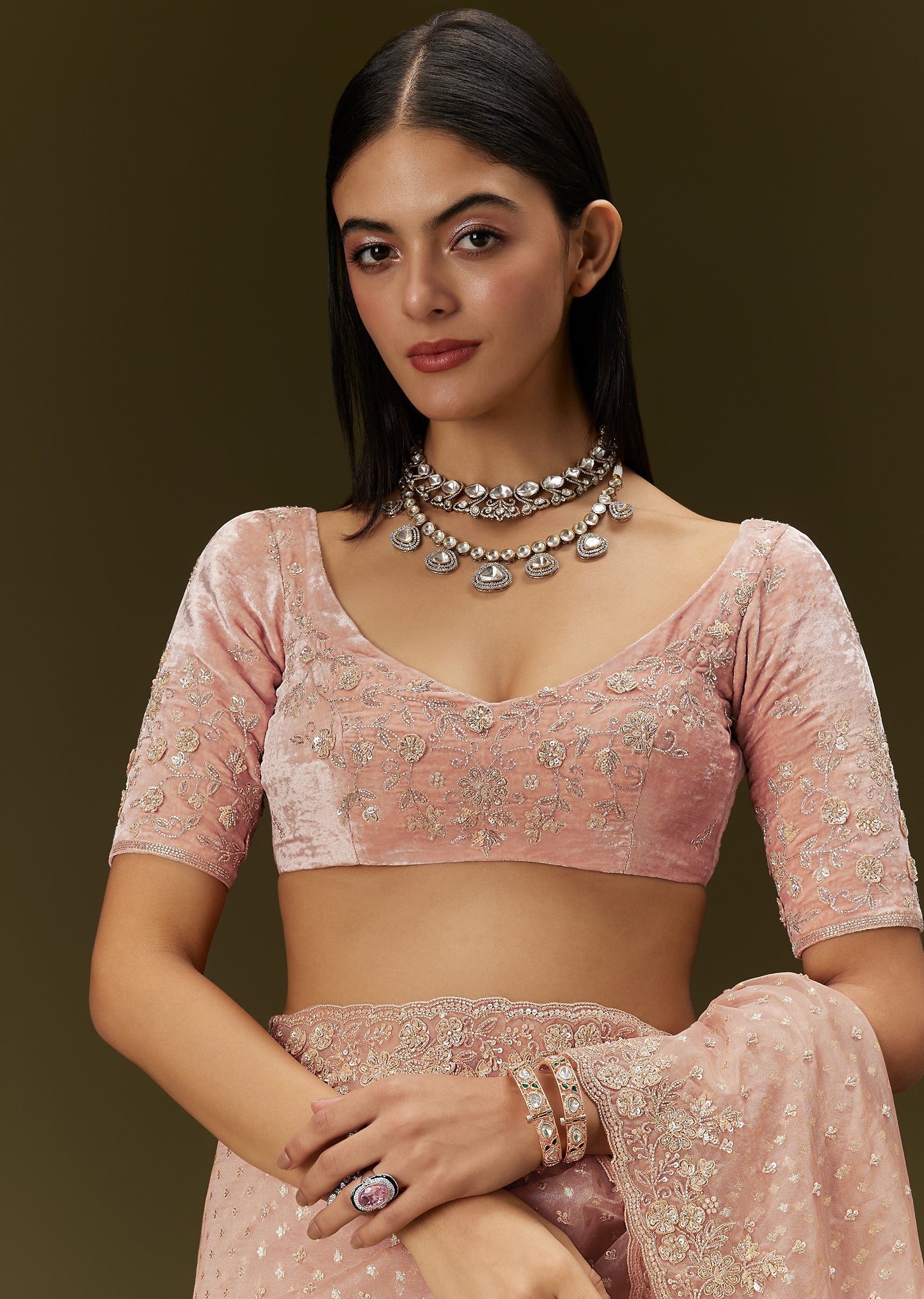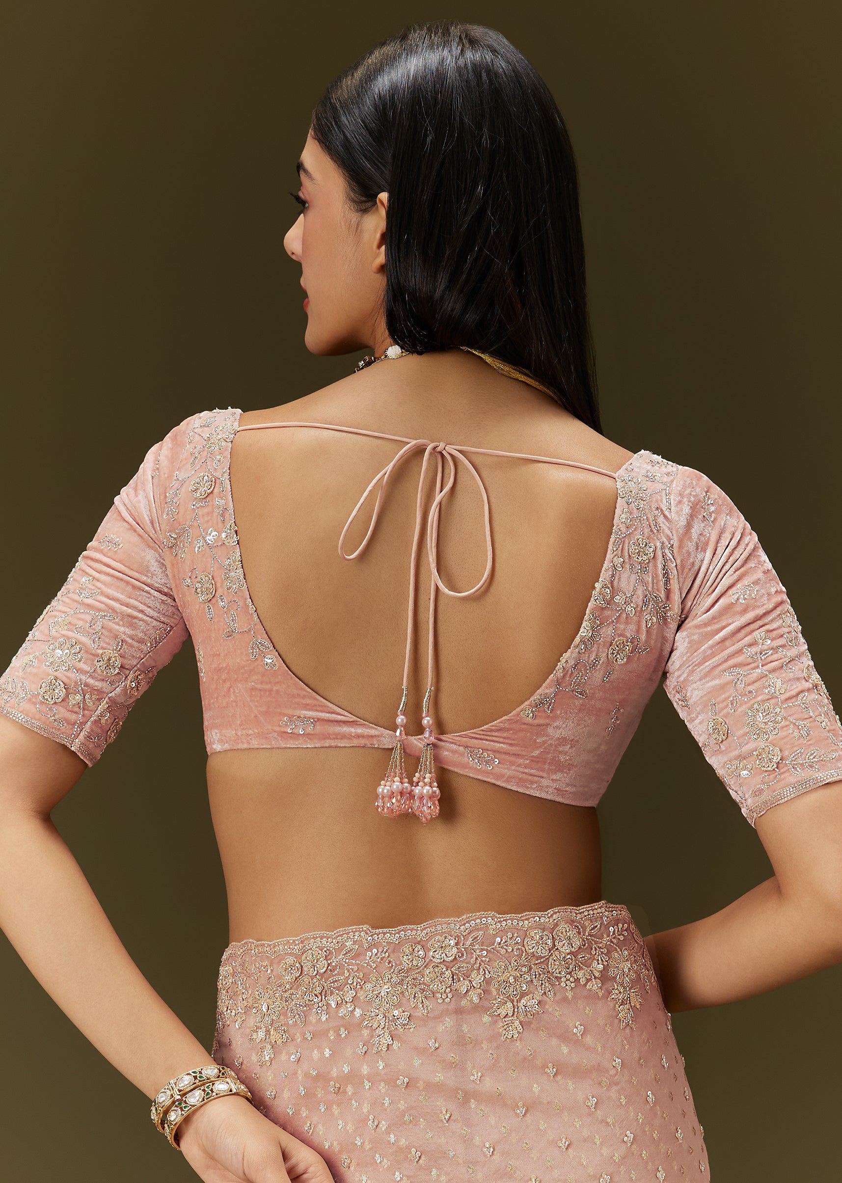 Peach Banarasi Tissue Saree With Velvet Embroidered Blouse