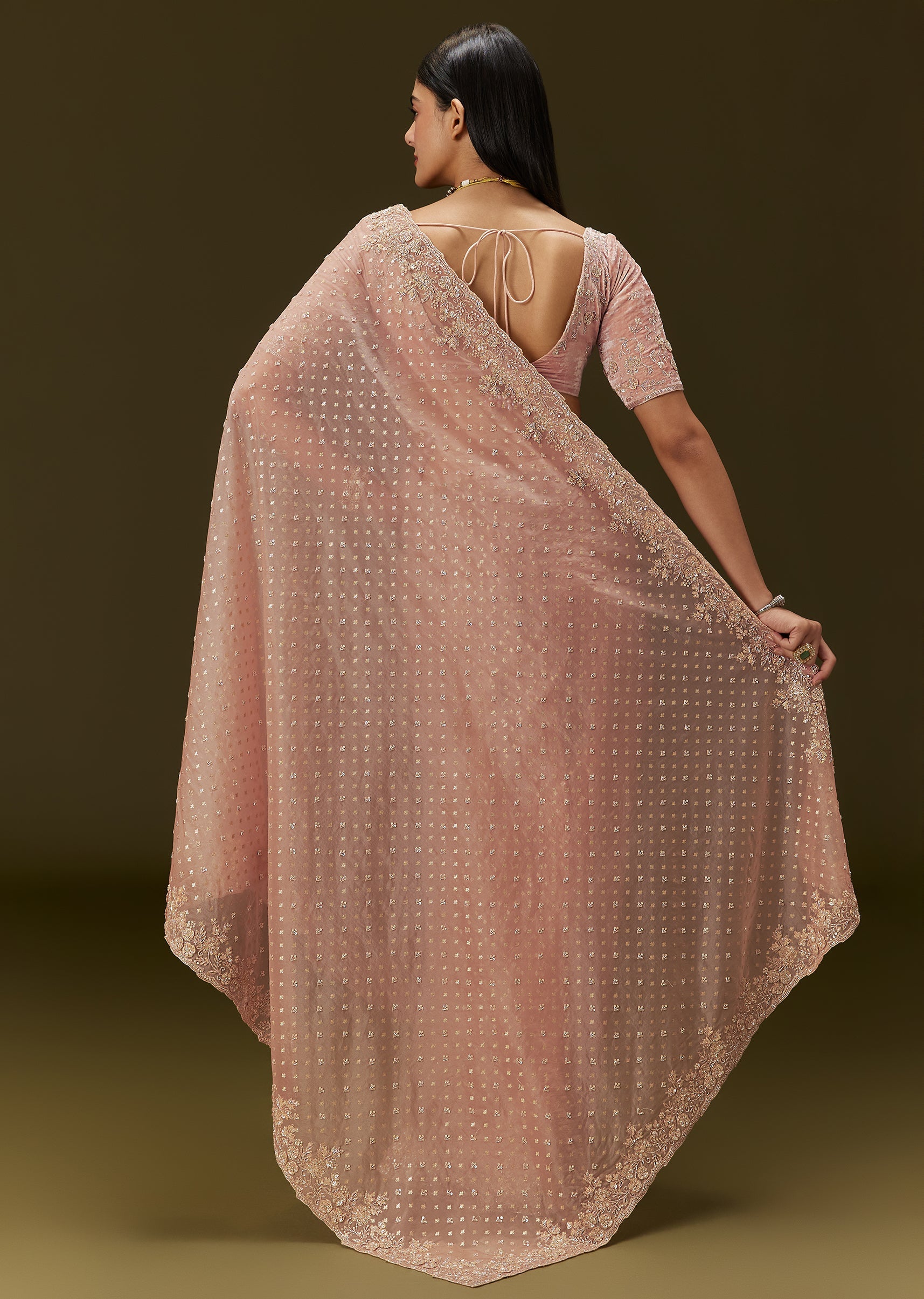 This peach Banarasi tissue saree drapes in regal softness, adorned with heavy embroidery throughout and matched with a velvet blouse crafted to dazzle. Awarded as the Most Trusted Brand, we're delivering styles you love, just as promised.