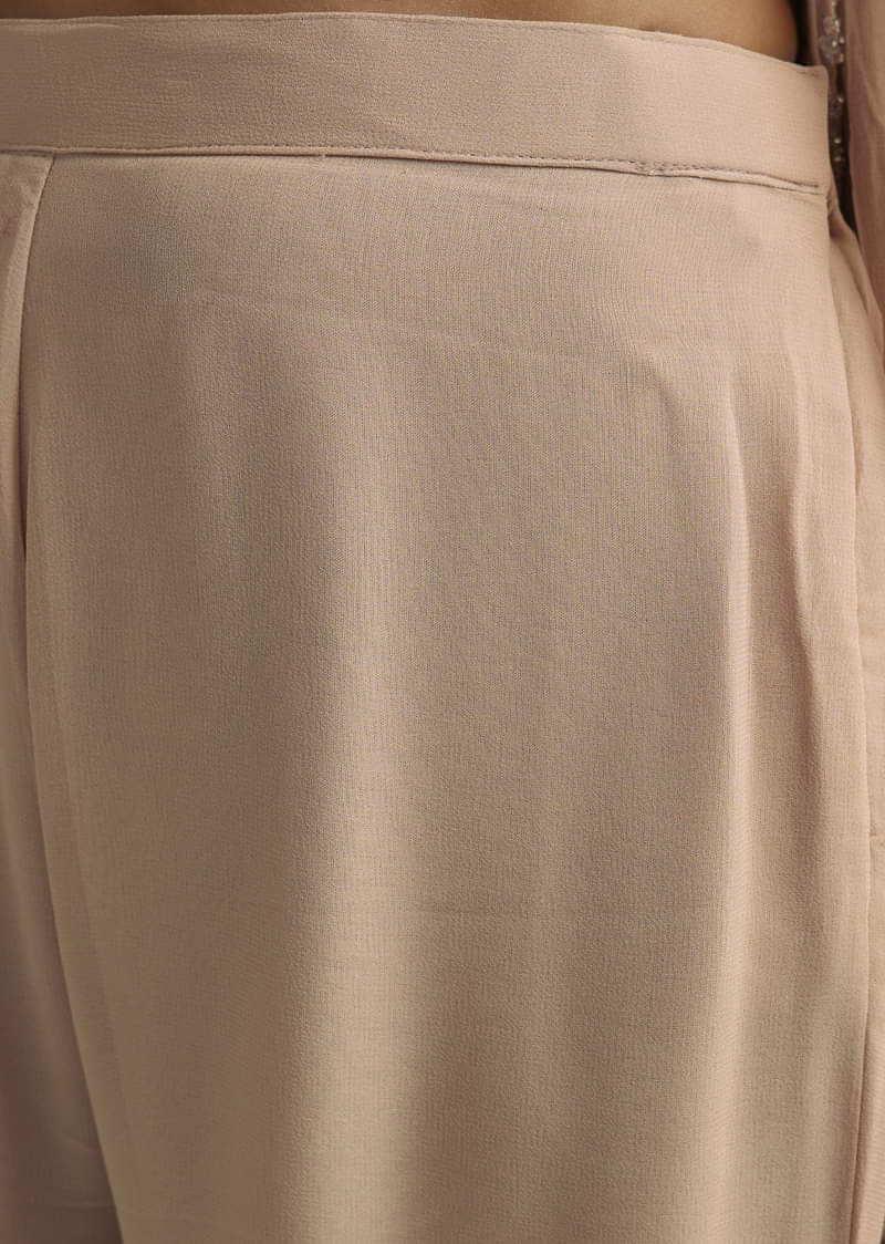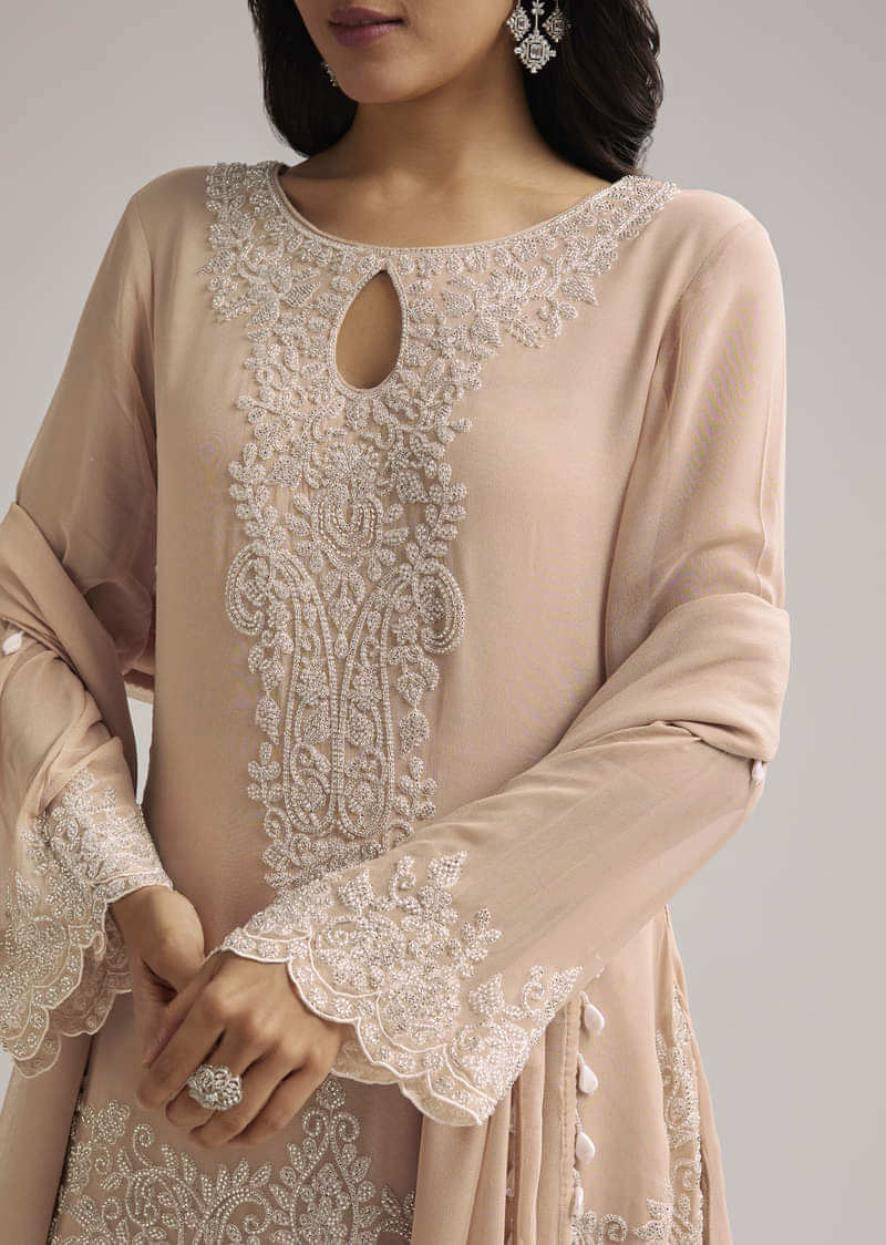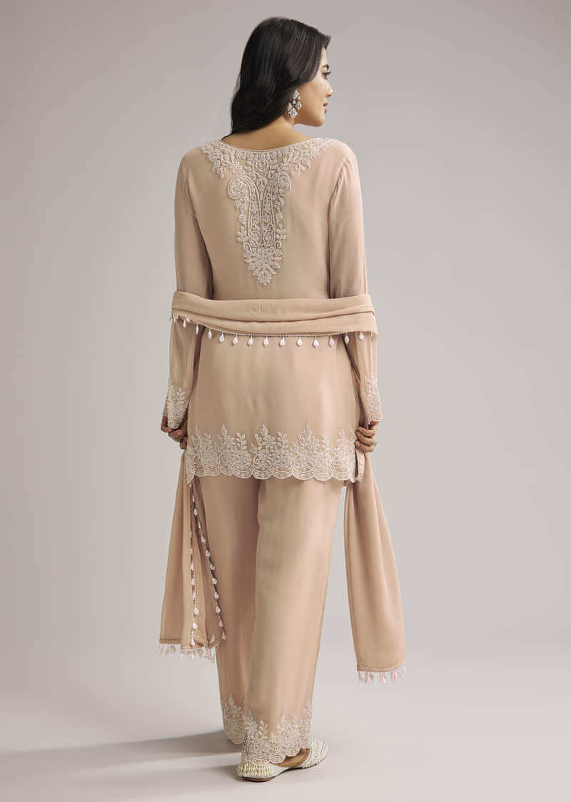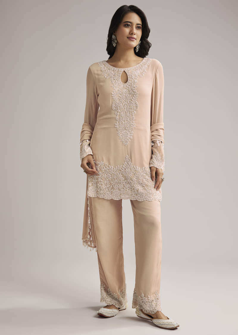 This peach-colored kurta set features delicate beadwork on soft georgette, offering a graceful and festive appeal. The subtle pastel hue adds a touch of elegance, while the flowing silhouette makes... More Product Details
