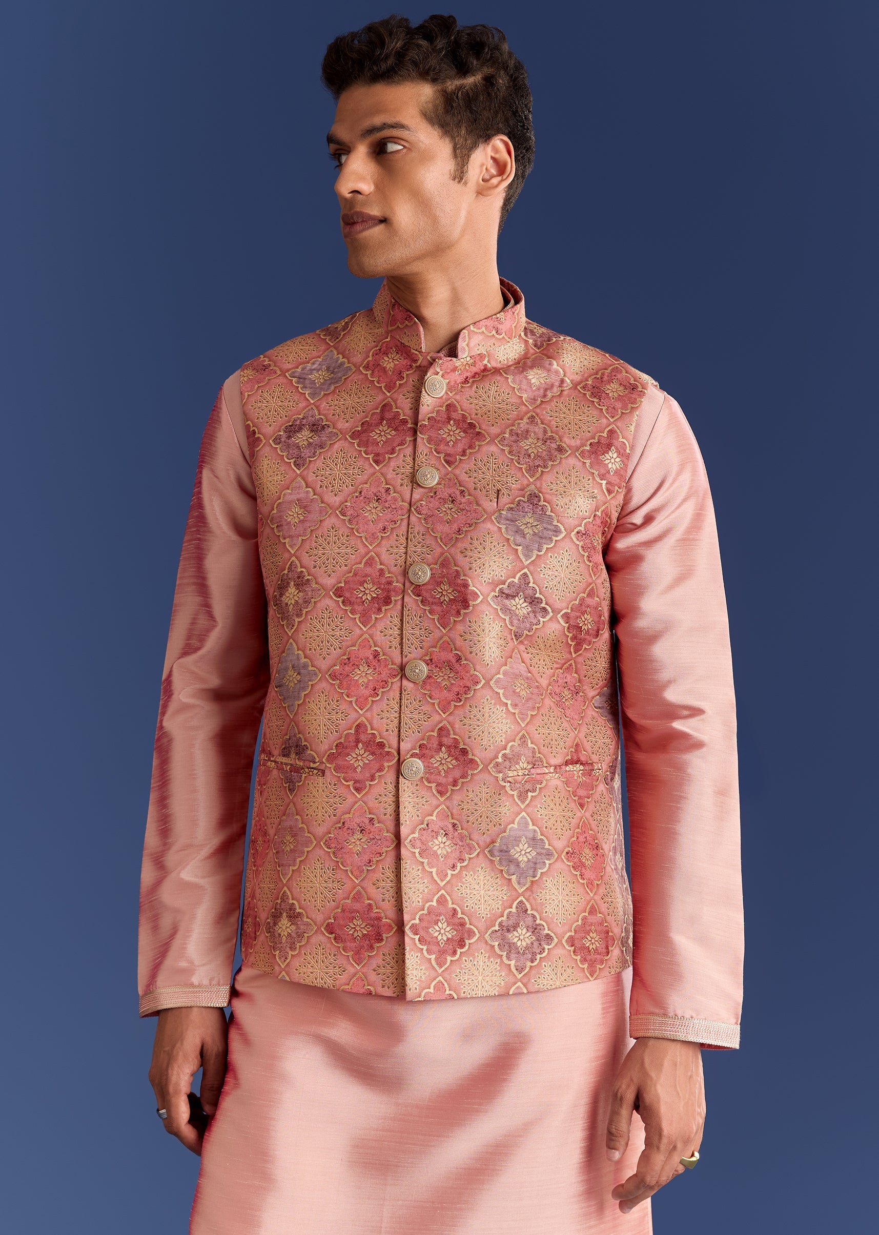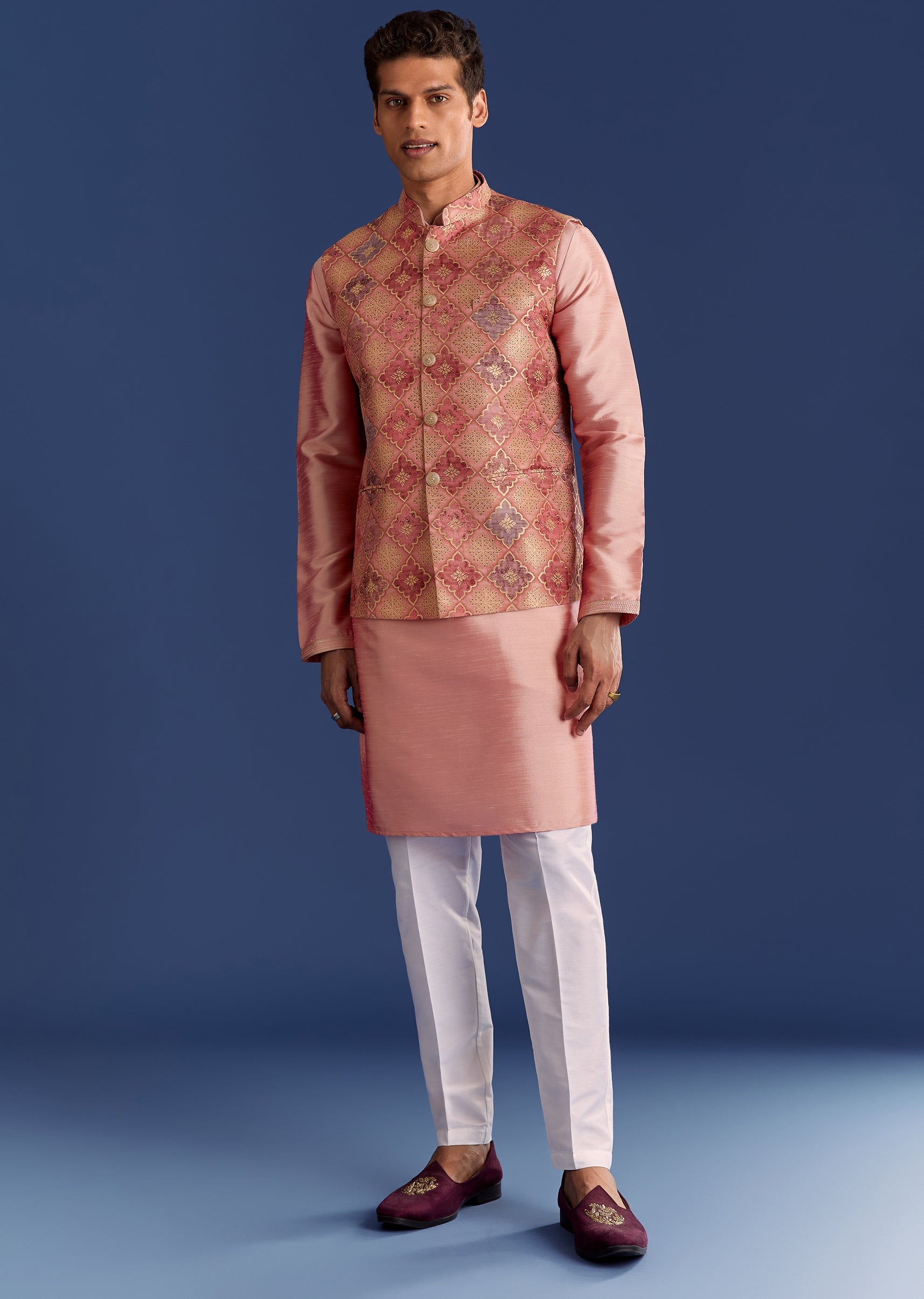 Peach Brocade Kurta Jacket Set With Geometric Print