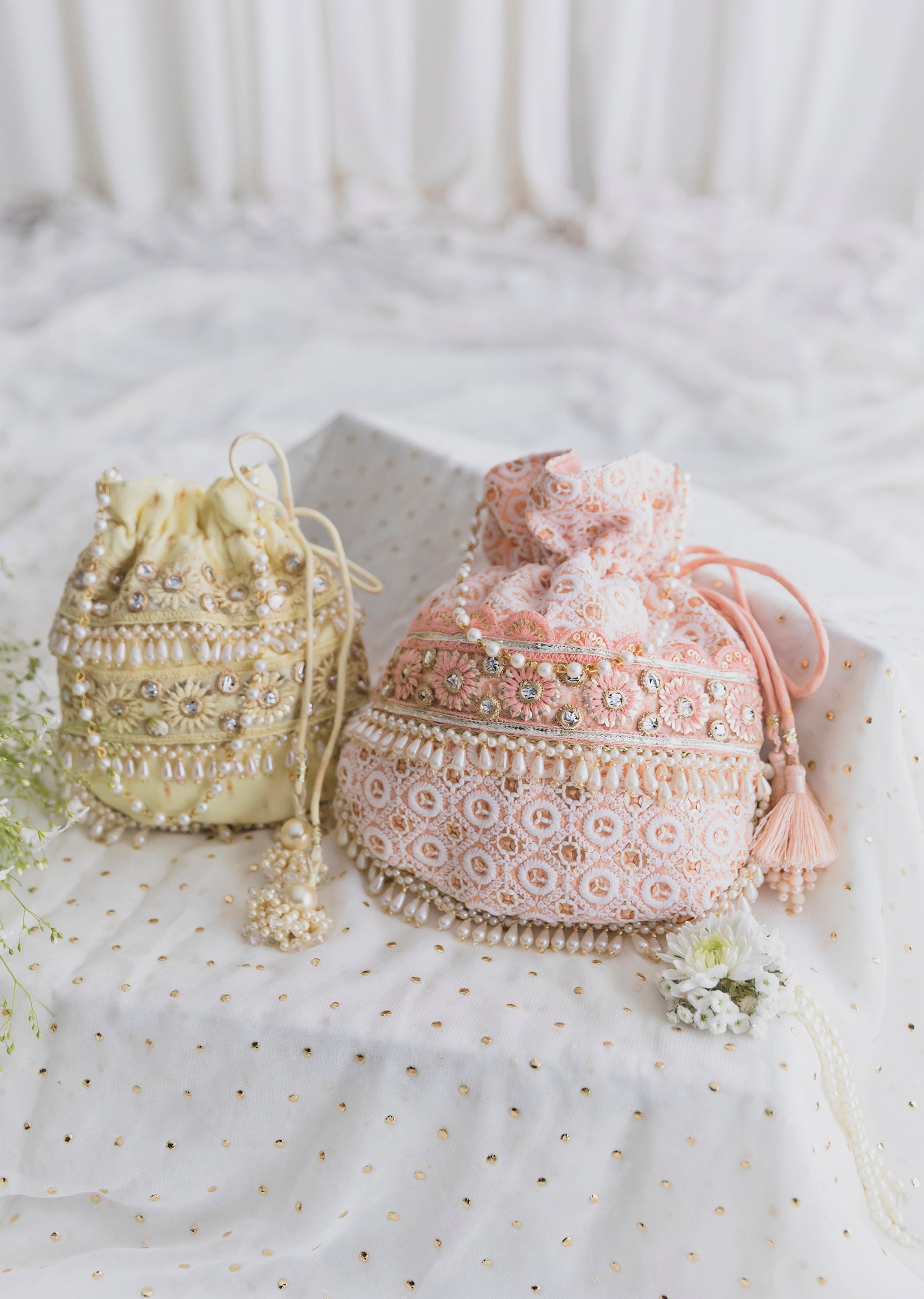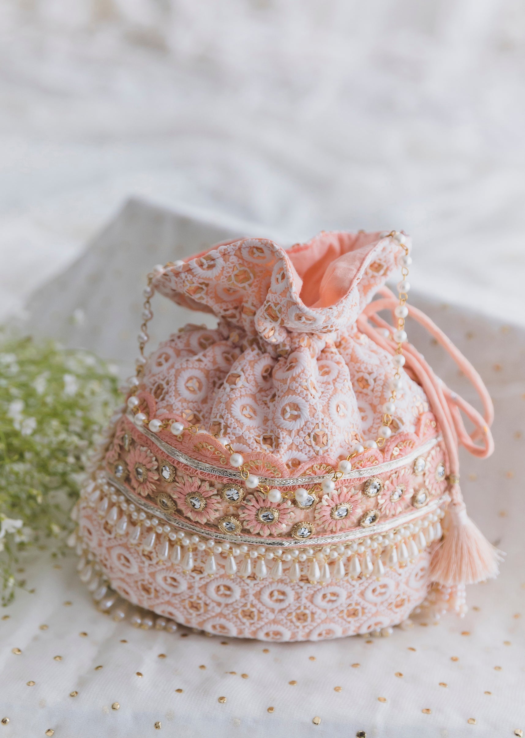Soft and feminine, this peach cotton potli features delicate embroidery in a classic potli shape—perfect for pastel season festivities. A sweet finishing touch for mehendi, pooja and daytime events. Awarded as the Most Trusted Brand, we're delivering styles you love, just as promised.