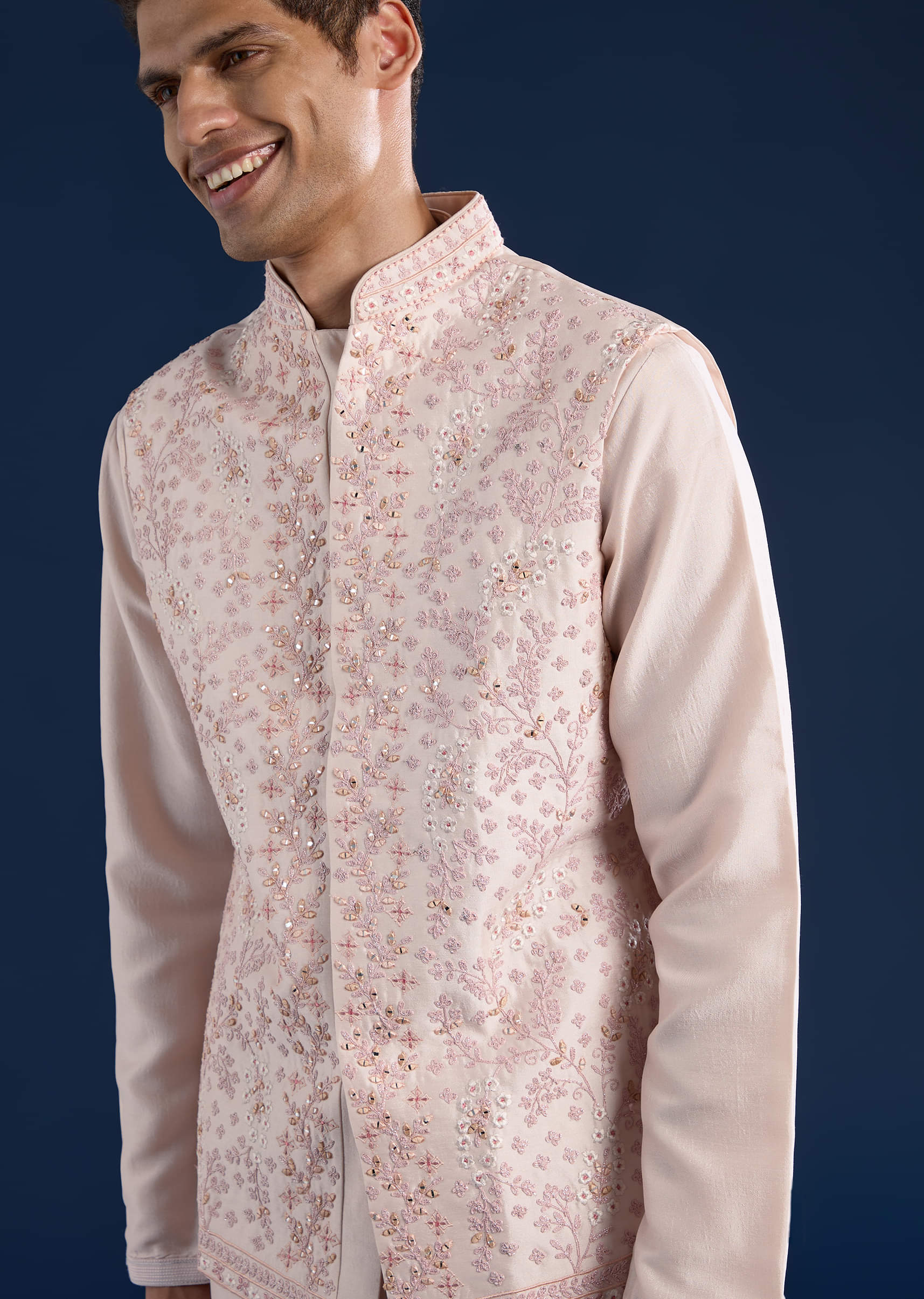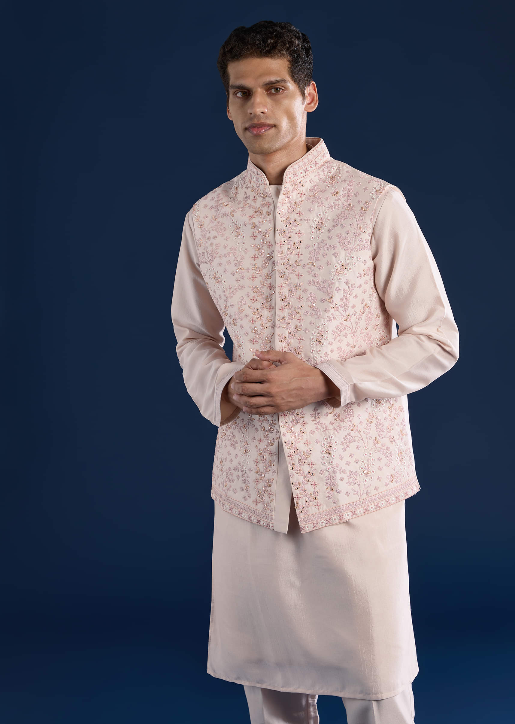 An elevated take on classic elegance, this peach cotton silk jacket and kurta set with coordinated pants embodies refined sophistication. Intricate mirror, thread, and resham lend depth and delicate shimmer... More Product Details