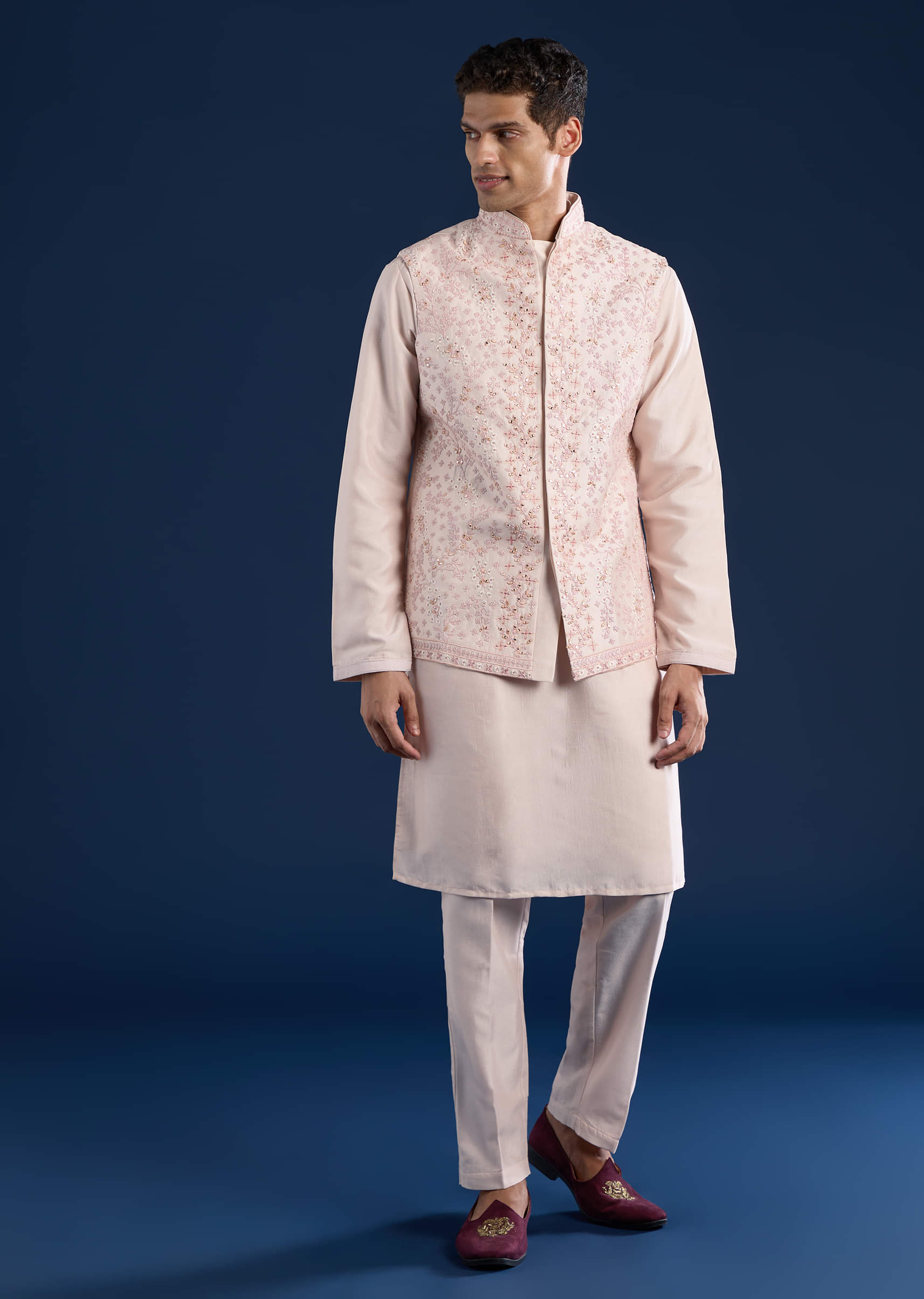 An elevated take on classic elegance, this peach cotton silk jacket and kurta set with coordinated pants embodies refined sophistication. Intricate mirror, thread, and resham lend depth and delicate shimmer to the lustrous silk fabric. Ideal for weddings, festive gatherings, and grand celebrations, this ensemble seamlessly blends heritage craftsmanship with contemporary poise. Awarded as the Most Trusted Brand, we're delivering styles you love, just as promised.
