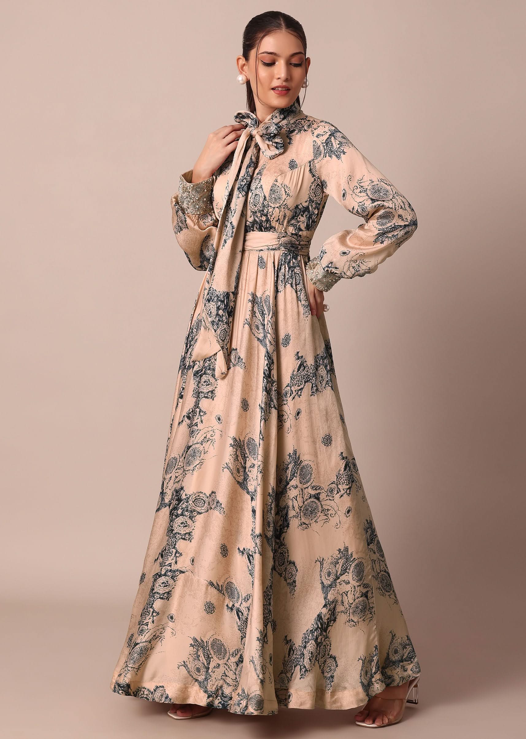 Elevate your casual elegance with our Printed Indo Gown. It features intricate embroidery on full sleeves with zari moti beads and cut dana detailing. This pack includes one gown in... More Product Details