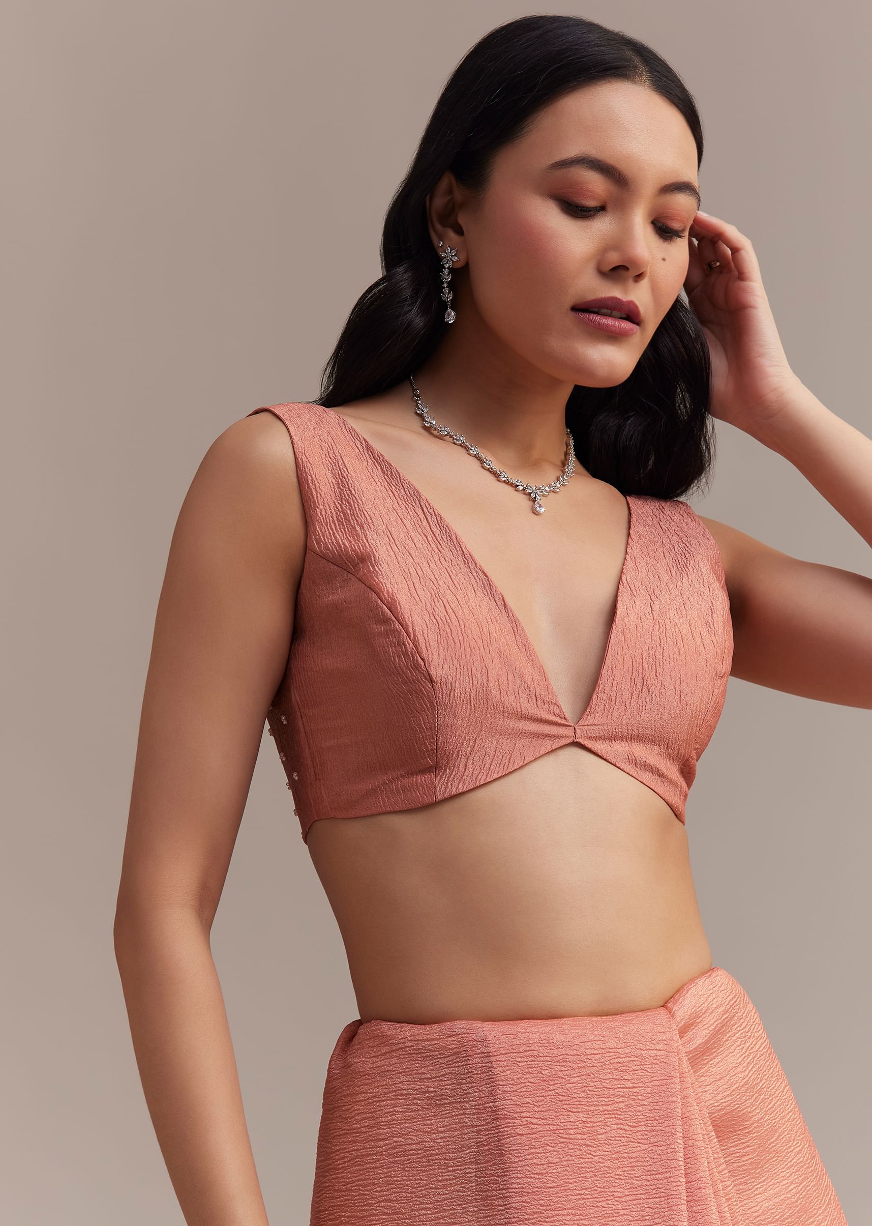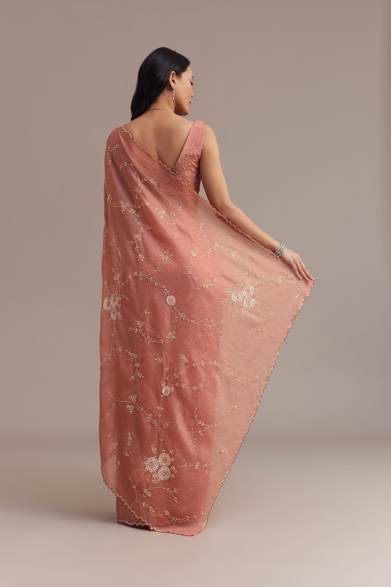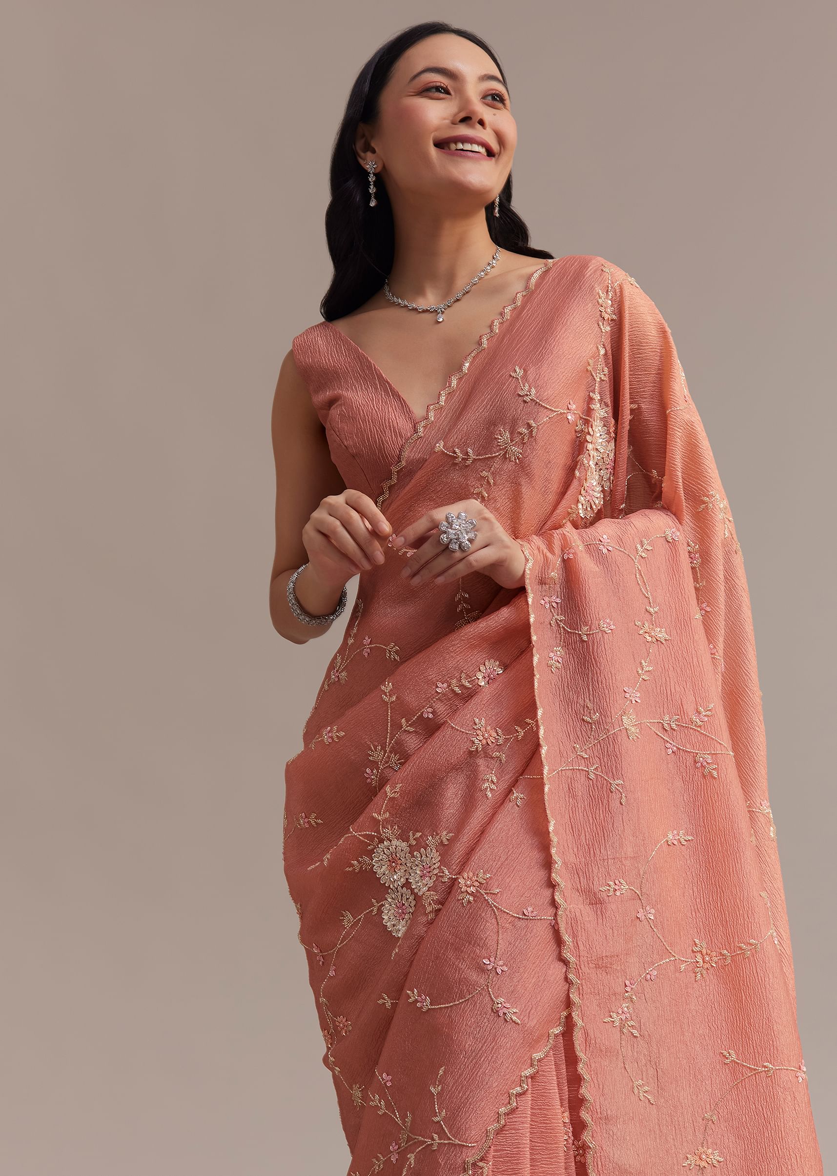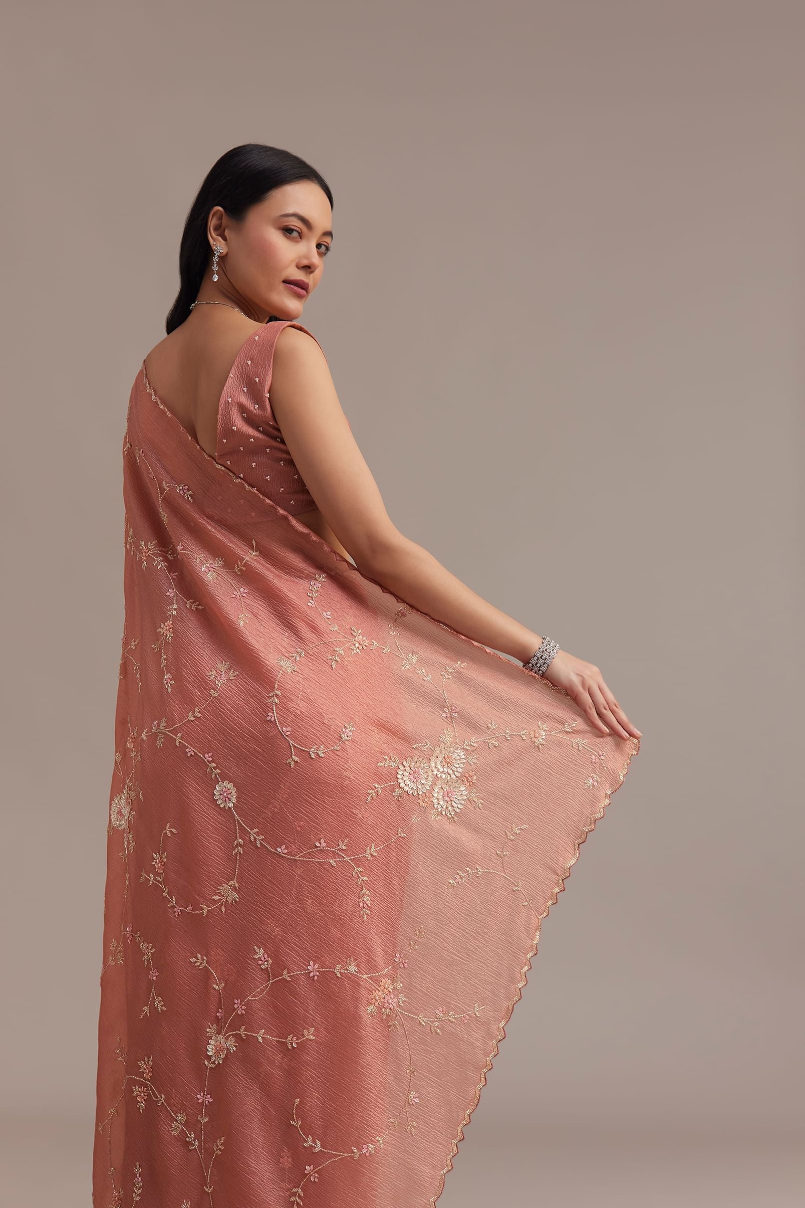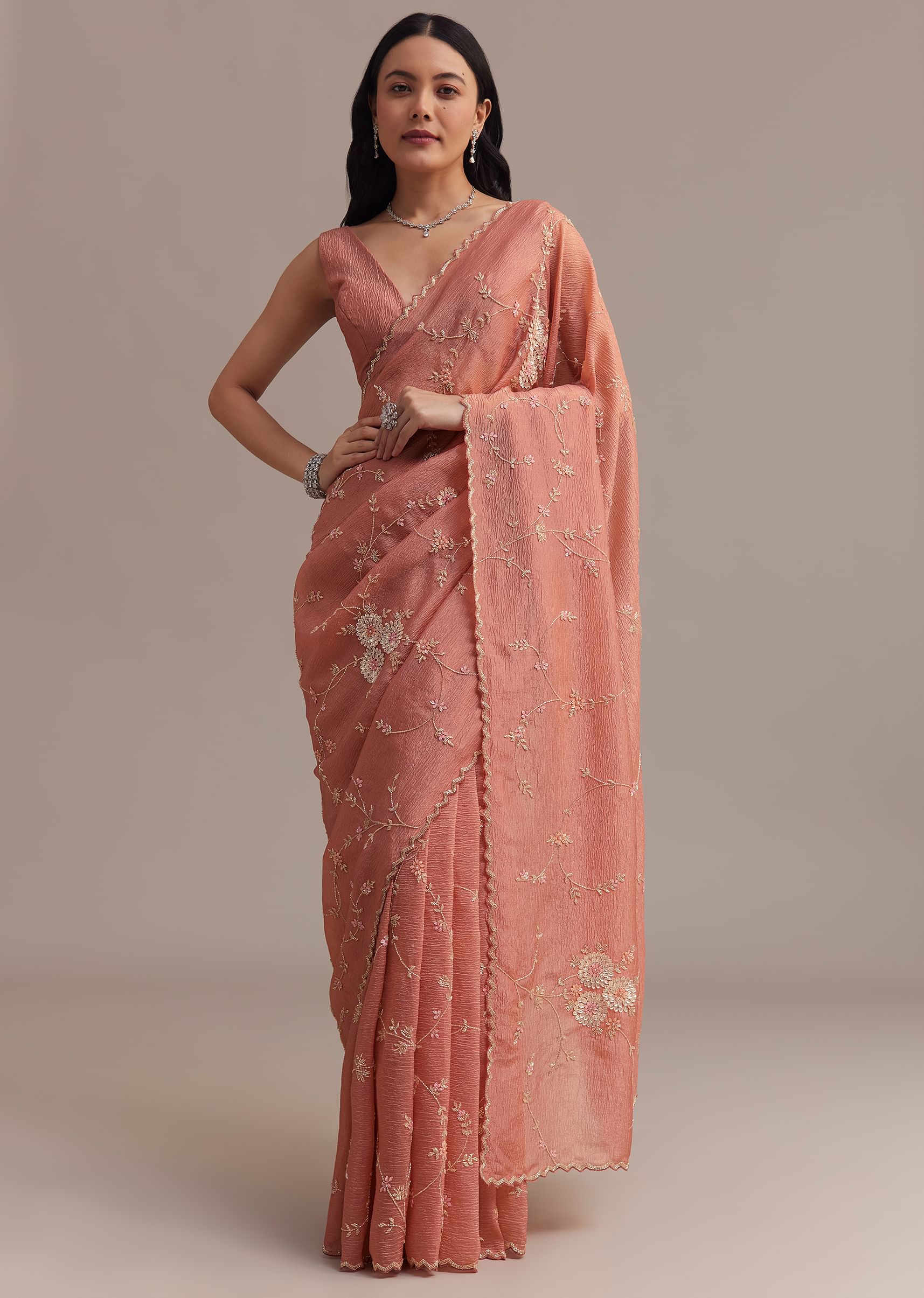 - A Vision Of Elegance This Peach Crushed Tissue Saree Is Adorned With Intricate Cutdana And Sequins Jaal Work.