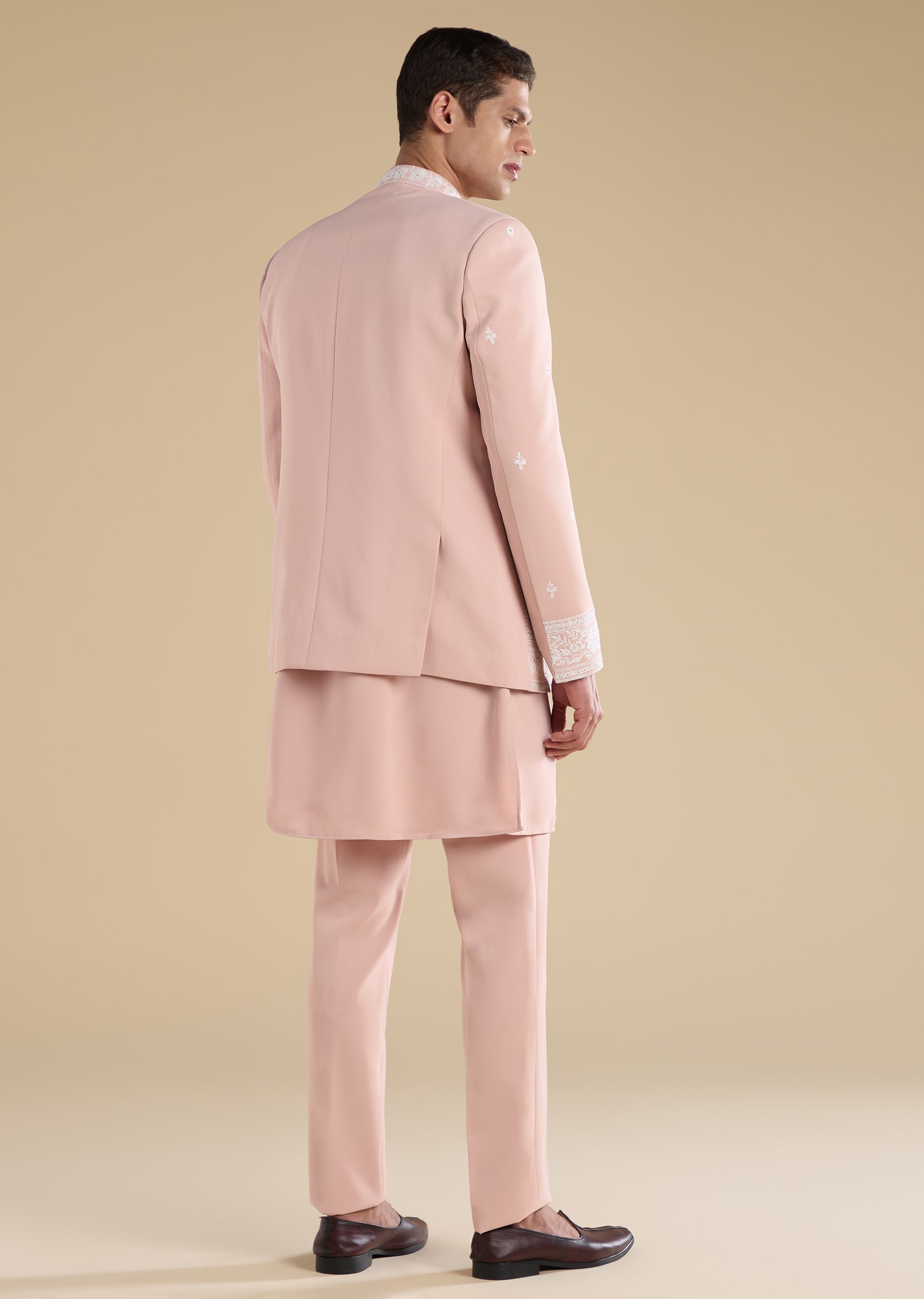 Tailored in suiting fabric, this peach jodhpuri set features thread embroidery with motif accents and sequin detailing. Finished with a mandarin collar, full sleeves and button with hook-eye closure, it... More Product Details