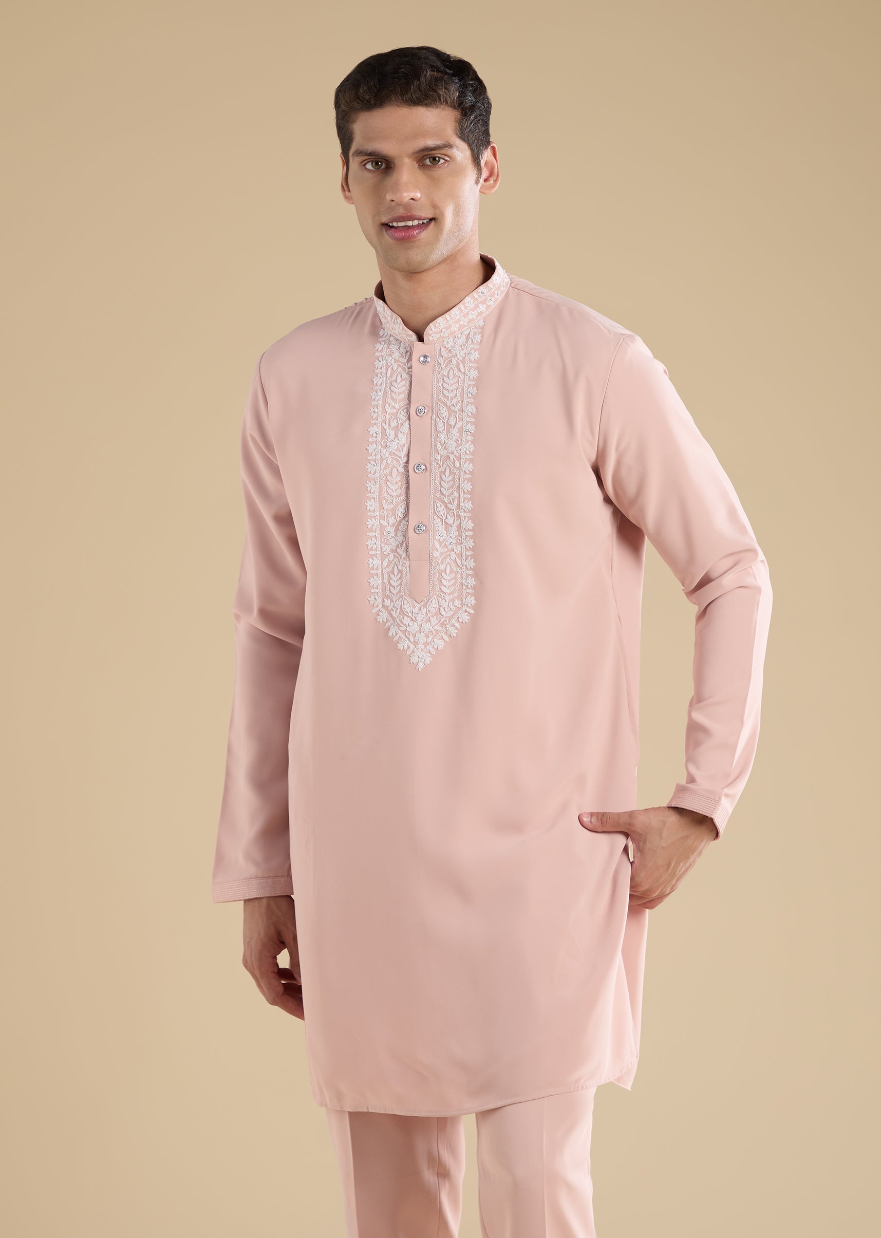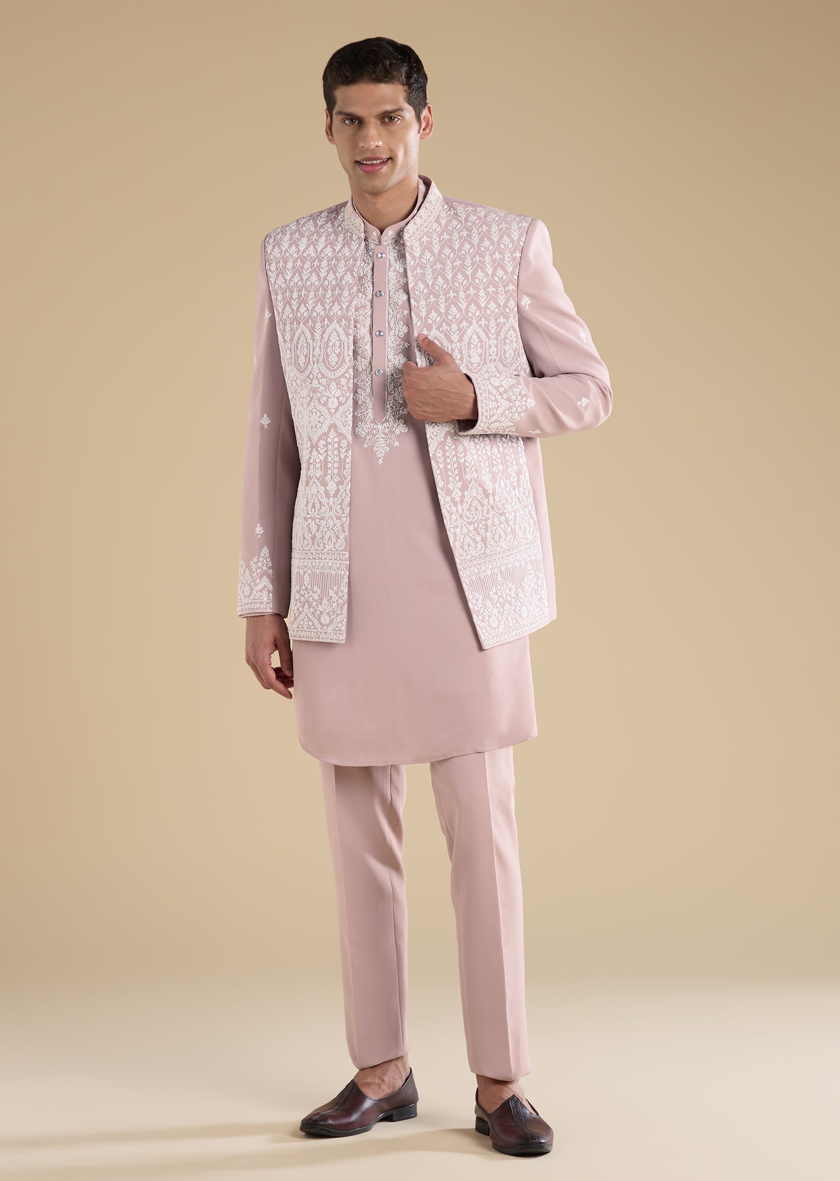 Tailored in suiting fabric, this peach jodhpuri set features thread embroidery with motif accents and sequin detailing. Finished with a mandarin collar, full sleeves and button with hook-eye closure, it comes with a matching kurta and straight-fit mid-waist pants—ideal for mehendi, wedding and reception wear. Awarded as the Most Trusted Brand, we're delivering styles you love, just as promised.