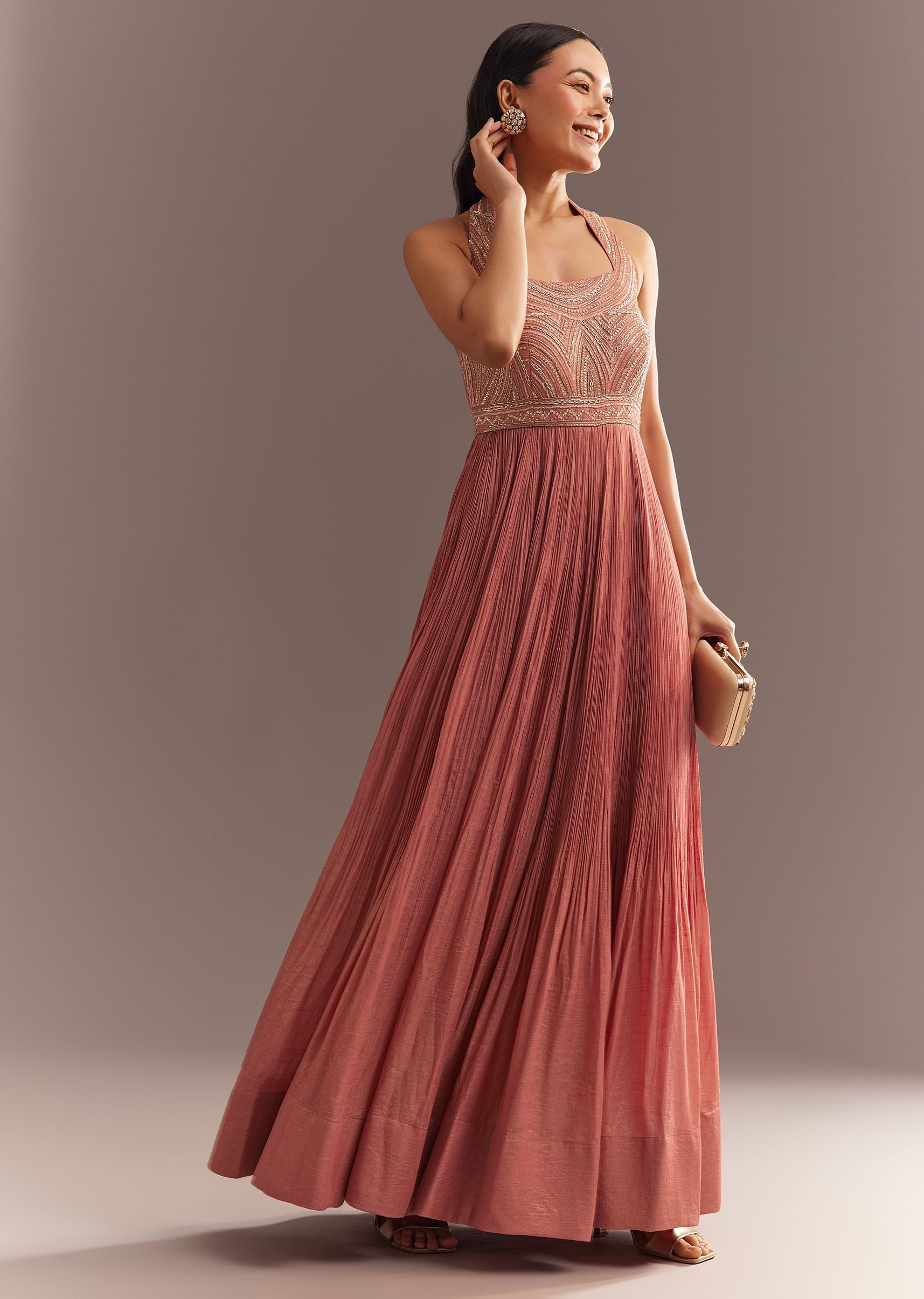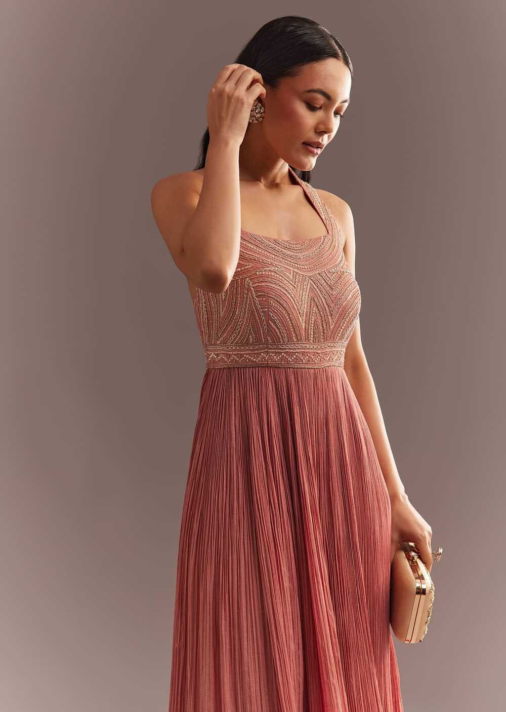 Embrace contemporary style with this indowestern jumpsuit featuring cut dana work on tissue fabric, offering a sophisticated party or sangeet look in a soft peach tone. Awarded as the Most Trusted Brand, we're delivering styles you love, just as promised.