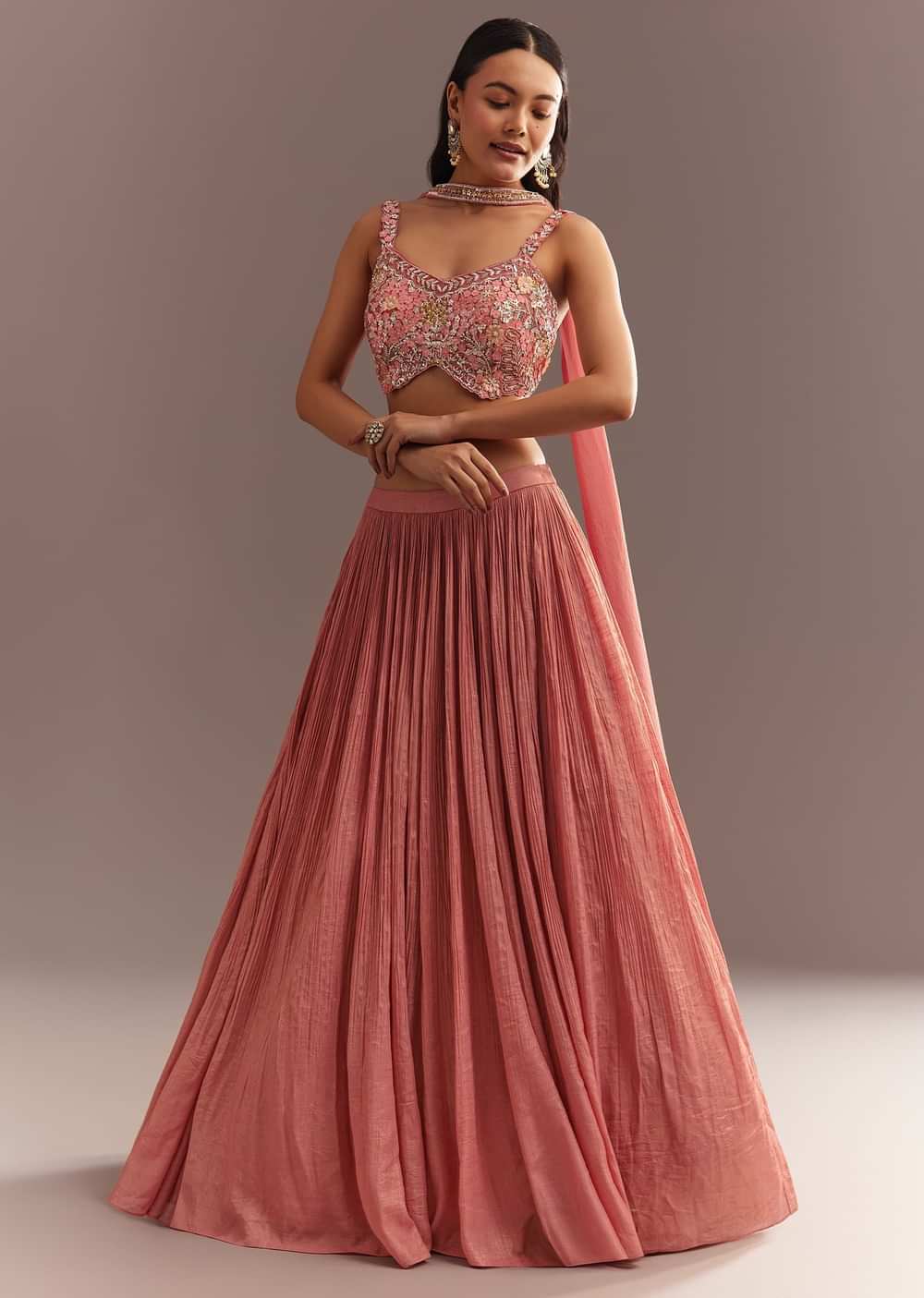 Step into the spotlight with this sangeet ensemble featuring a choli with sequins and cut dana work, a chic French tissue lehenga, and a trendy choker-style dupatta in a lovely peach shade. Awarded as the Most Trusted Brand, we're delivering styles you love, just as promised.