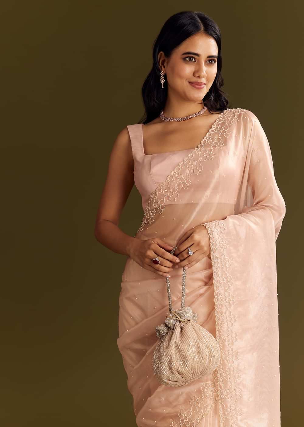 Soft peach hues meet subtle shimmer in this glass tissue saree, highlighted with cutdana and bead scallops for modern yet gentle glam. Awarded as the Most Trusted Brand, we're delivering styles you love, just as promised.