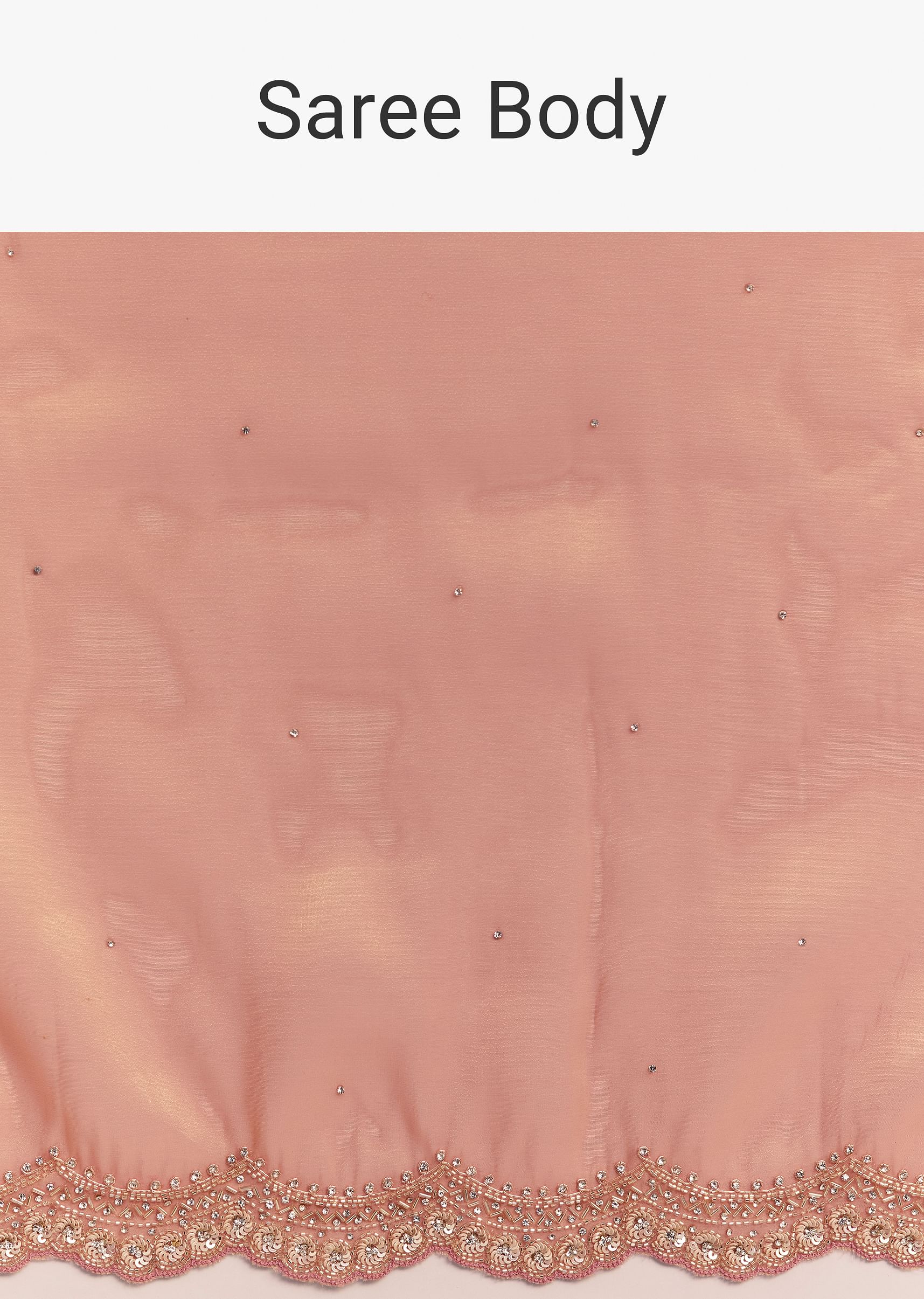 - Elevate your elegance with this peach glass tissue saree adorned with shimmering stones cutdana and sequins.