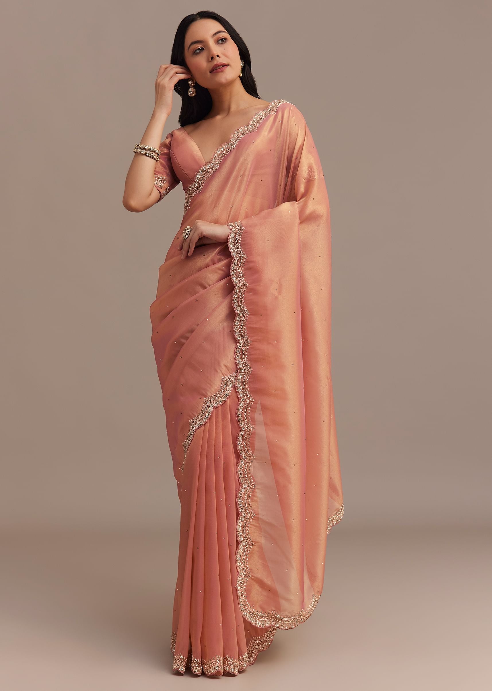 Peach Glass Tissue Saree With Stone And Cutdana Embroidery