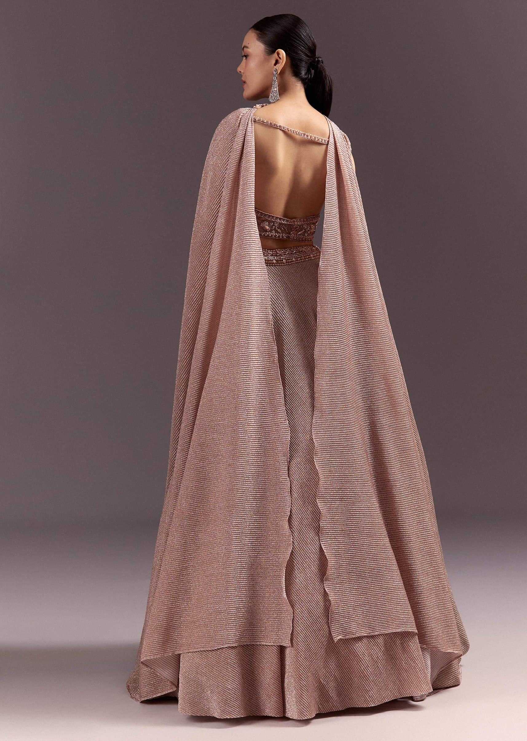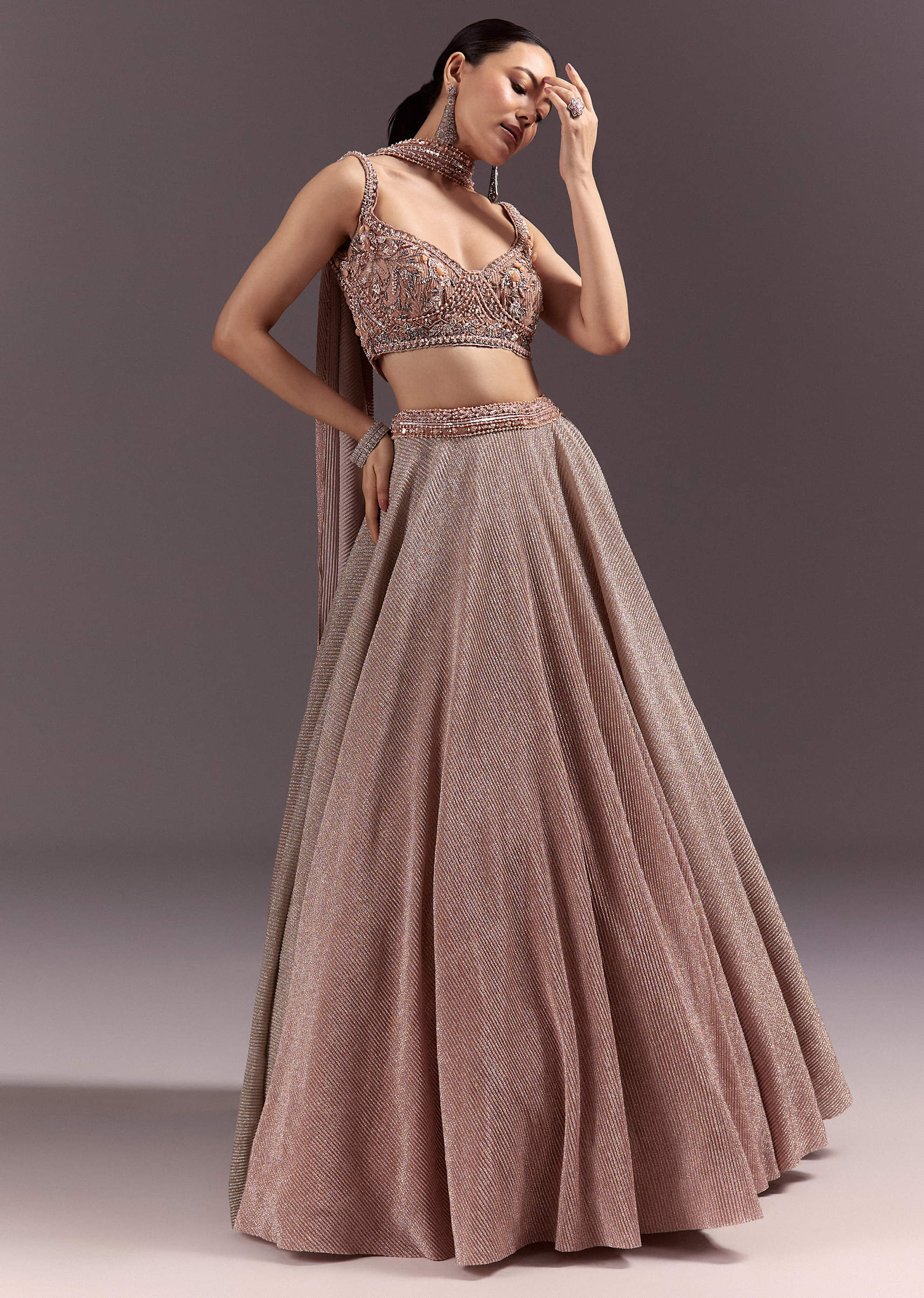 A peach and gold lehenga with double circular flair. Cut dana, sequins, and zardosi work make this dreamy and rich. The choker dupatta adds structure and elegance. Designed for weddings... More Product Details