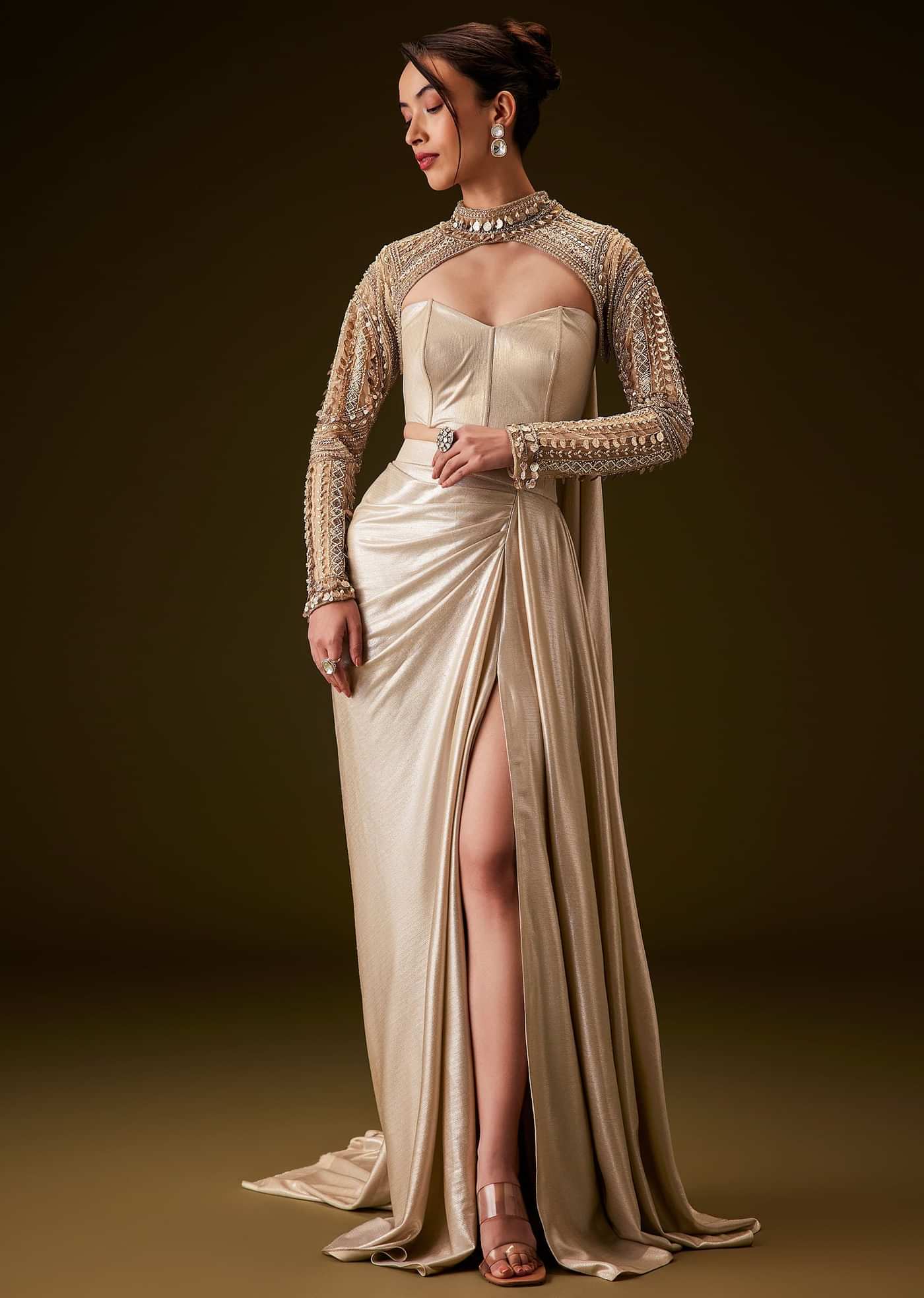 Bask In The Golden Glow Of Luxury With This Peach Shimmer Ensemble Where A Structured Blouse Meets A Highslit Draped Skirt Crowned With A Dramatic Handembroidered Cape. Adorned With Intricate... More Product Details